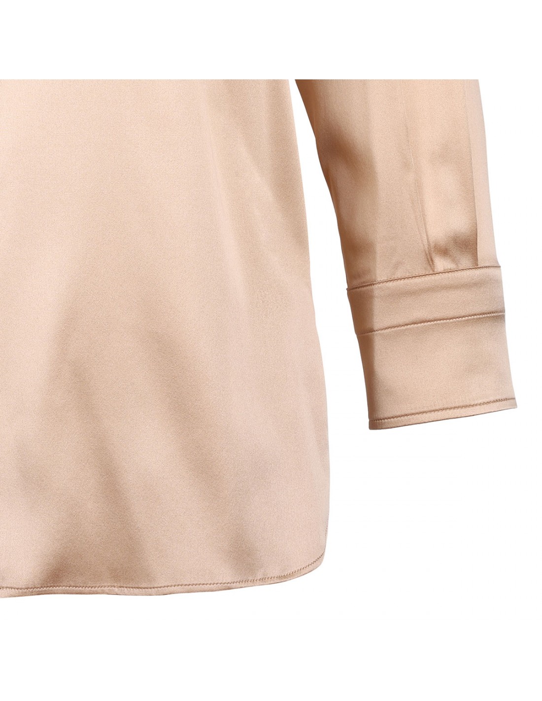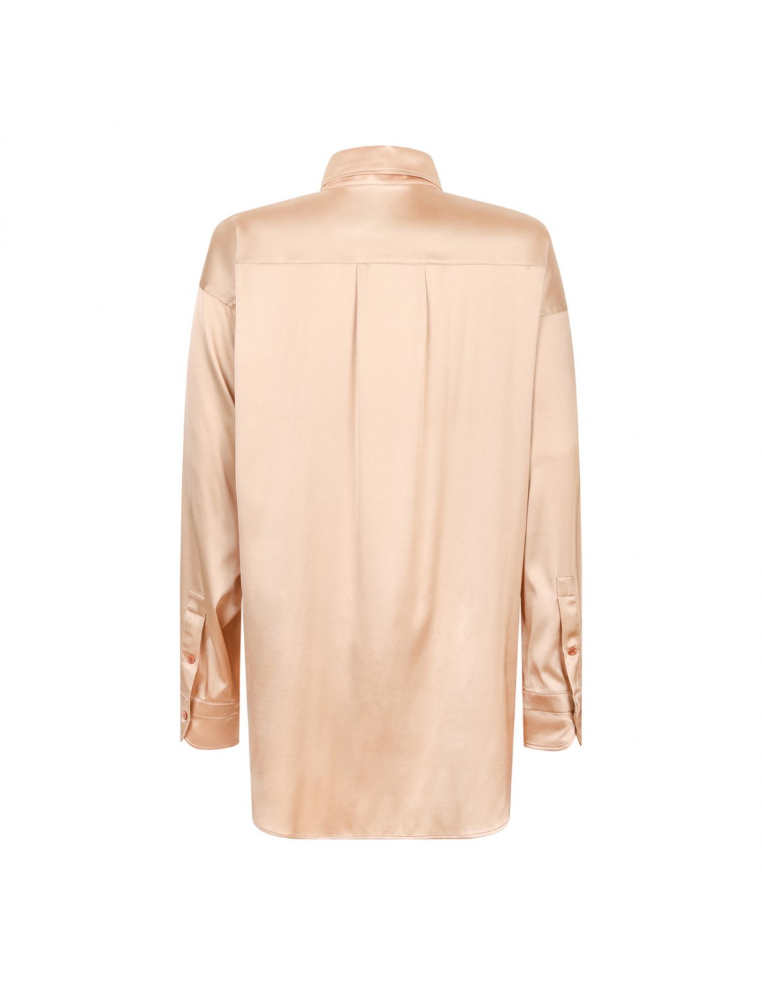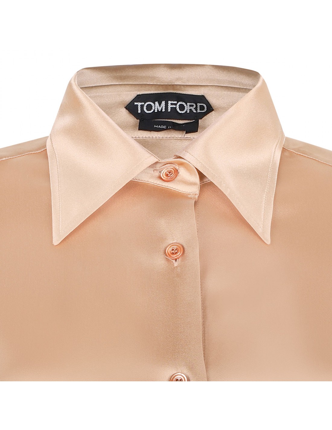 Pale beige stretch silk satin shirt from Tom Ford featuring relaxed fit, pointed toe, slightly dropped shoulders, long sleeves with buttoned cuffs, back yoke, tonal mother of pearl buttons fastening.