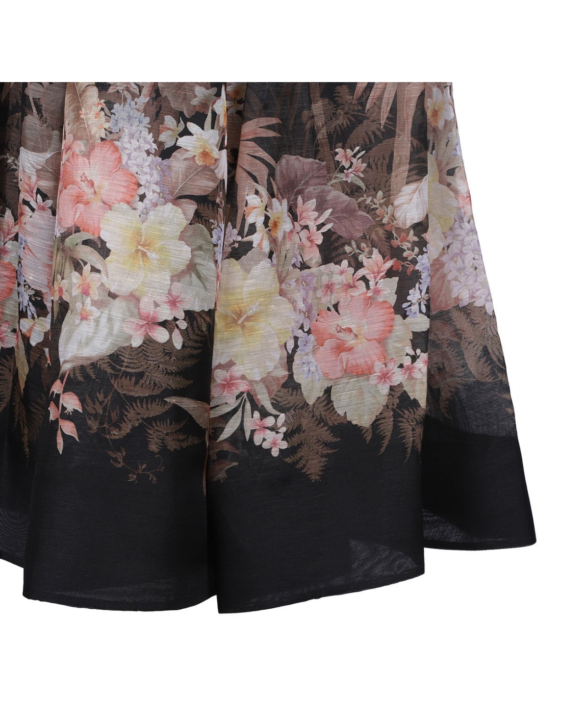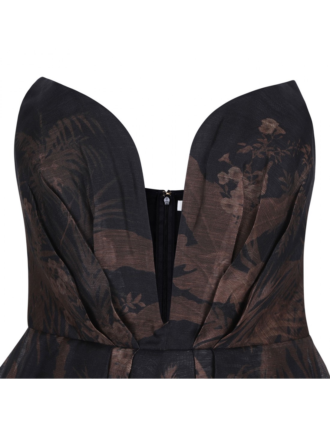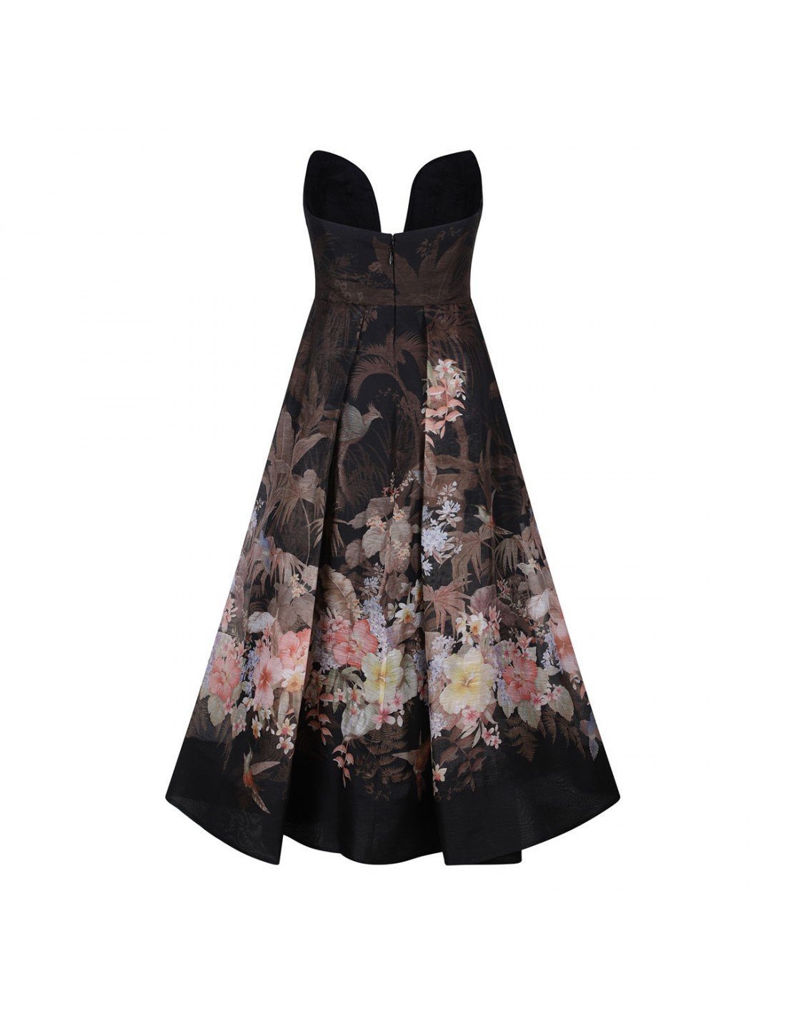 Black silk linen Illuminate draped midi dress from Zimmermann featuring contrasting tropical motif, strapless style, plunge neckline, side pockets, center back zip fastening, tucks on the bodice and skirt, voluminous skirt, boning along the bodice.