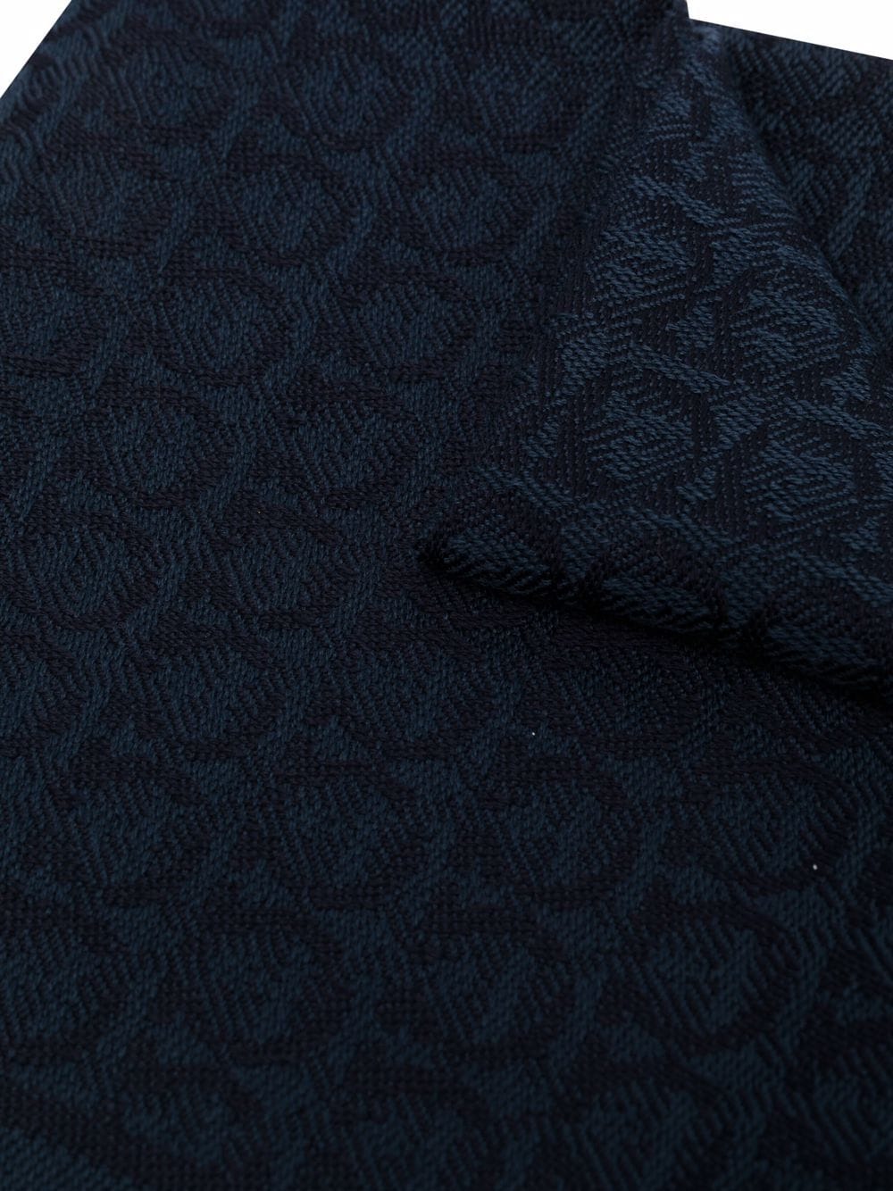 Midnight blue wool Gancini pattern frayed scarf from SALVATORE FERRAGAMO featuring Gancini print and frayed edge.