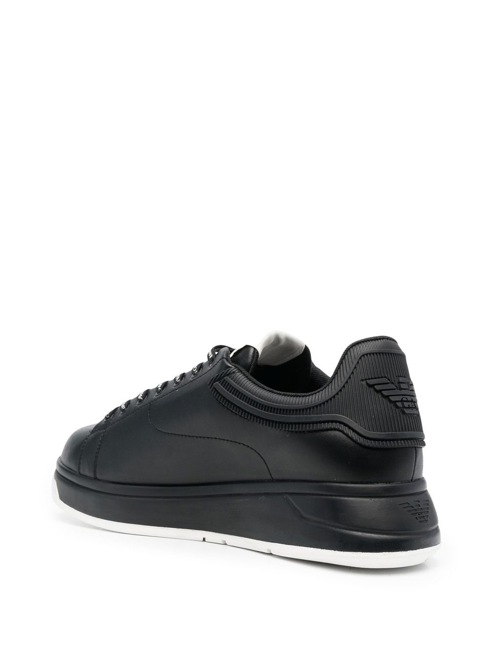 logo-laced low-top sneakers from EMPORIO ARMANI featuring black, calf leather, branded heel counter, logo patch at the tongue, logo-print laces, front lace-up fastening, round toe and flat rubber sole.