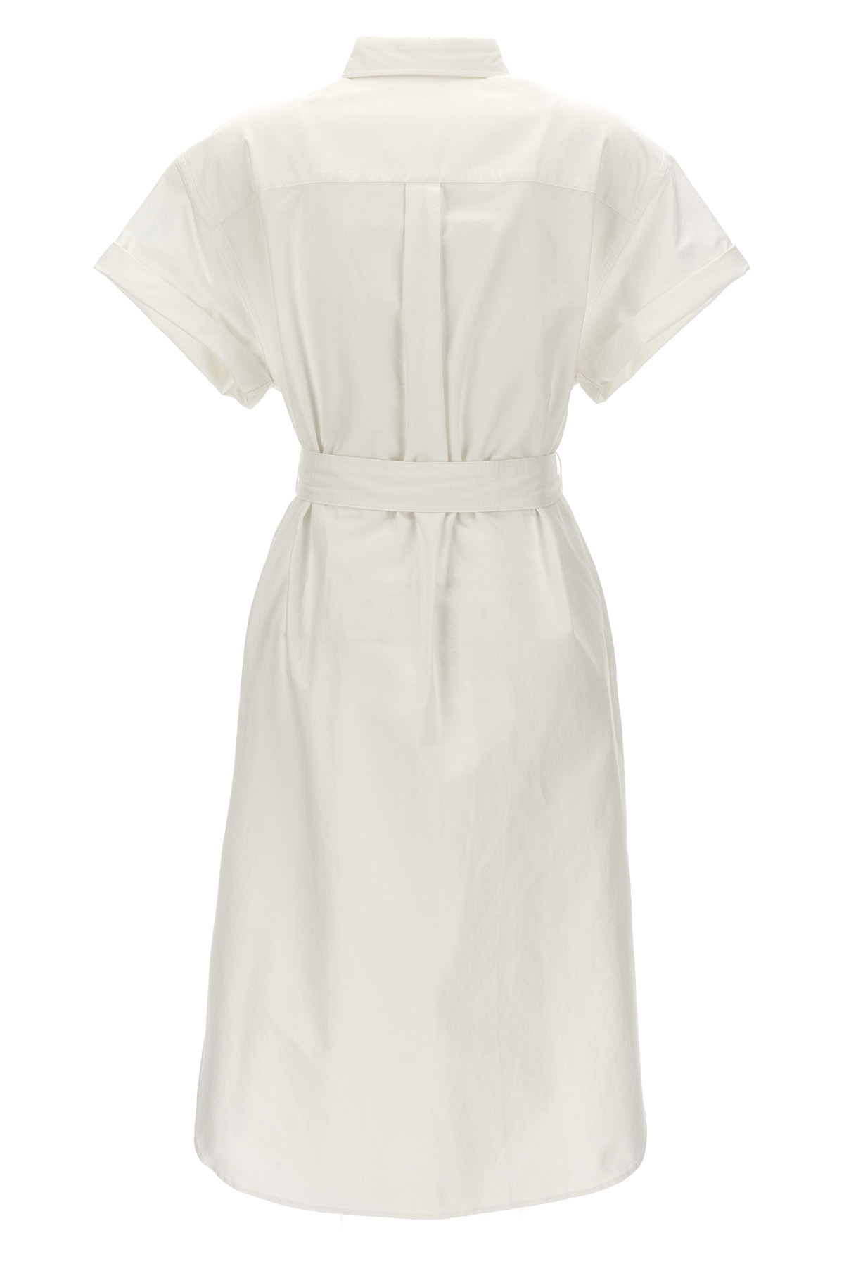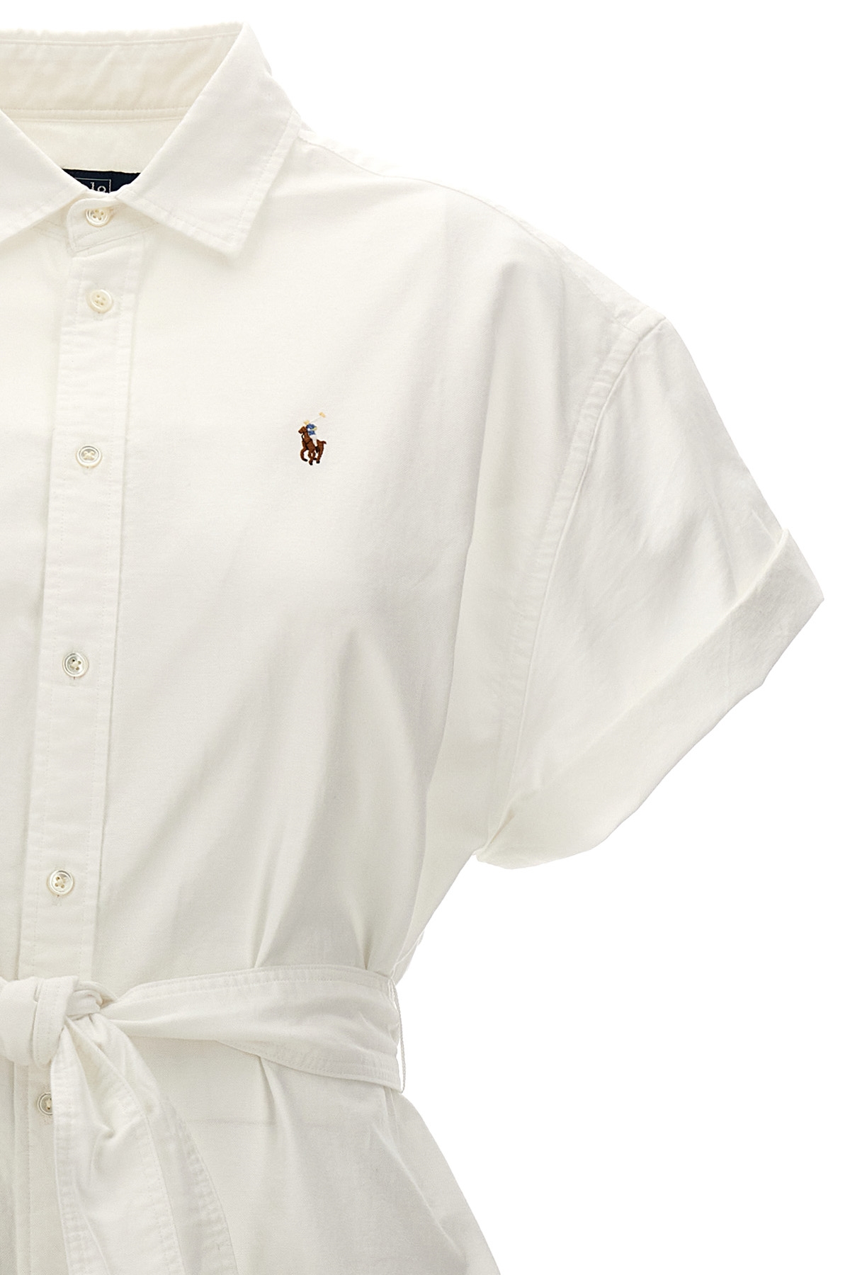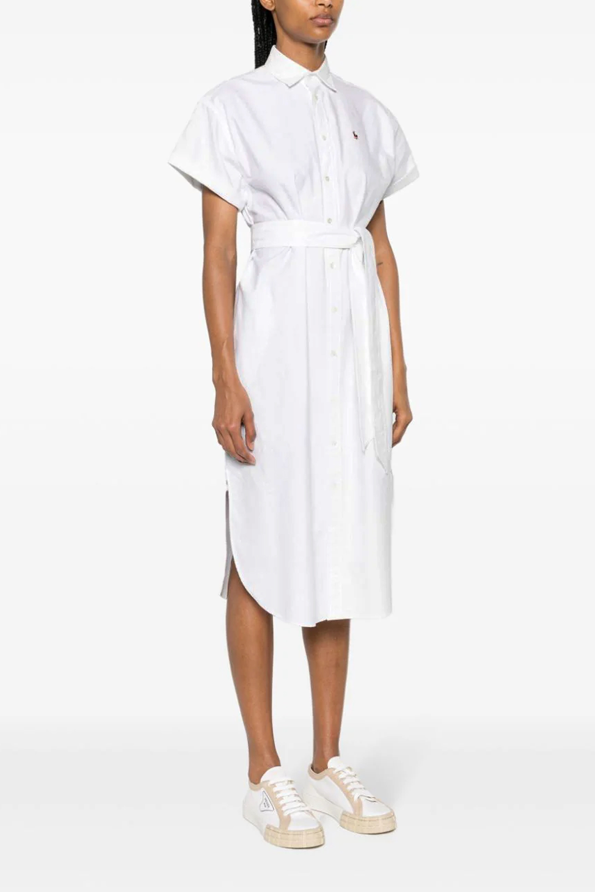 Oxford cotton shirt dress with contrast logo embroidery, front button closure, belt at the waist, side slits, and short sleeves with pockets.