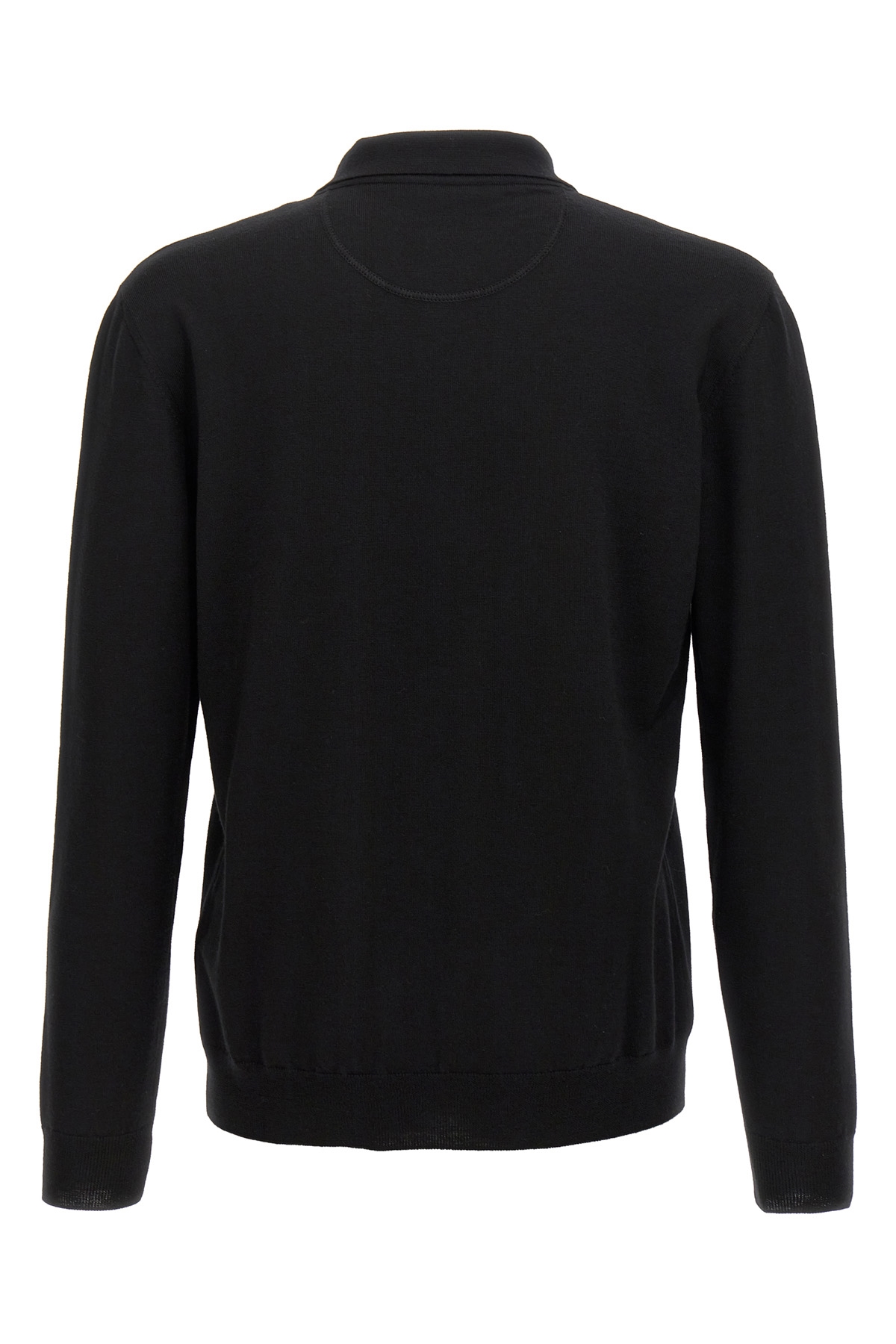 Wool knit polo shirt with front metal 'V Detail' applique, long cuffed sleeves.