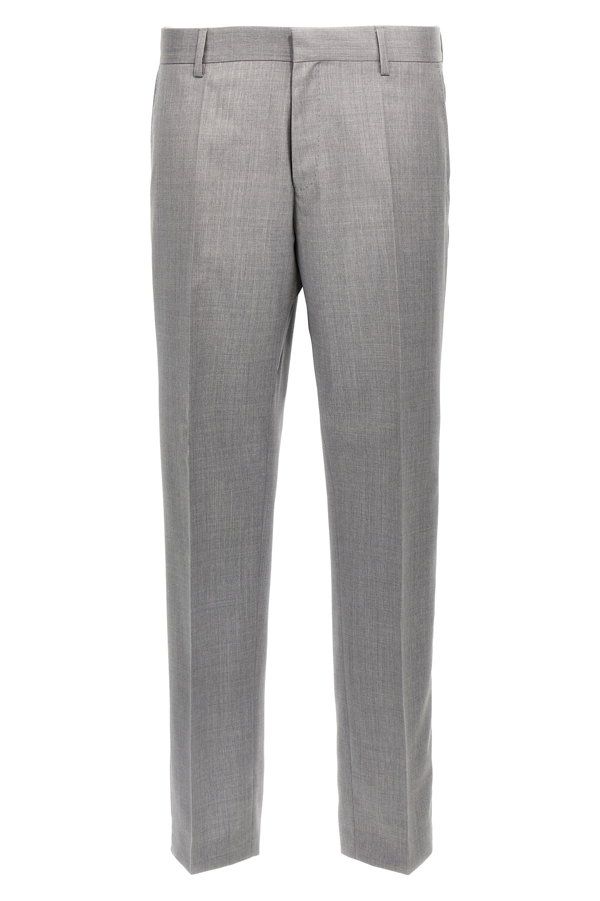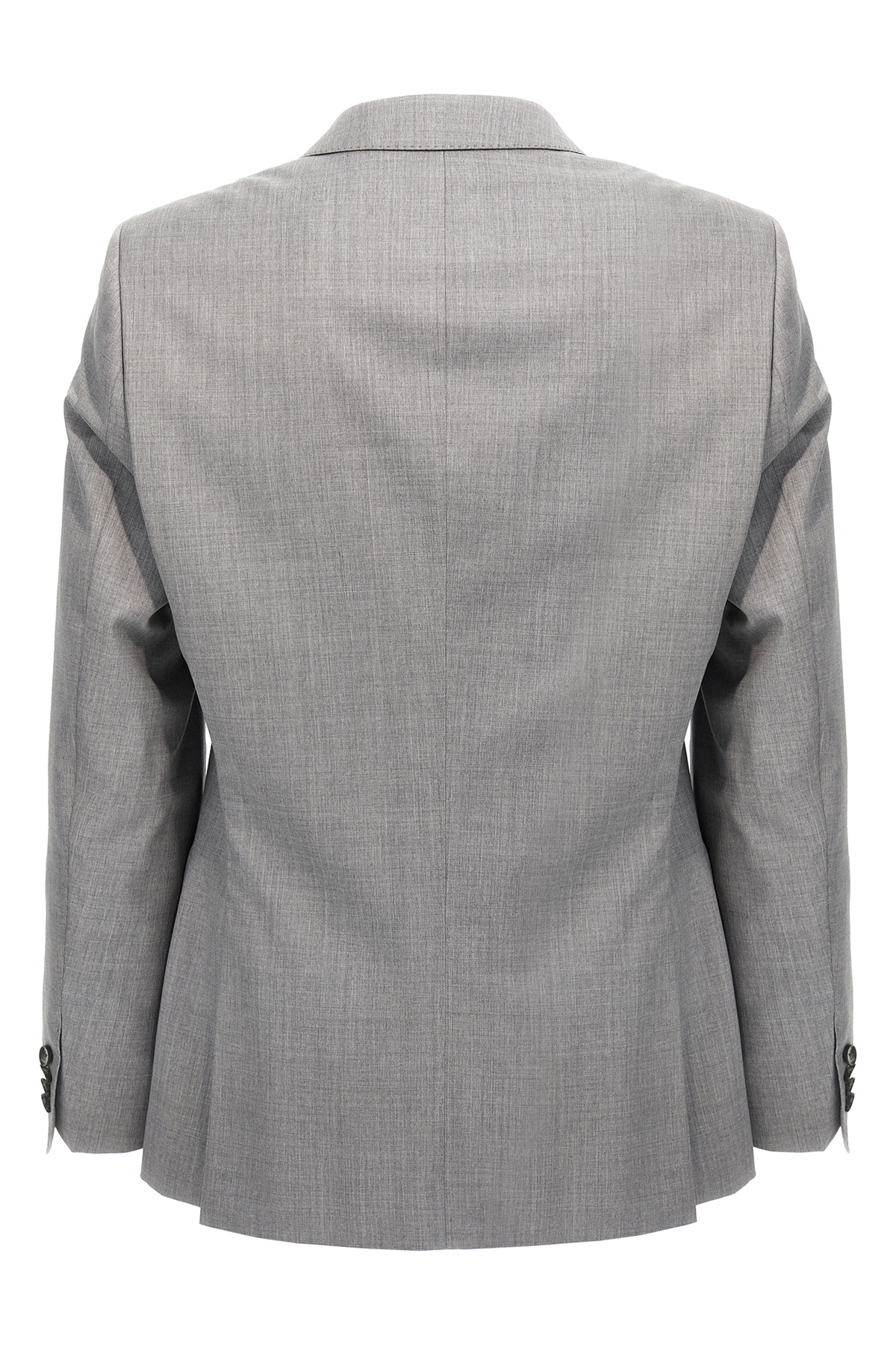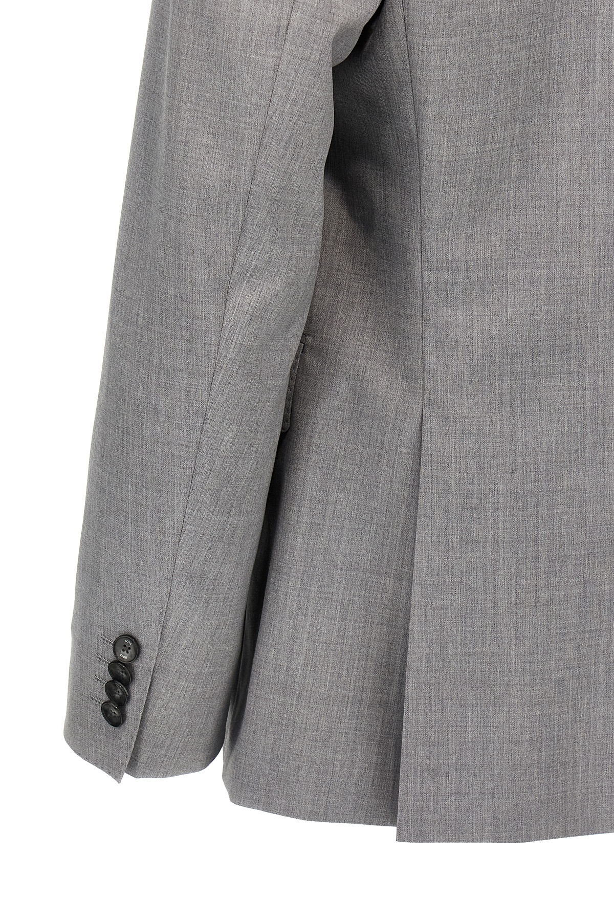 'Huge' wool suit consisting of single-breasted blazer with button closure, mirror lapels, pockets, long sleeves, back slits and trousers with stretched pleat, zip and hook closure, pockets.