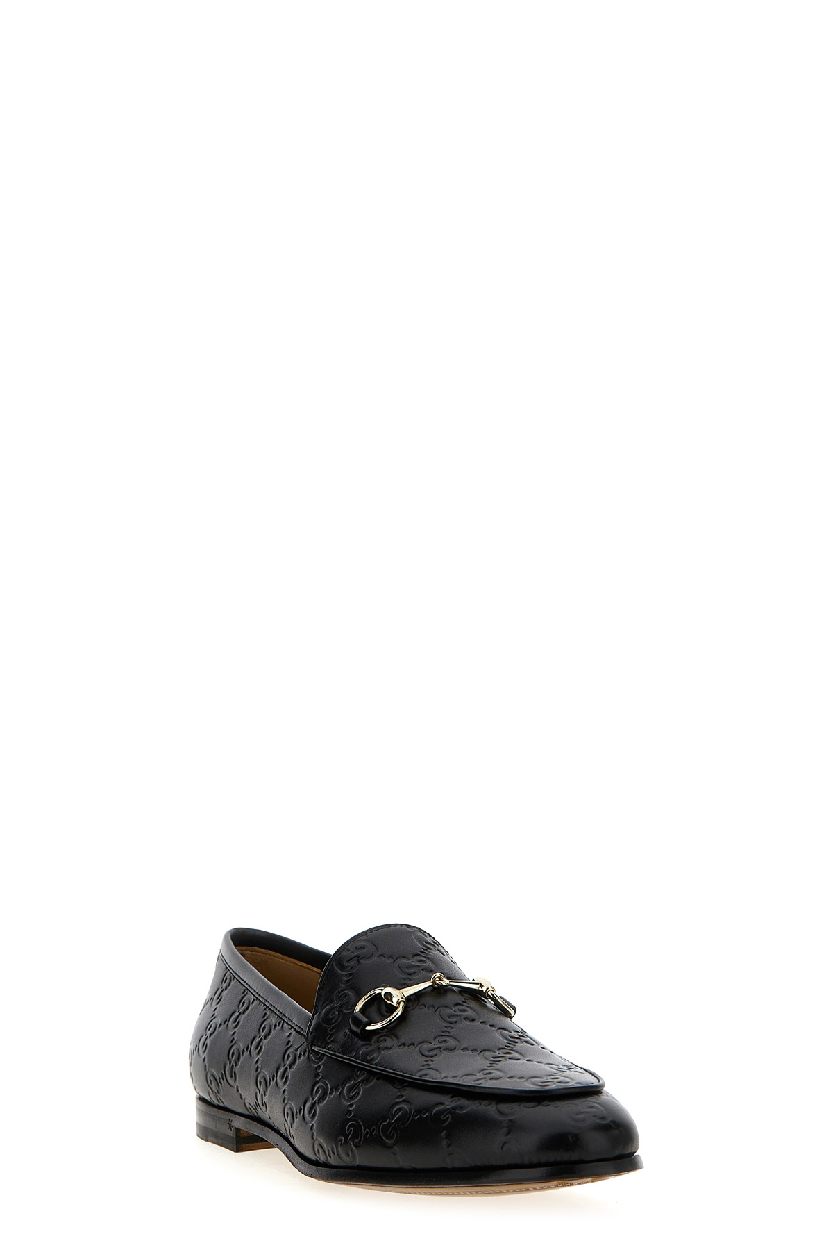 'Gucci Jordaan' GG leather loafers with front metal clamp and leather sole.