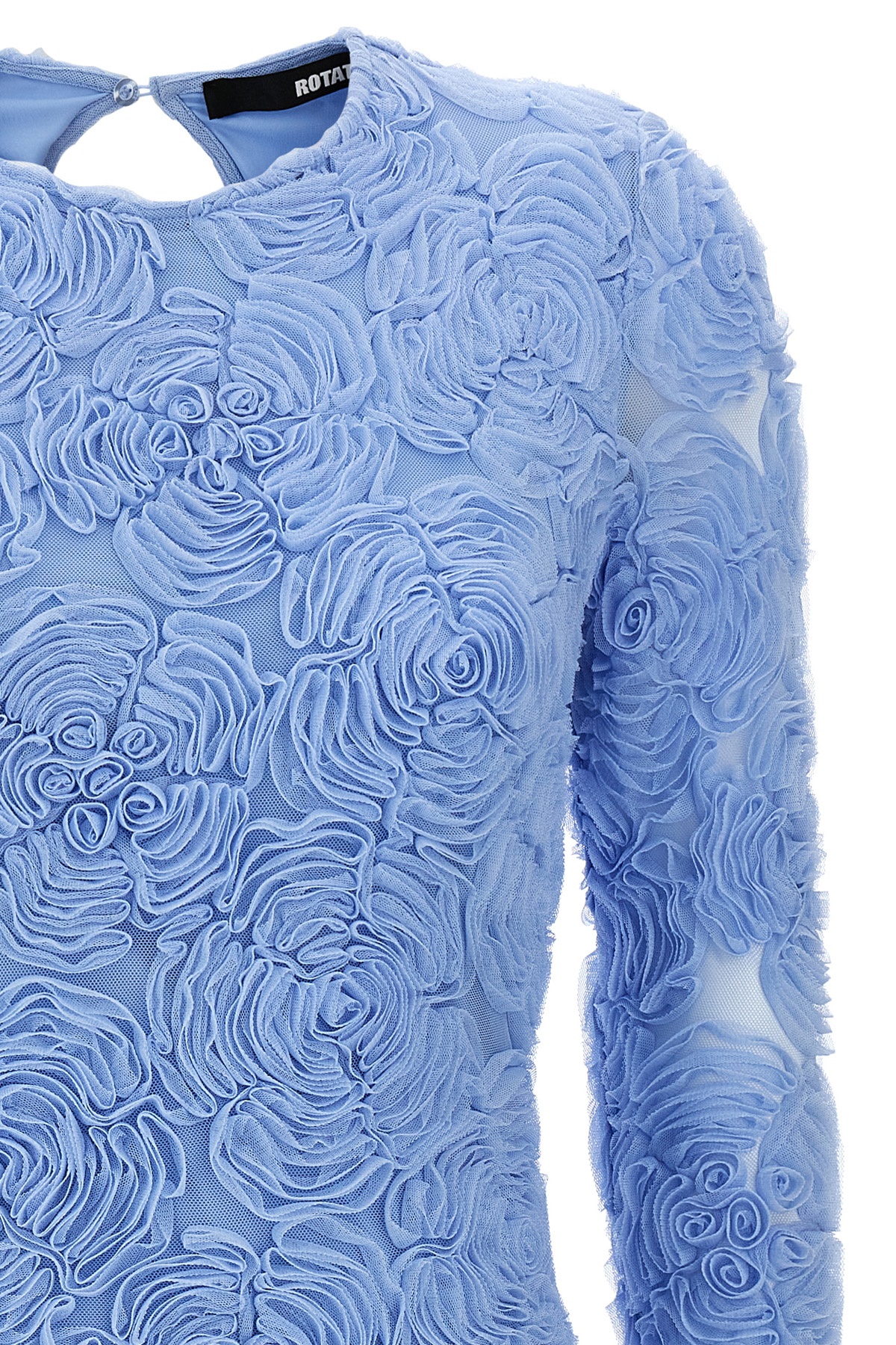 'Flower Mesh Mini' dress in semi-transparent fabric with tone-on-tone floral embroidery, back cut out detail with button closure, long sleeves with flounce on the hem, crew neck, side zip closure. SUSTAINABLE: Product made from recycled polyester.