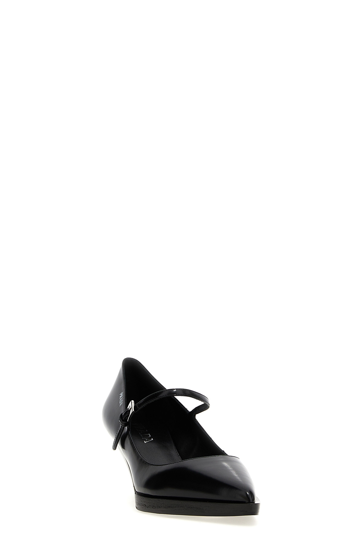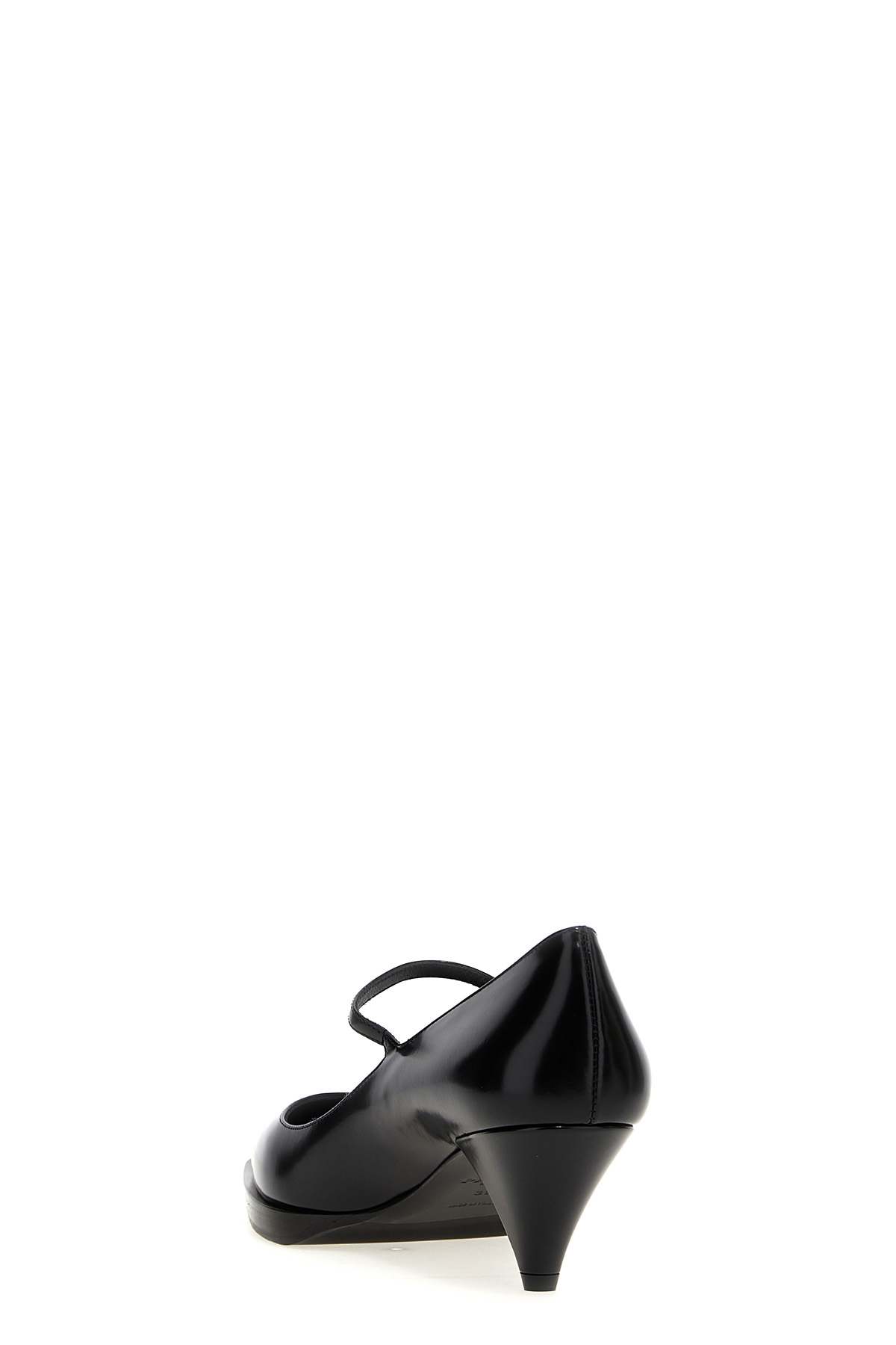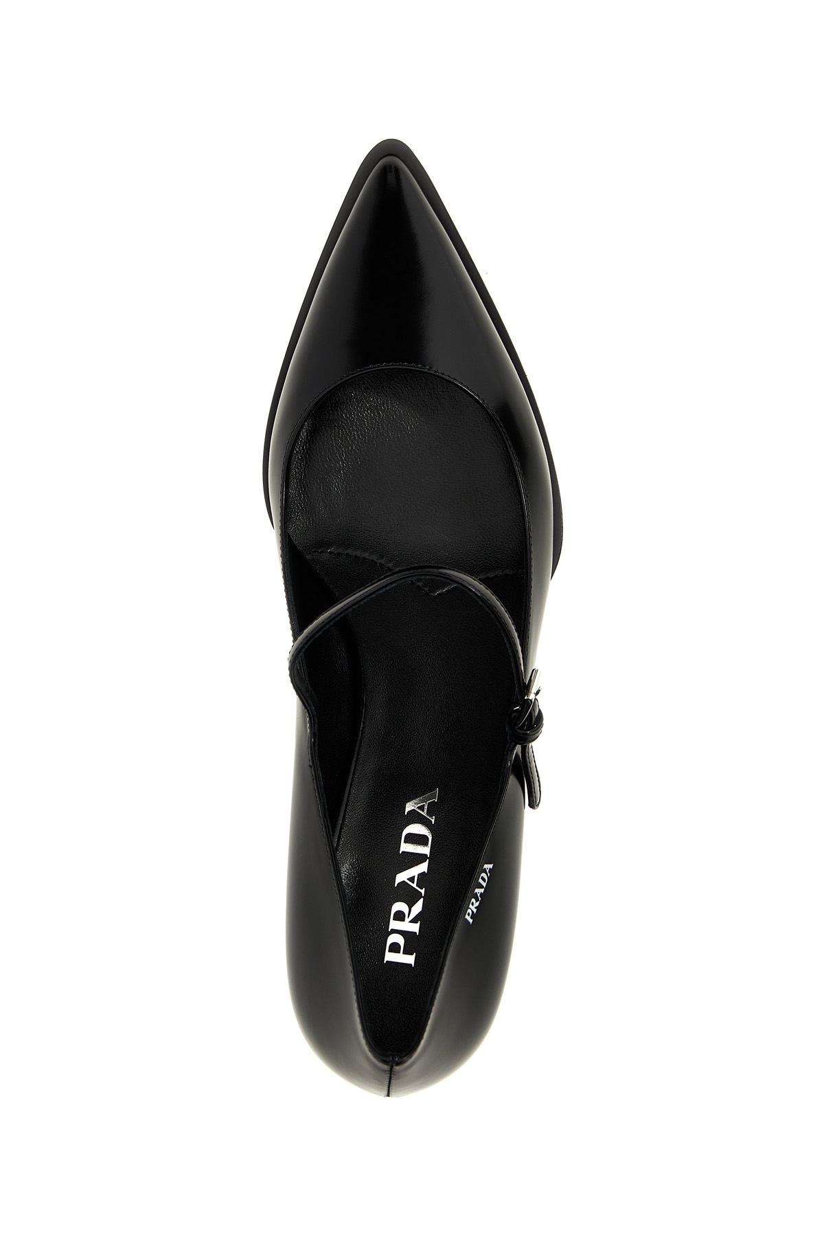 Brushed leather pumps, side logo, adjustable strap, heel.
