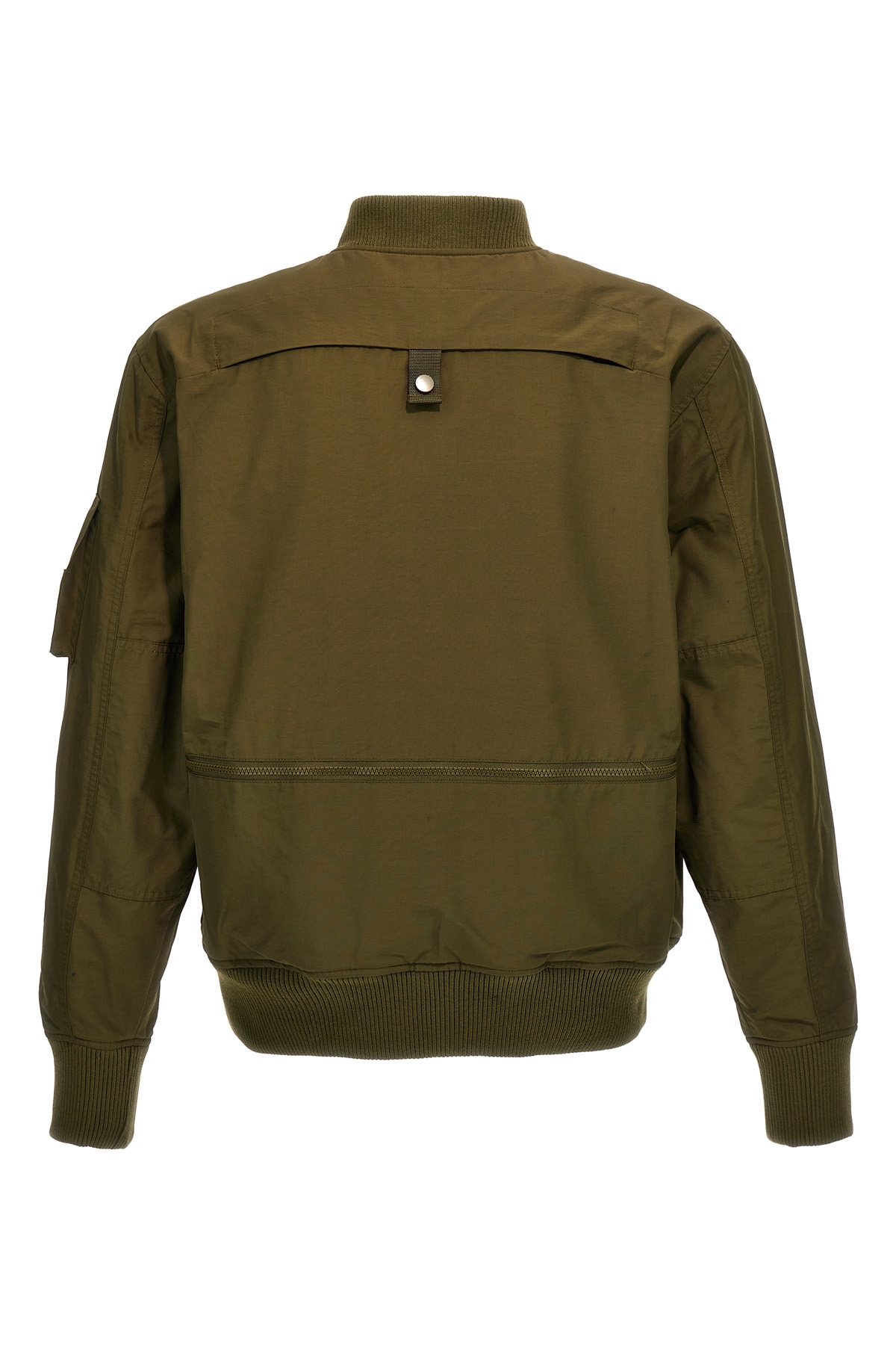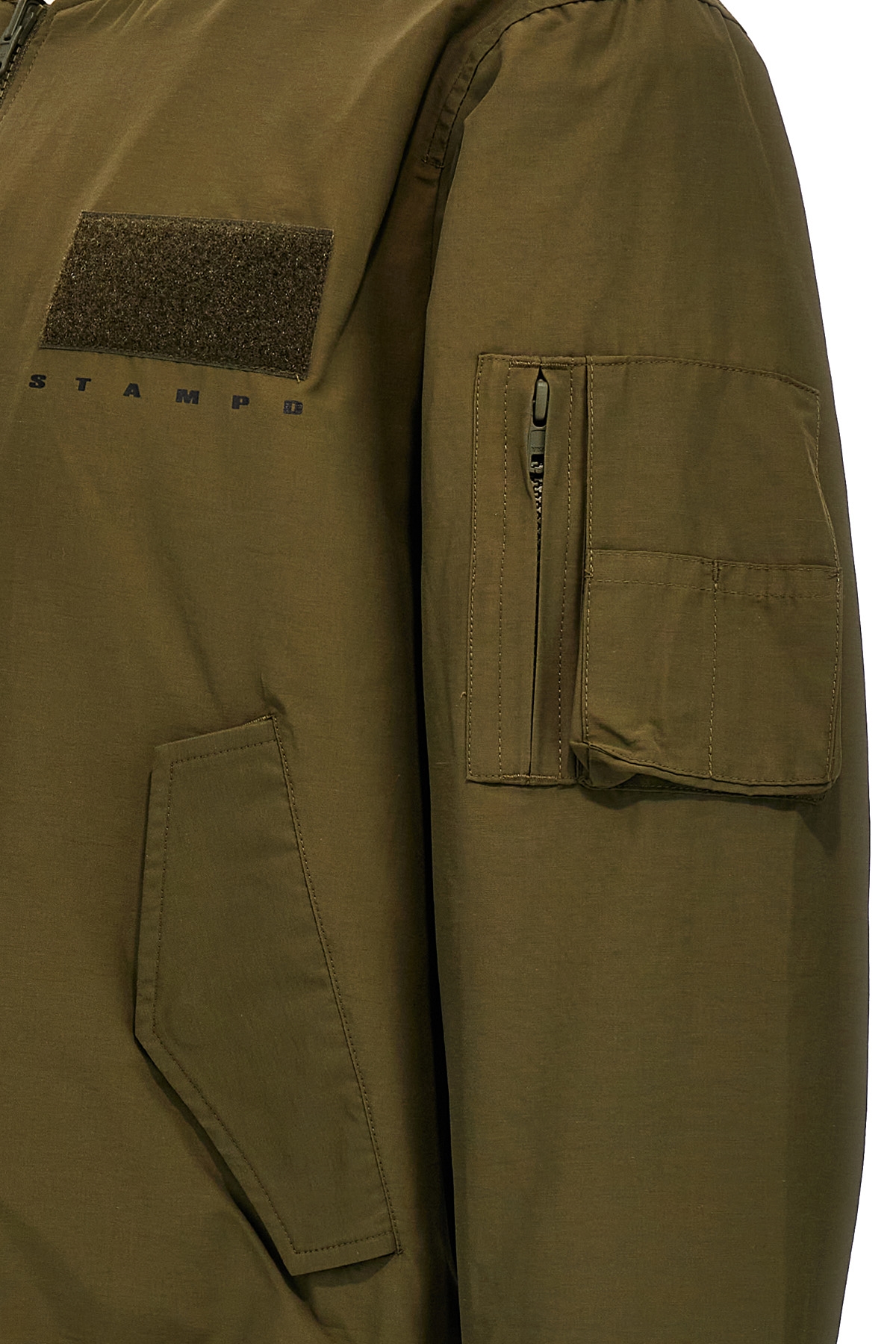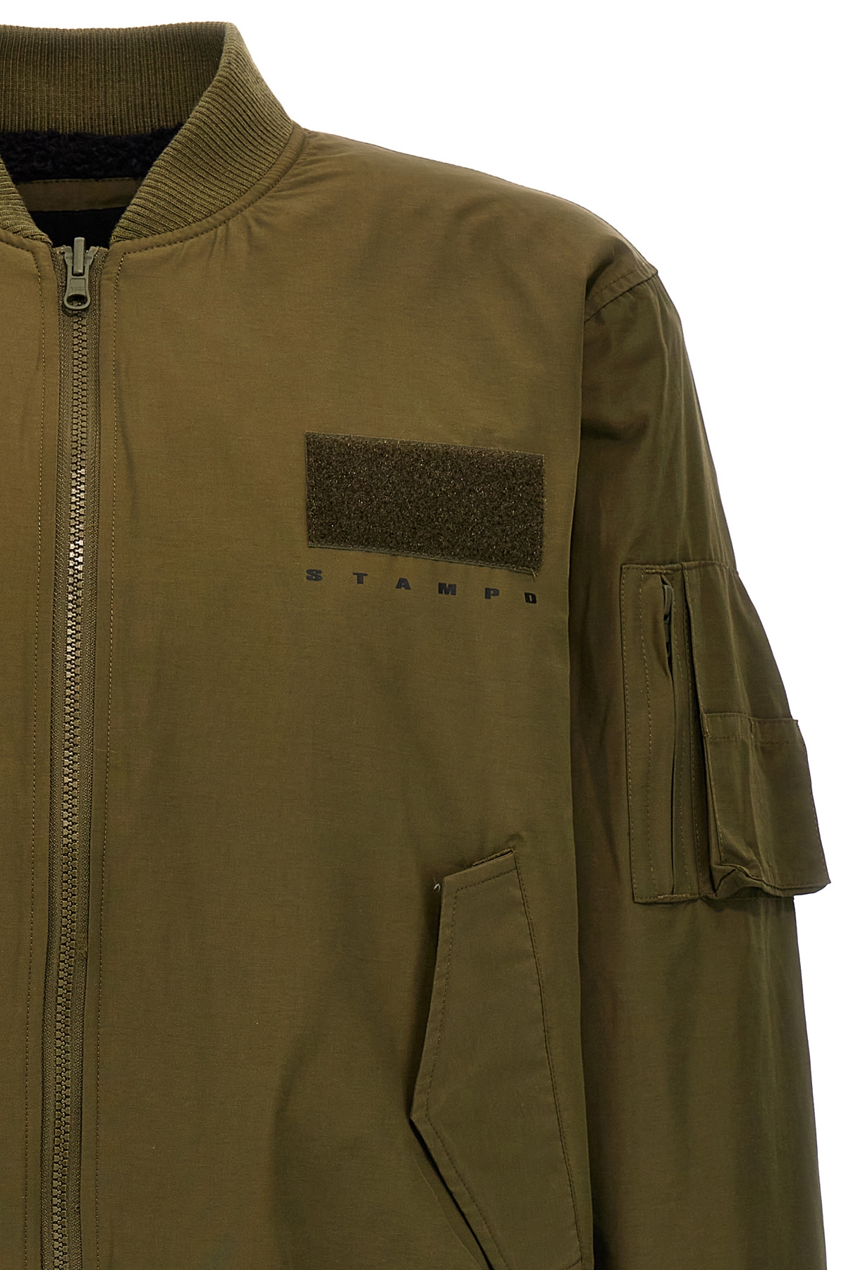 'Sherpa Lined' nylon bomber jacket with sherpa lined interior, front logo print, front pockets, two back zip pockets, zip closure, long sleeves with knitted cuffs.