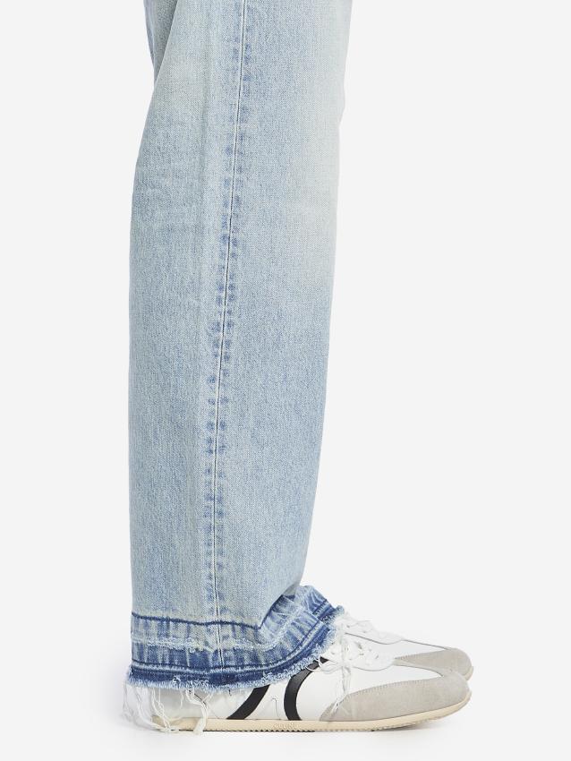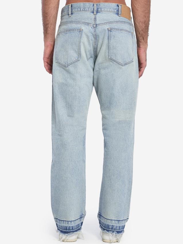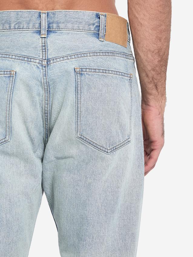 Straight-leg jeans in light blue cotton denim. They feature a button closure, belt loops, five pockets, straight legs, and frayed hems.The model is