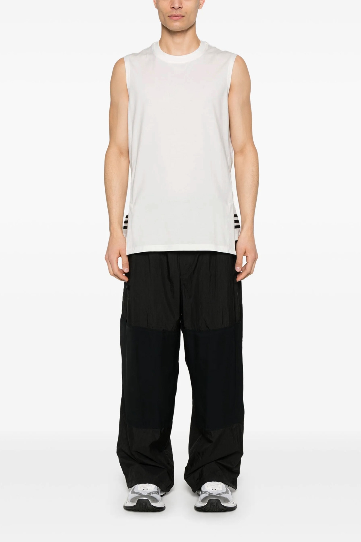 Cotton top, crew neck, asymmetrical hem, side slits with contrast inserts, tone-on-tone logo print at the back.