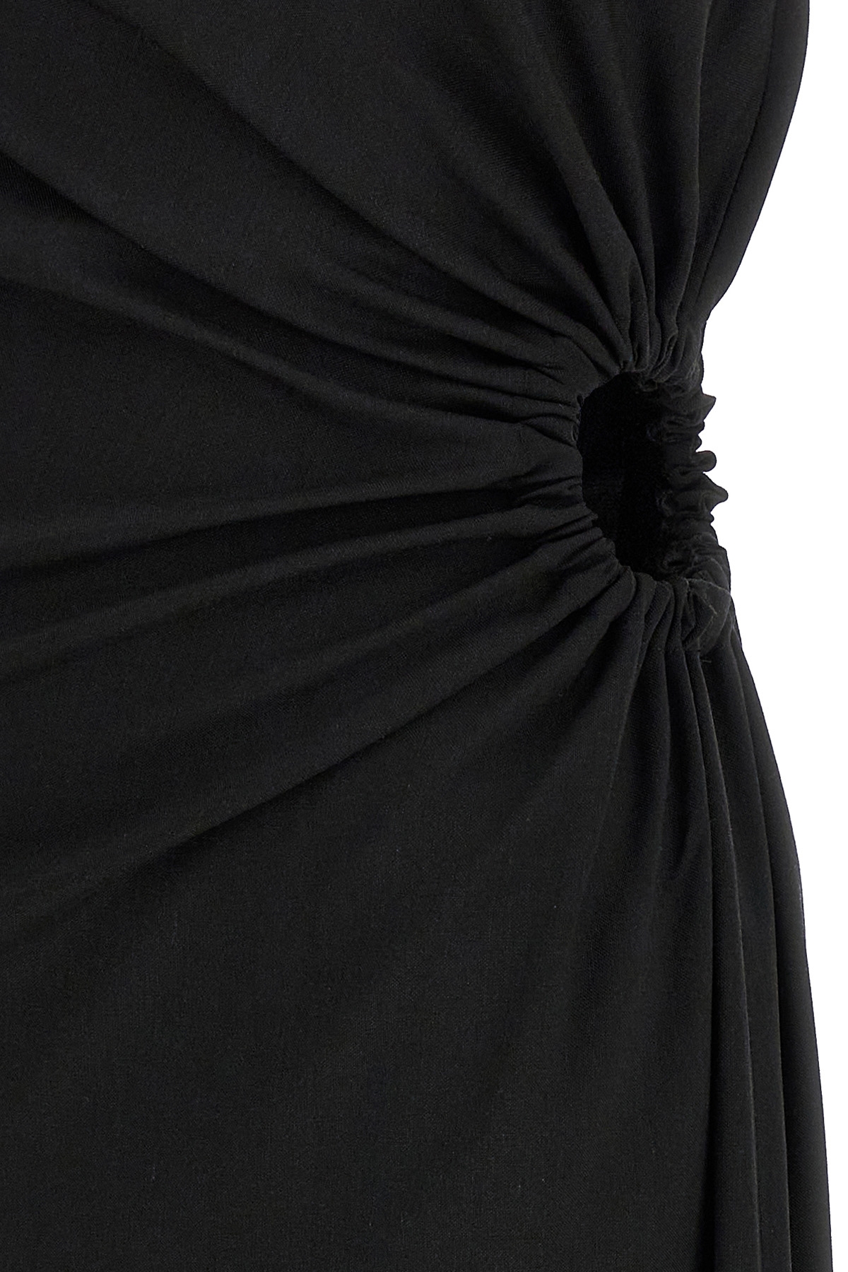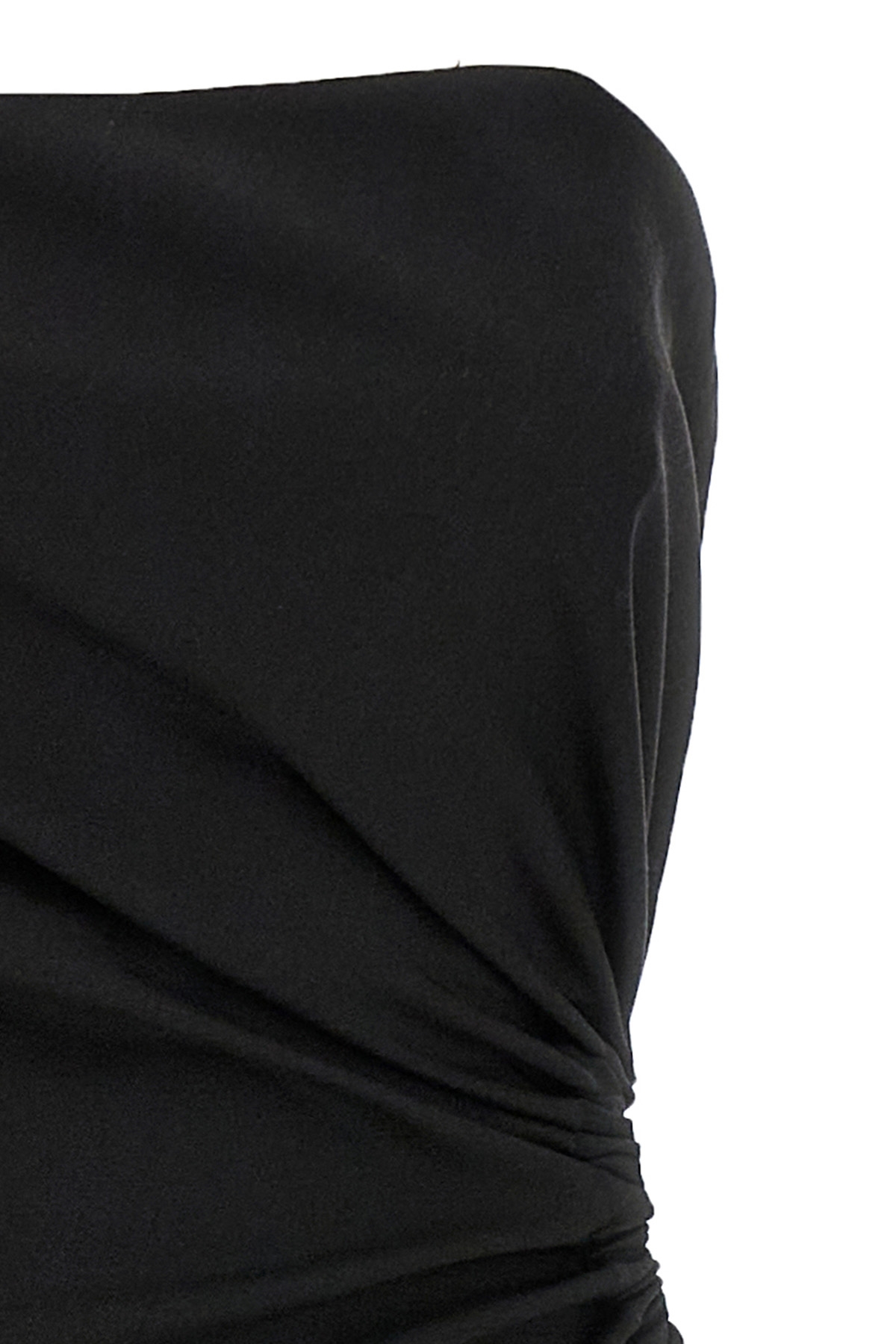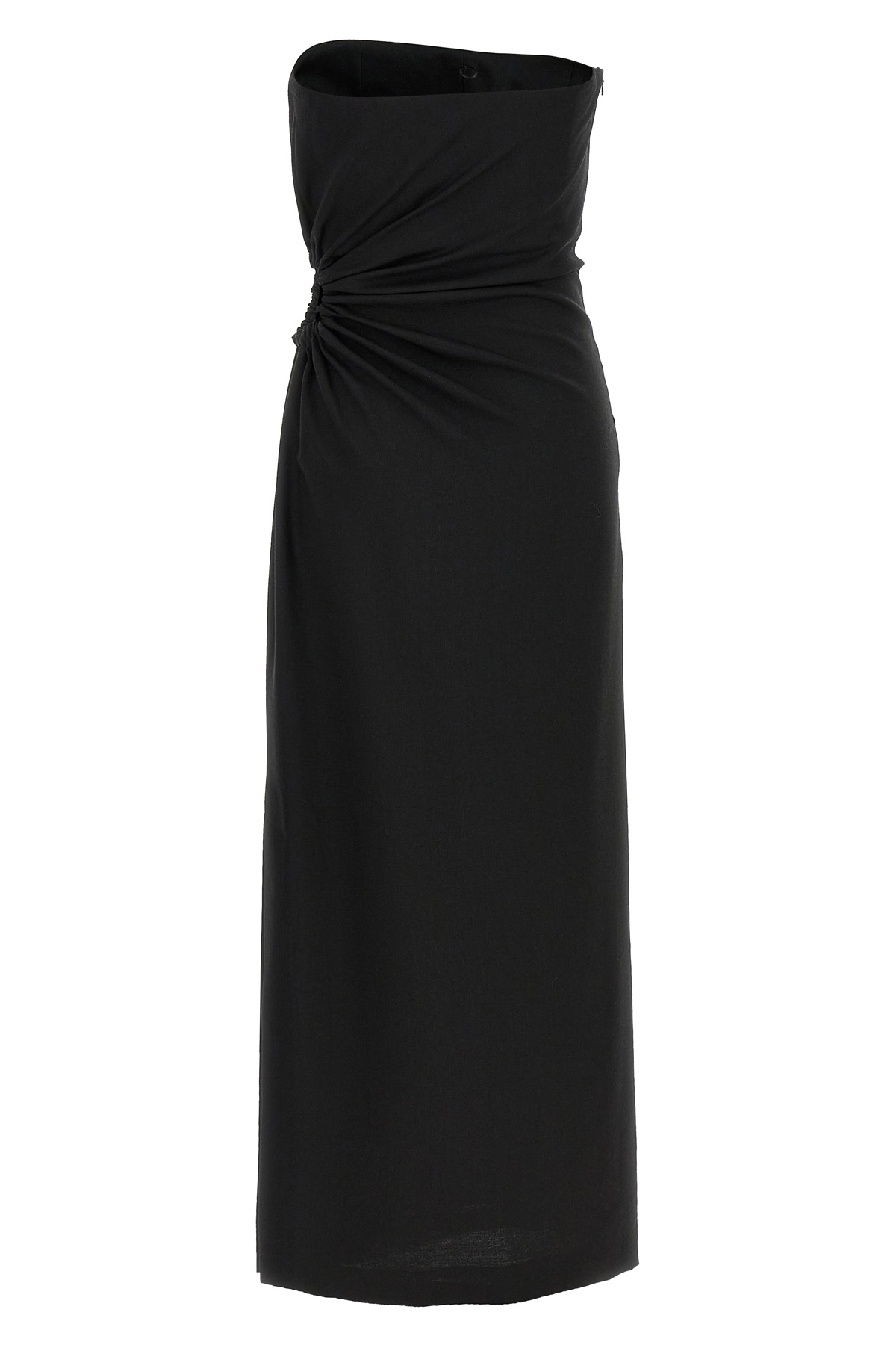 'Silva' long dress in wool, mohair and silk canvas, off-the-shoulder bustier model, elastic cut-out detail curled and draped on the left side, split and side zip closure.