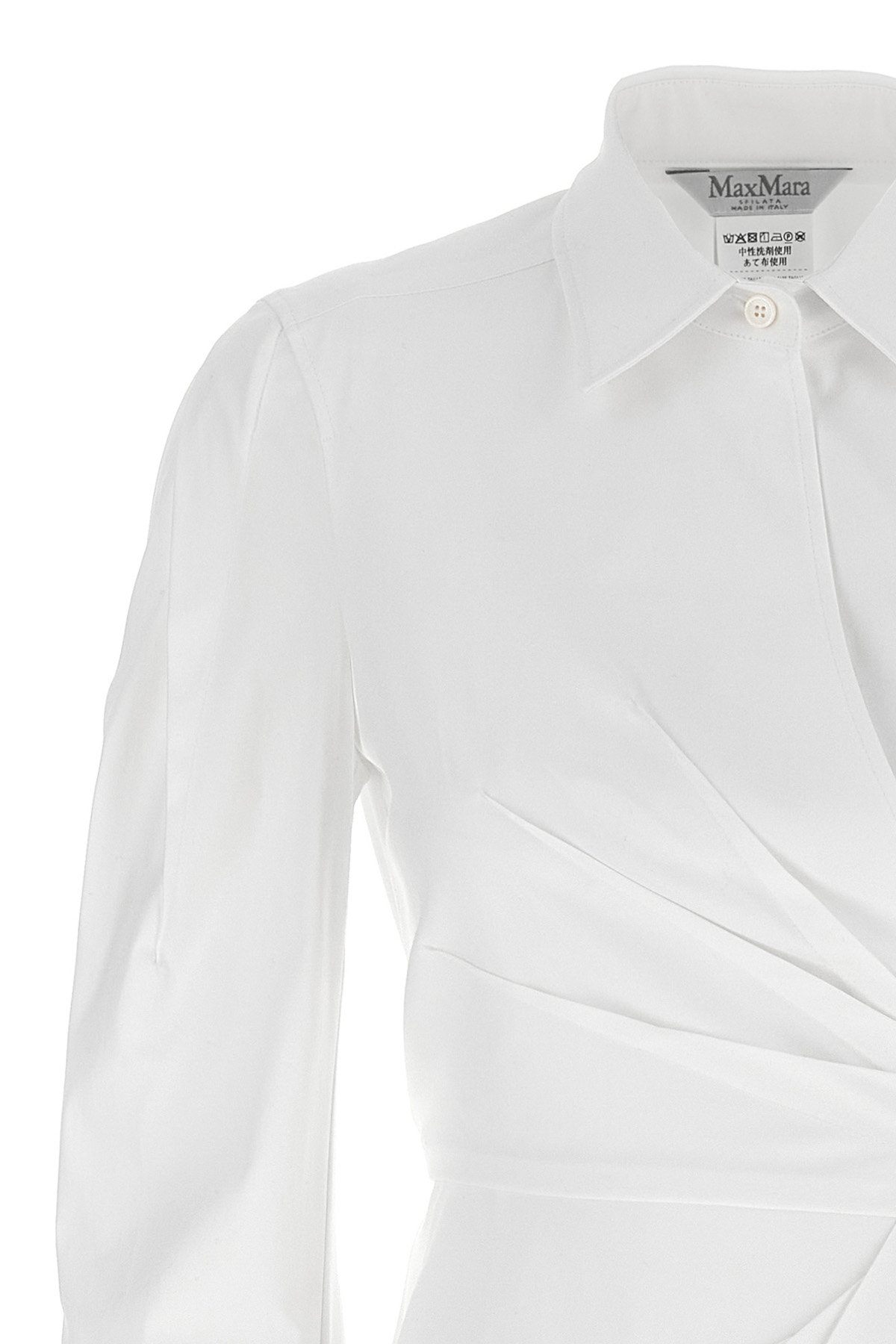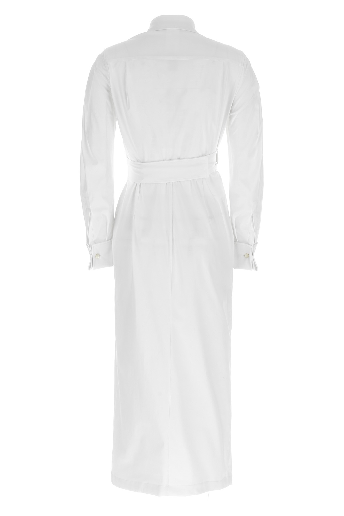 Long 'Balzac' dress in stretch cotton twill, shirt model with wallet closure with asymmetrical pleats sewn at the waist and sash to be fastened with snap buttons on the back, long sleeves with pleat pattern sewn on the shoulder, high cuffs and cufflink button.