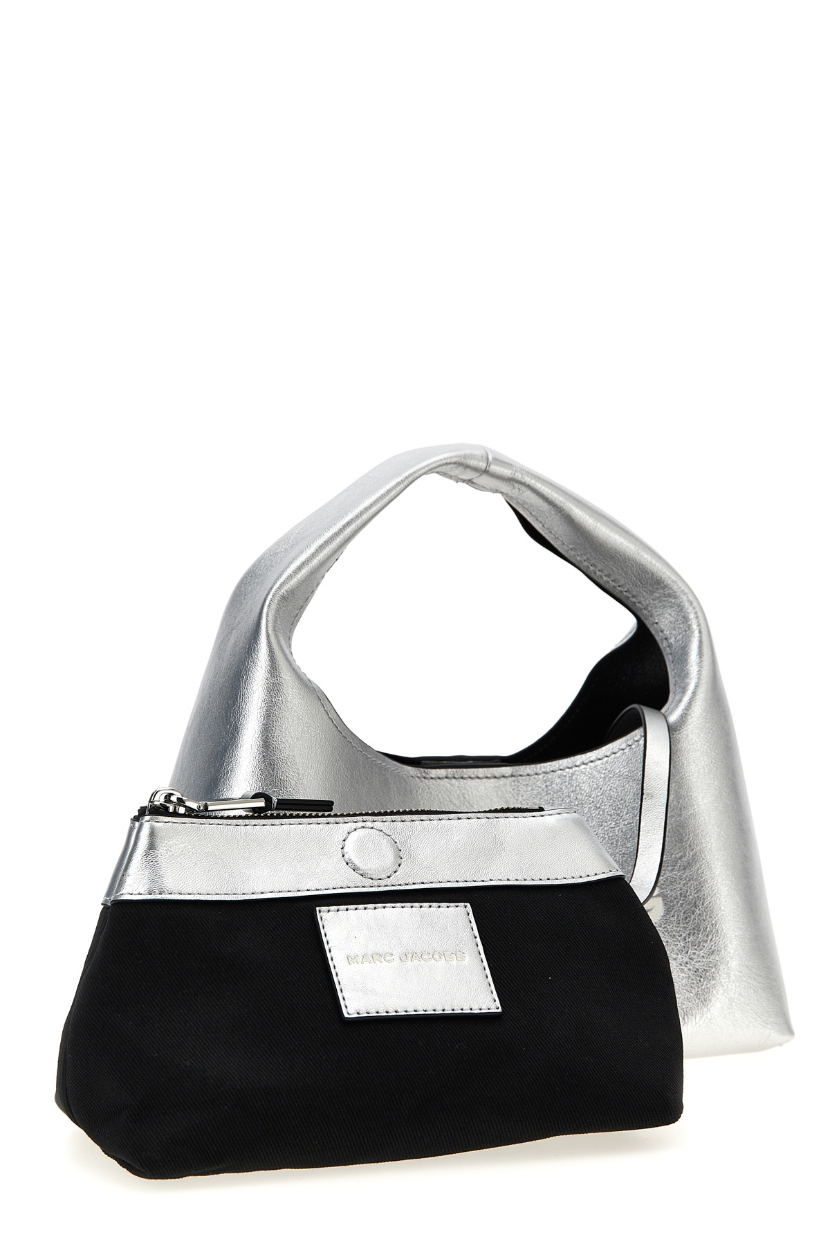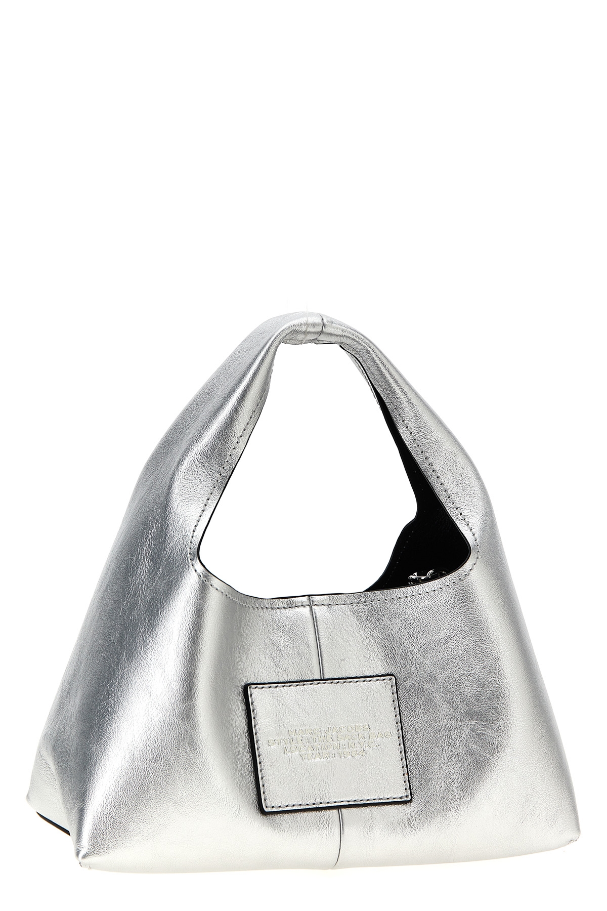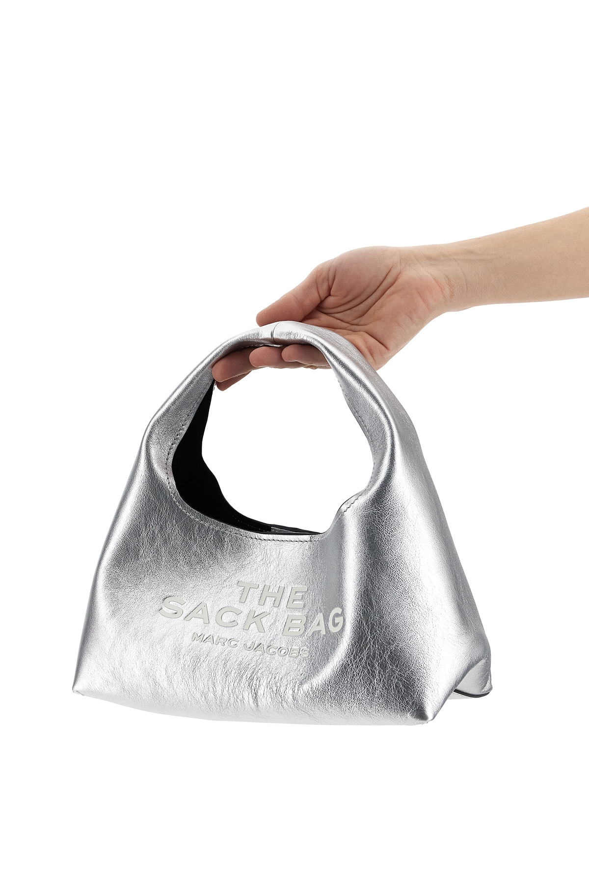 'The Metallic Leather Mini Sack Bag' metallic leather handbag with front embossed logo, fixed handle, magnetic closure, black canvas clutch bag and removable matching leather.