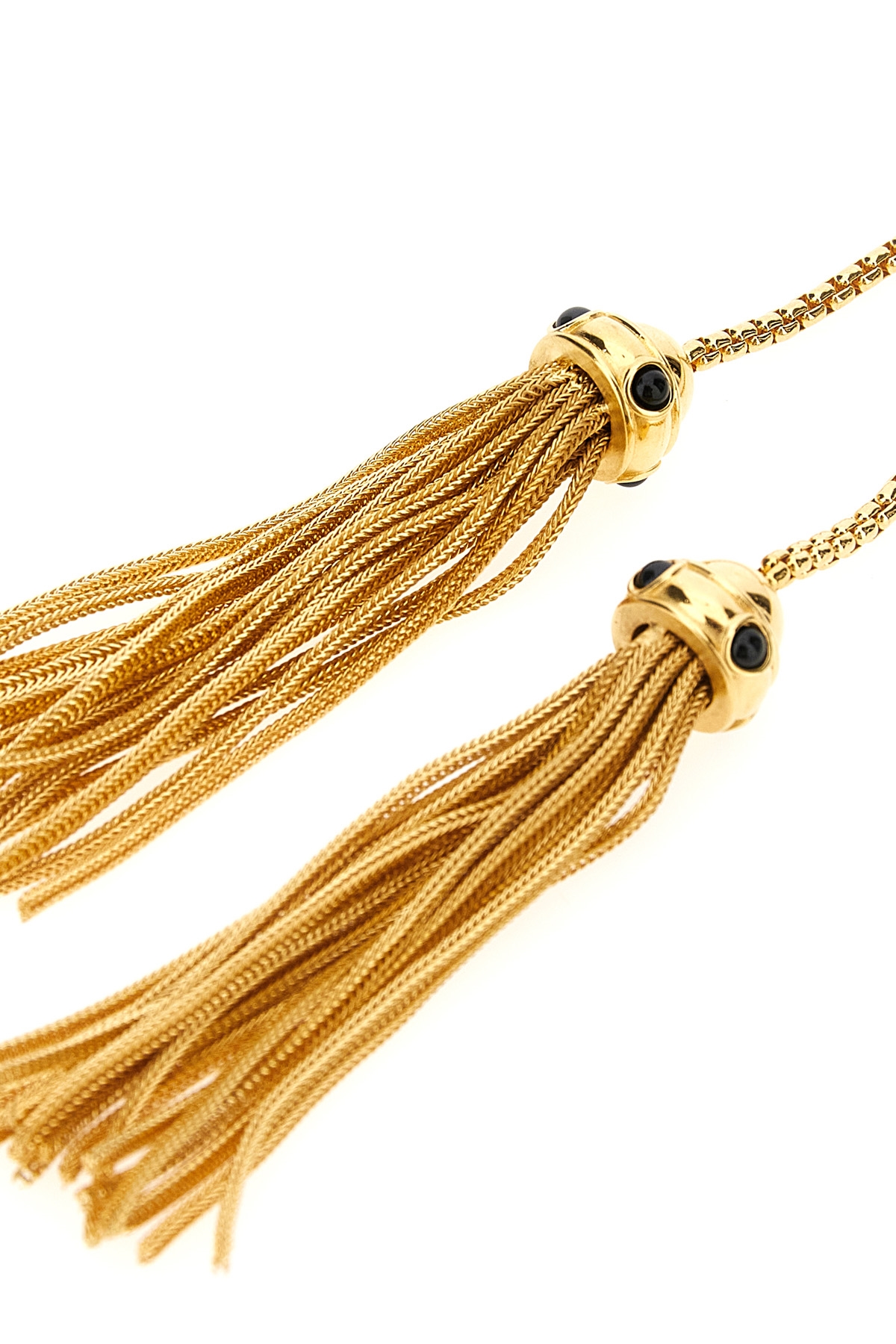 Necklace in antiqued gold metal with tassel detail and black Swarovski crystal cabochons.