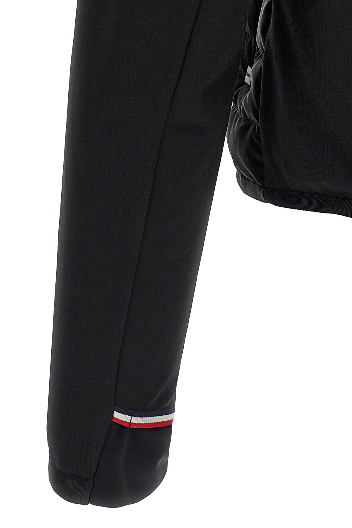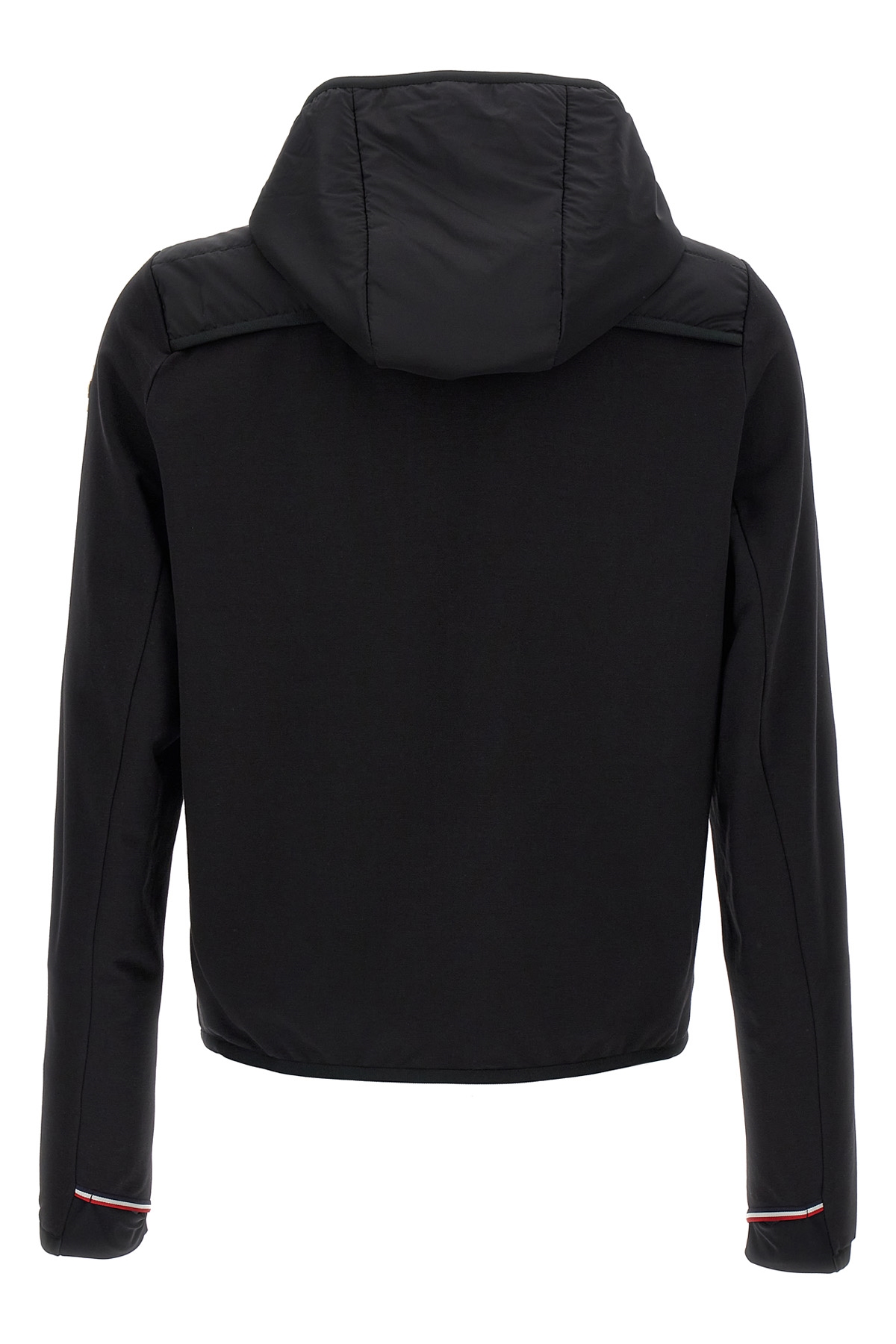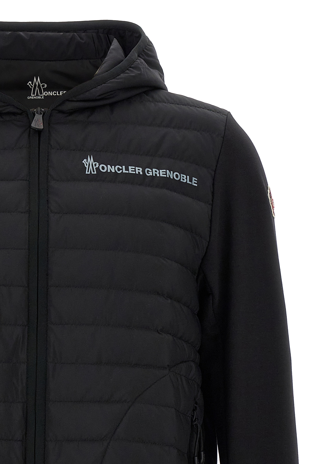 Stretch cotton jersey blend hoodie with slightly feather padded nylon vest, front logo print, zip closure, pockets, long sleeves with Sensitive® knitted warp-fabric gaiter and applied logo patch, elastic hem.