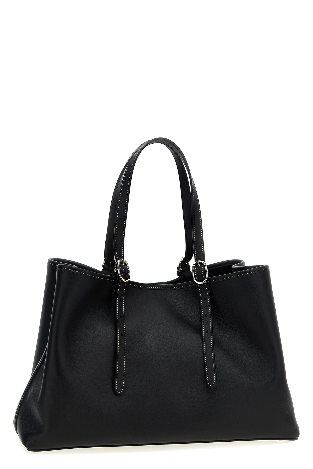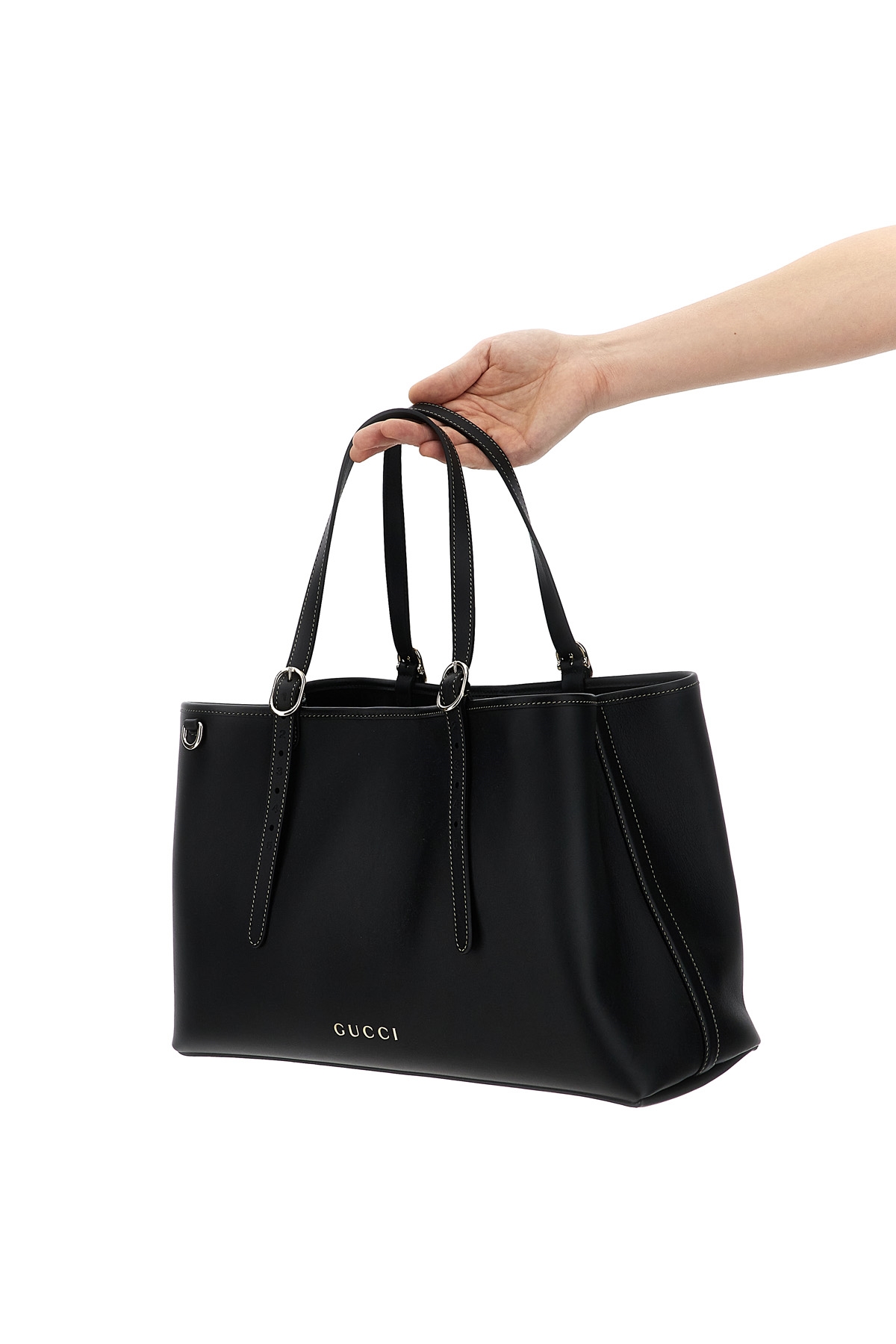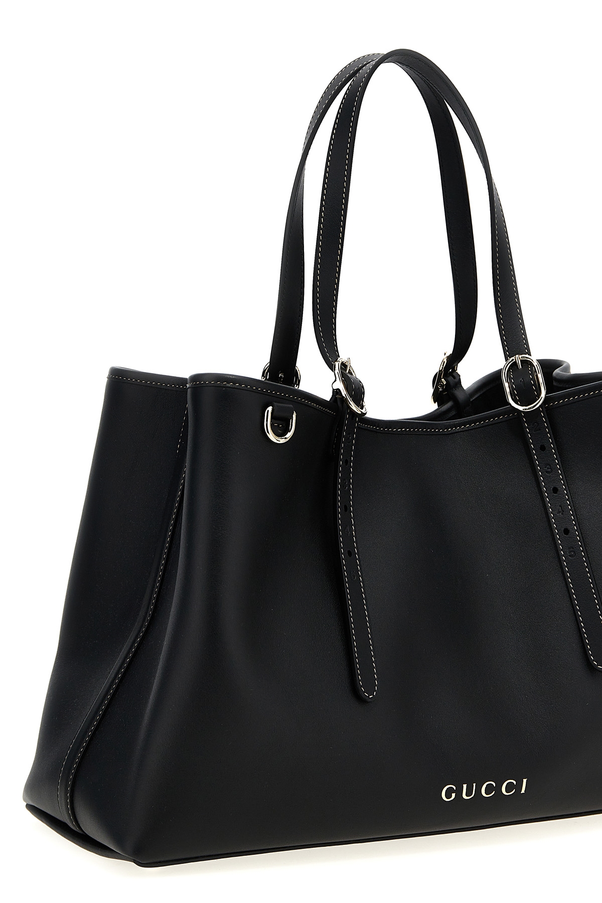 Medium leather 'GG Emblem' shopping bag with magnetic closure, double adjustable handle, metal details, front embossed logo.