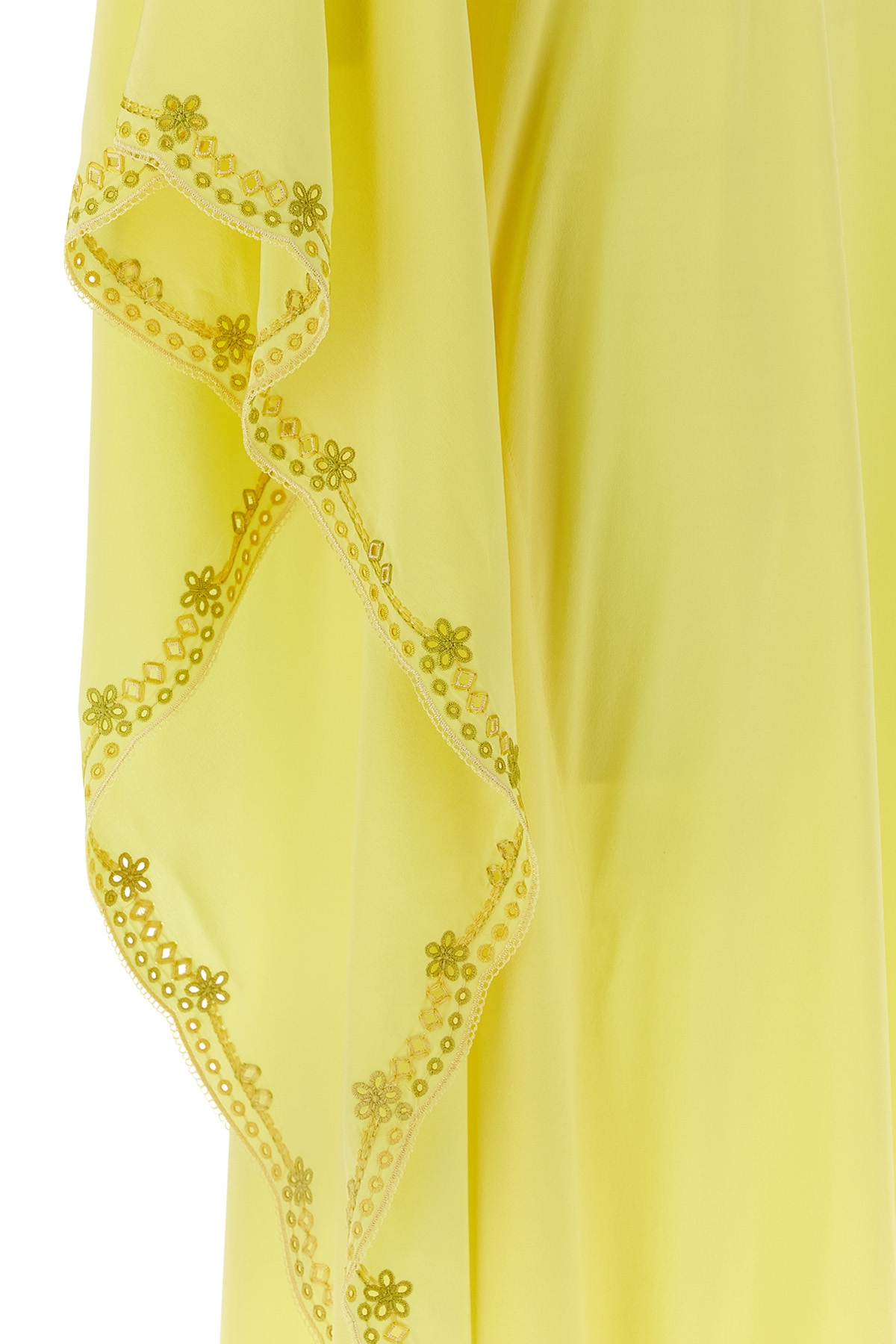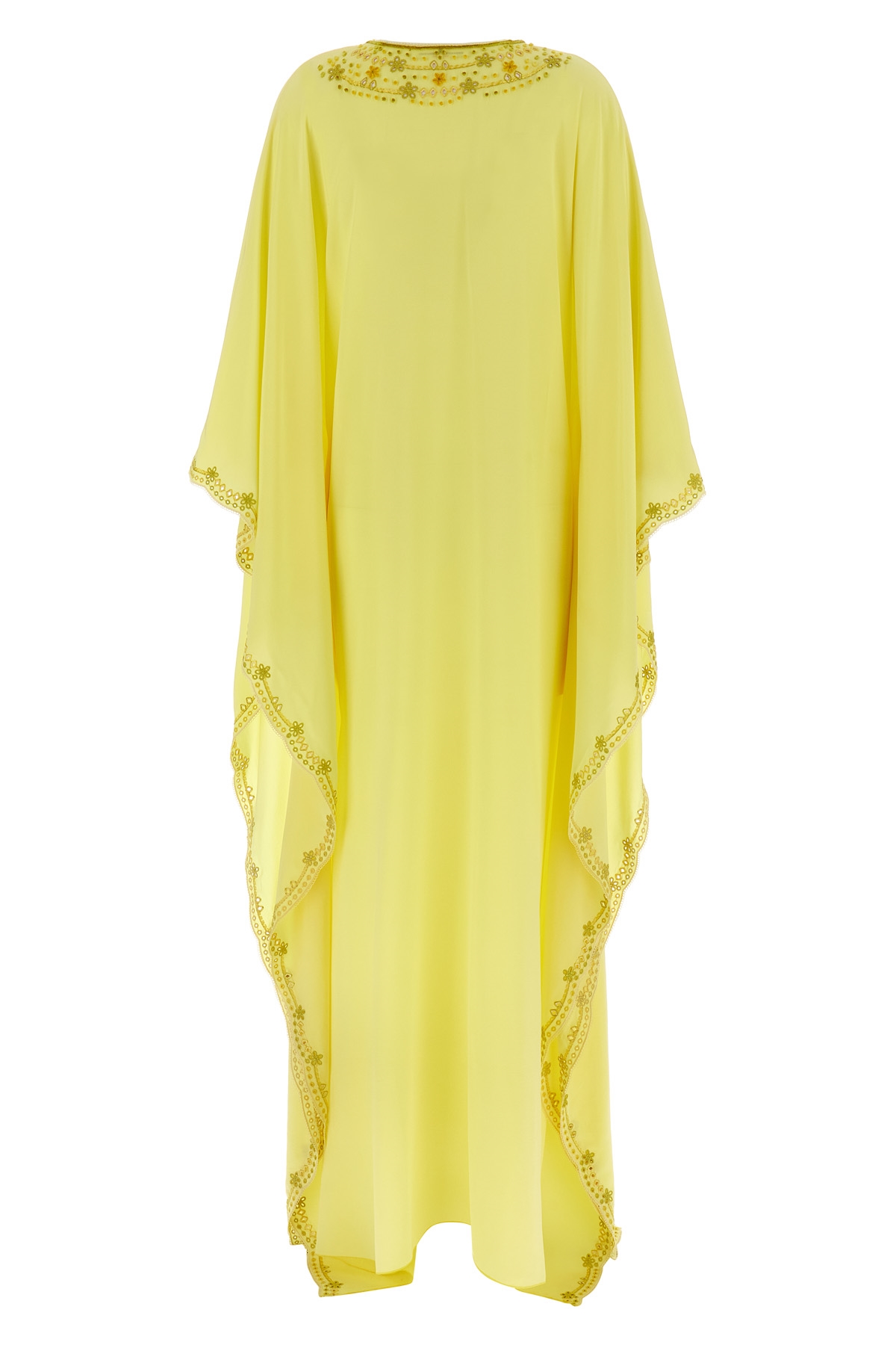 Long pure silk crepe de chine kaftan with 7/8 wide sleeves, tone-on-tone trimming embroidery, V-neck with button closure.