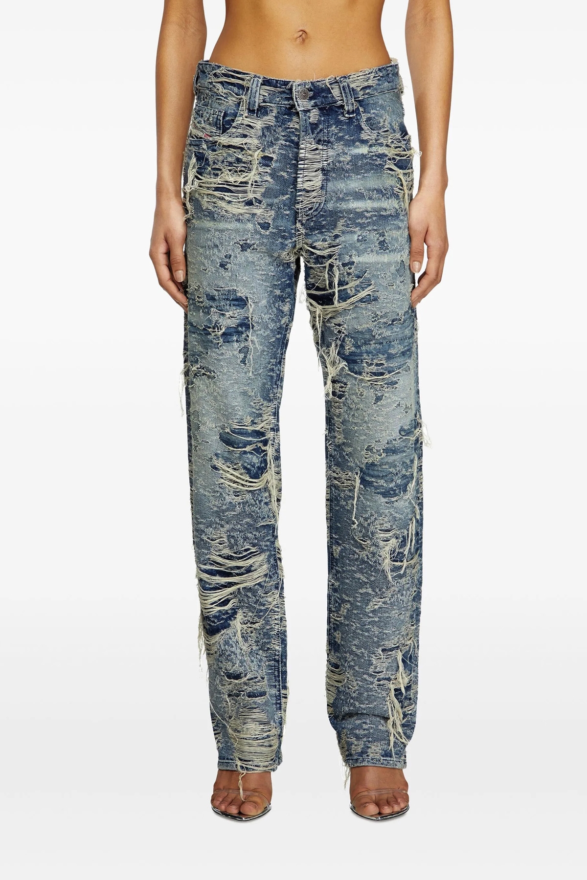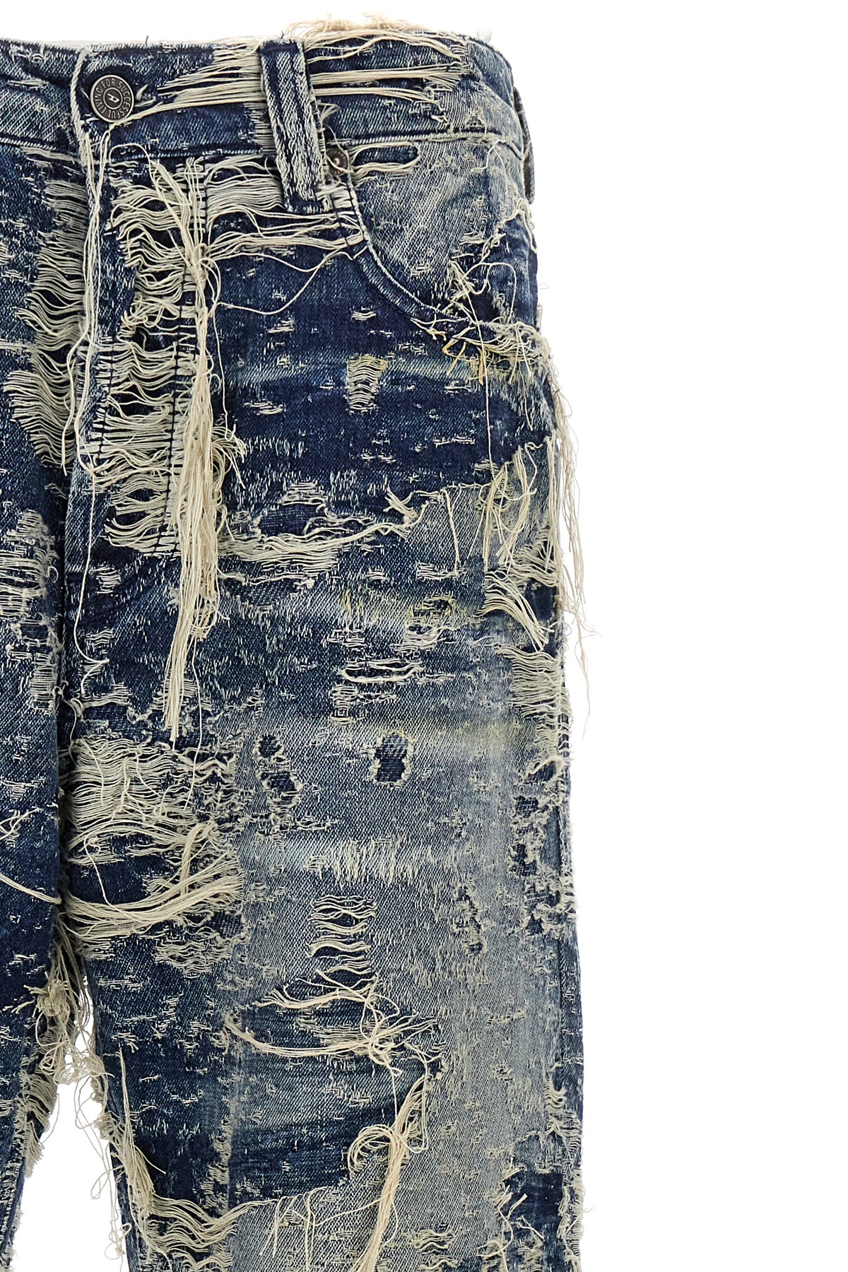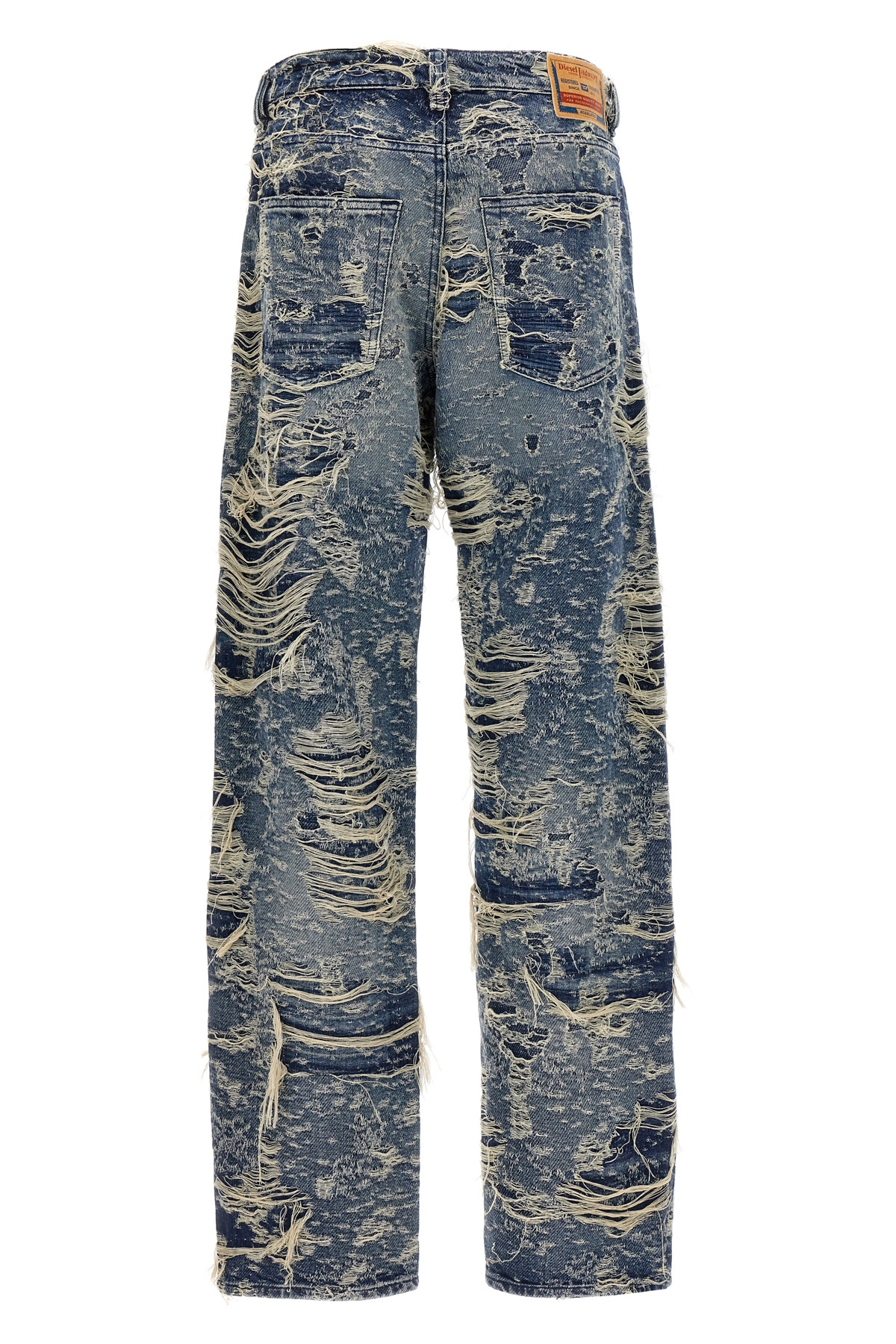 '1988 D-Ark 09m04' stonewashed cotton denim jeans with jacquard weave on a distressed and destroyed effect double frame, low waist and long taperd leg, front button closure, five pockets, leather logo label at the back.