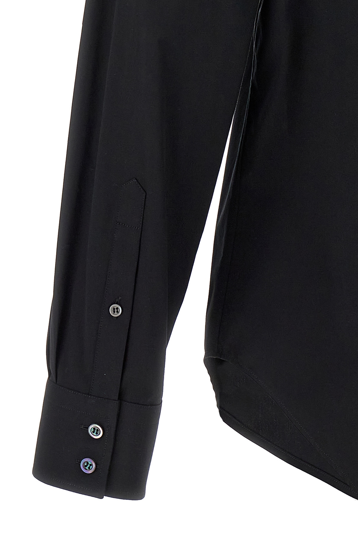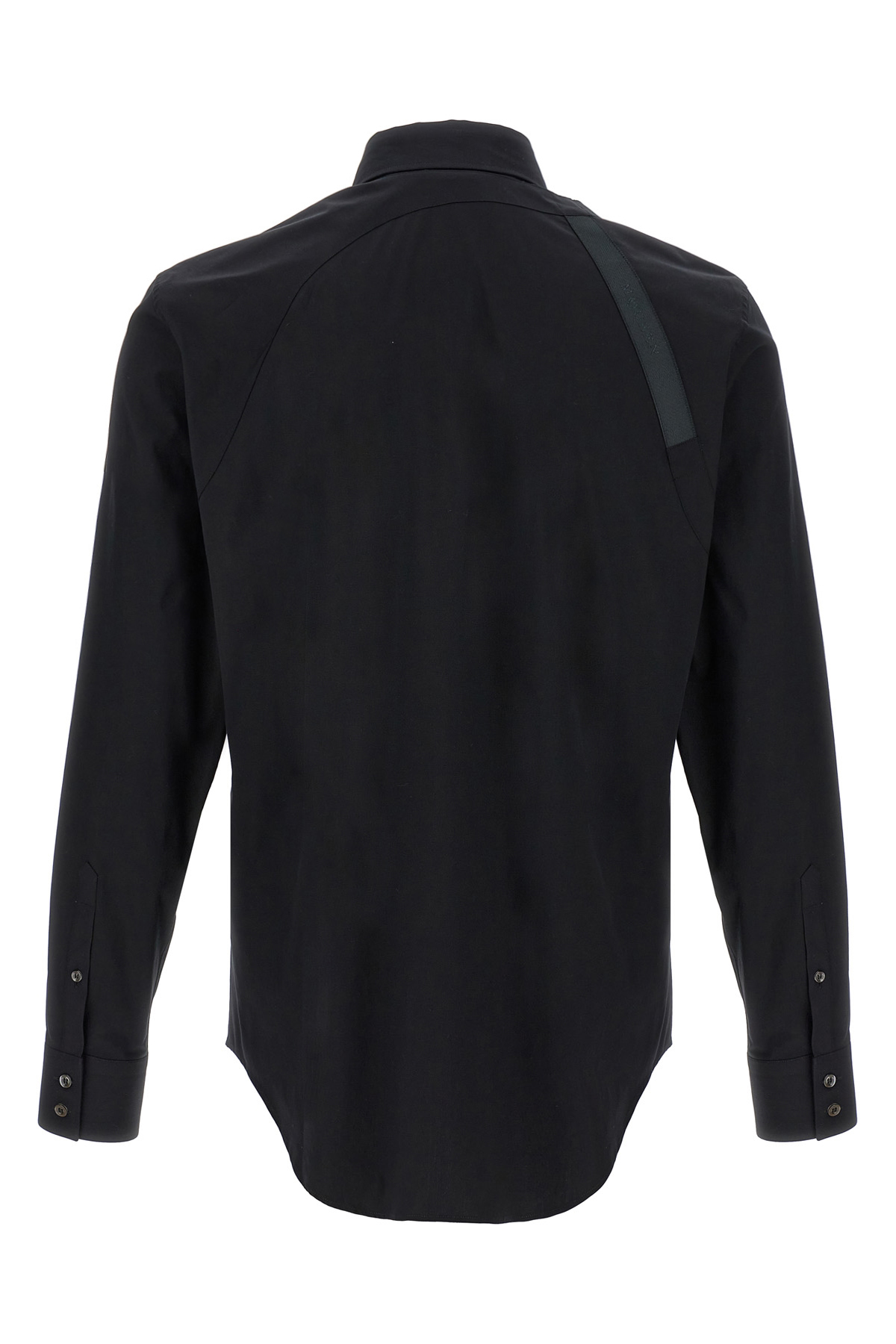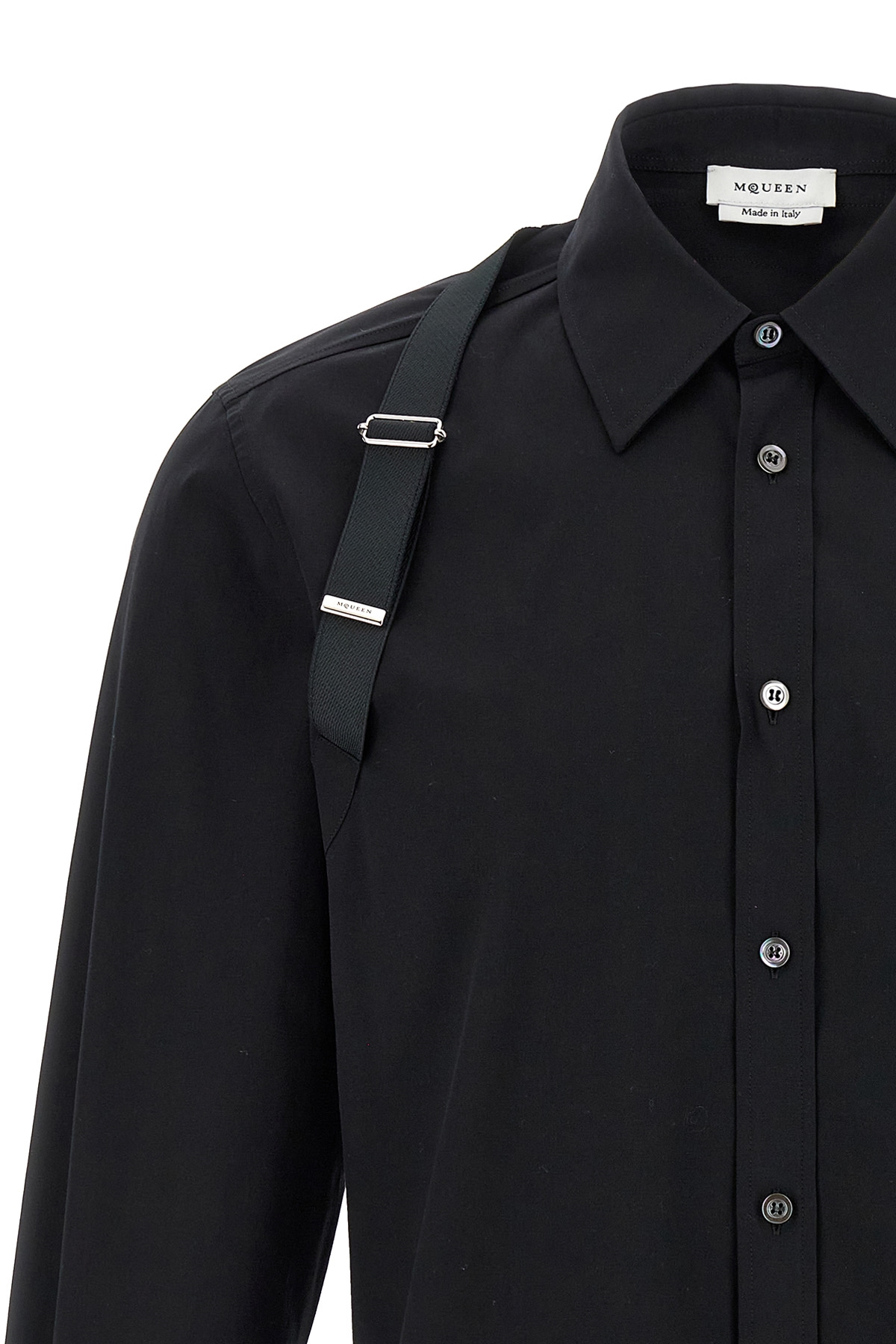 Cotton poplin shirt with 'Harness' detail with metal buckle, front button closure, long cuffed sleeves.
