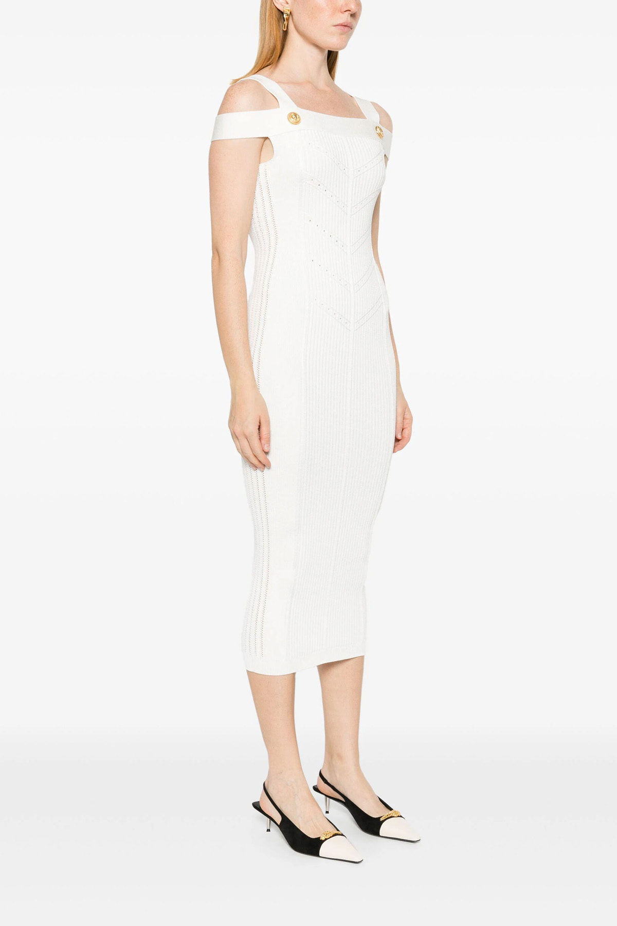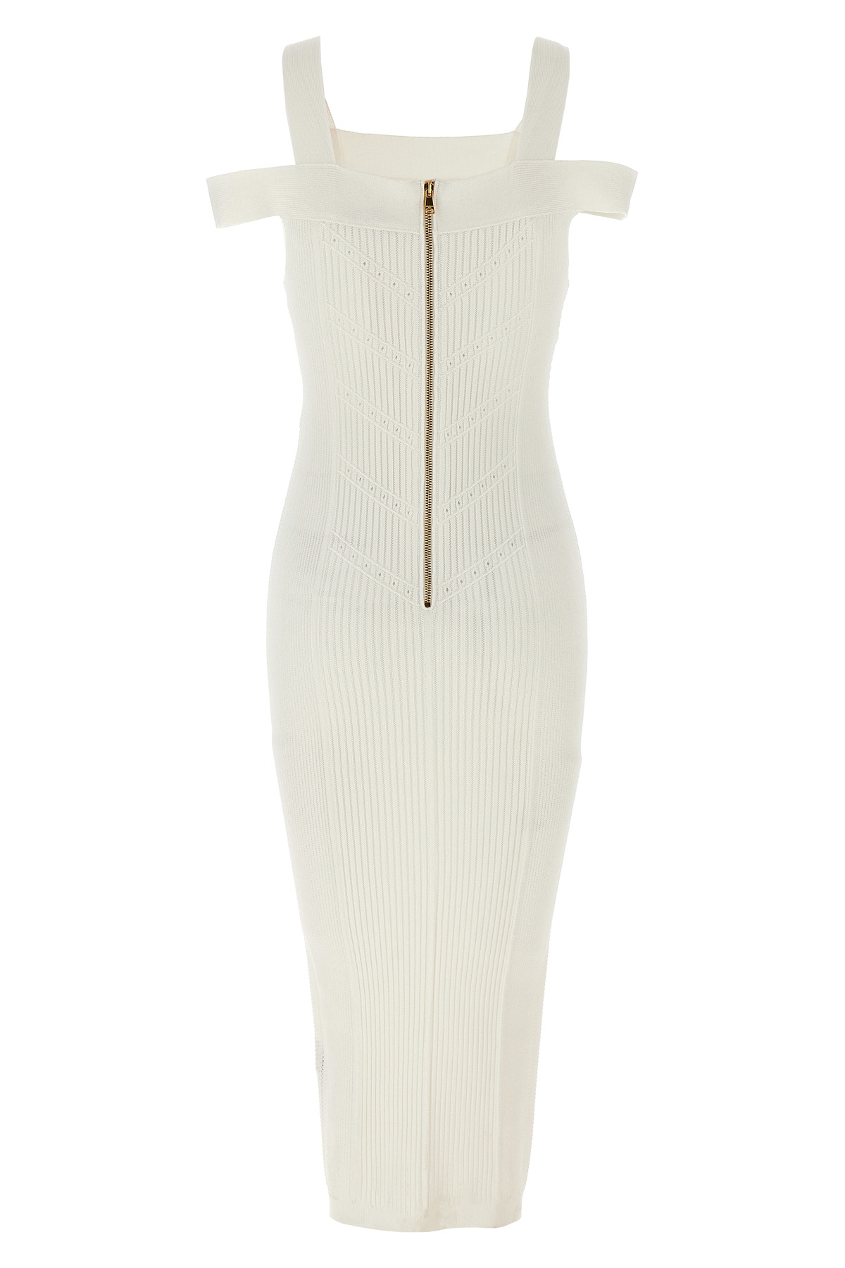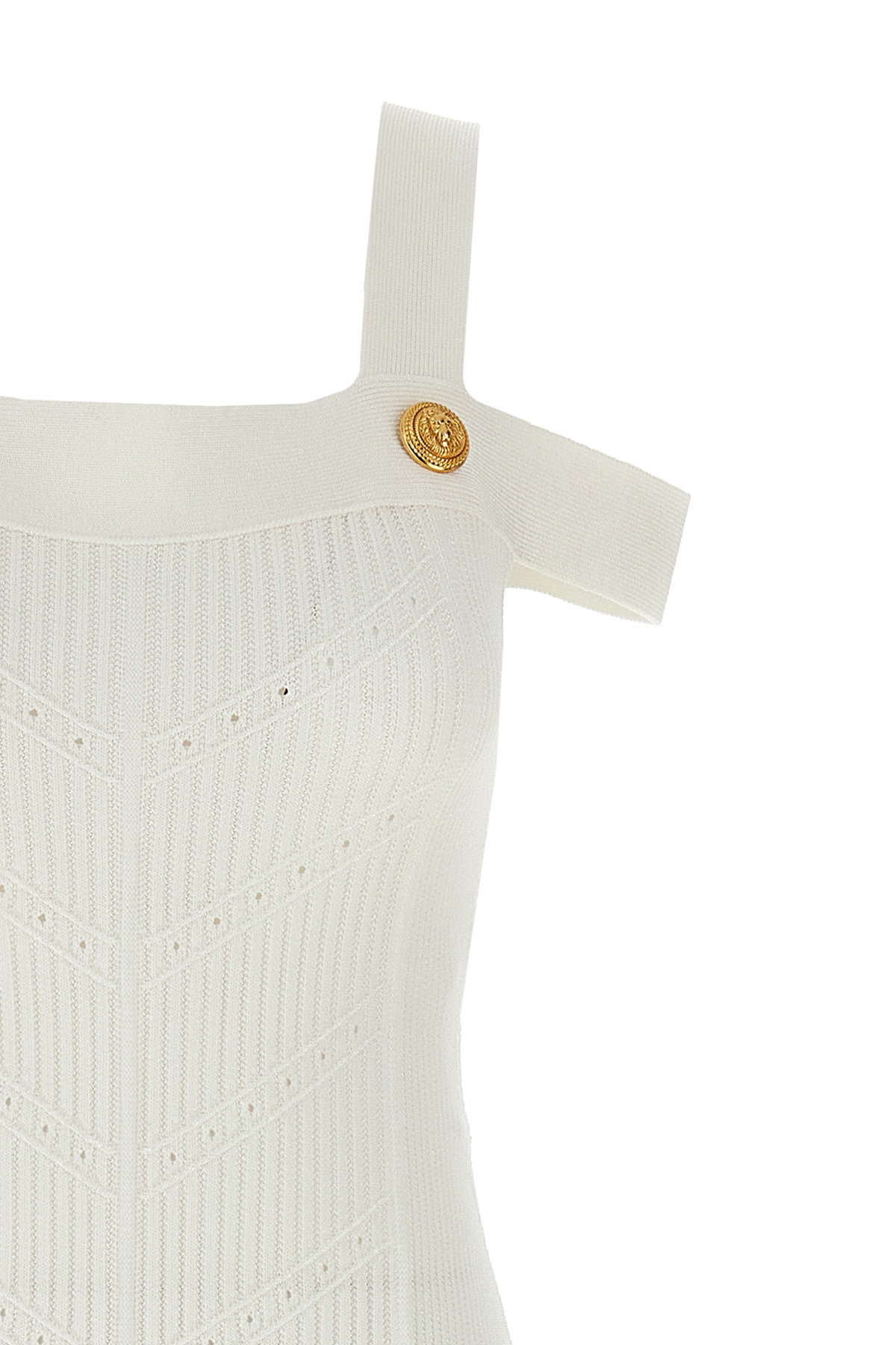 Knitted dress with band straps and logo buttons, front perforated work, back zip closure.
