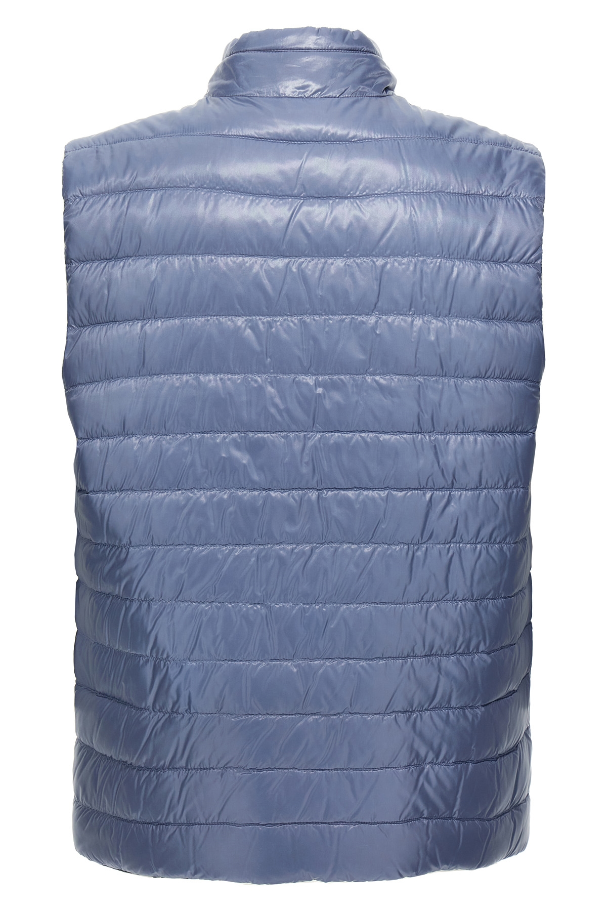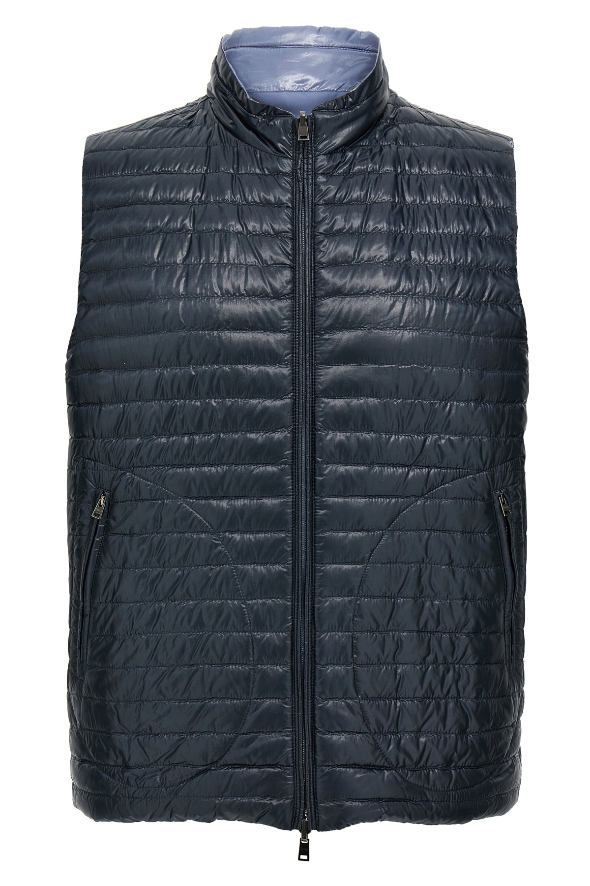 Reversible vest in ultralight nylon, Japanese Nylon 20 denier and a fine 90/10 feather inserted by injection, high neck, zip closure, pockets, drawstring on the hem.