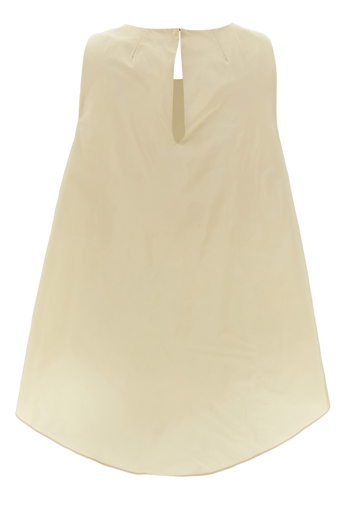 'Pimpy' cady fabric top with front ruffles, asymmetrical hem, back button closure with teardrop cut-out detail.