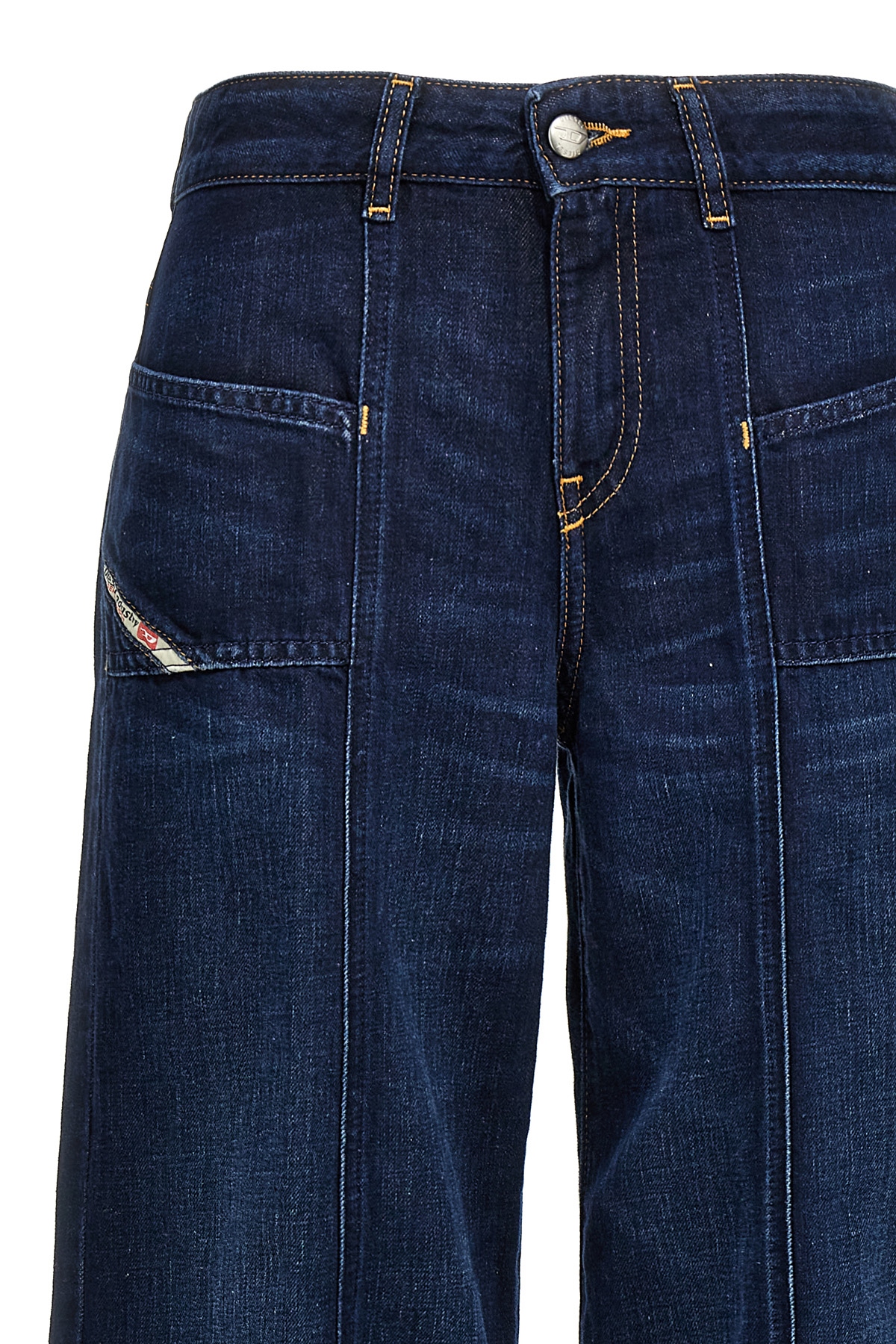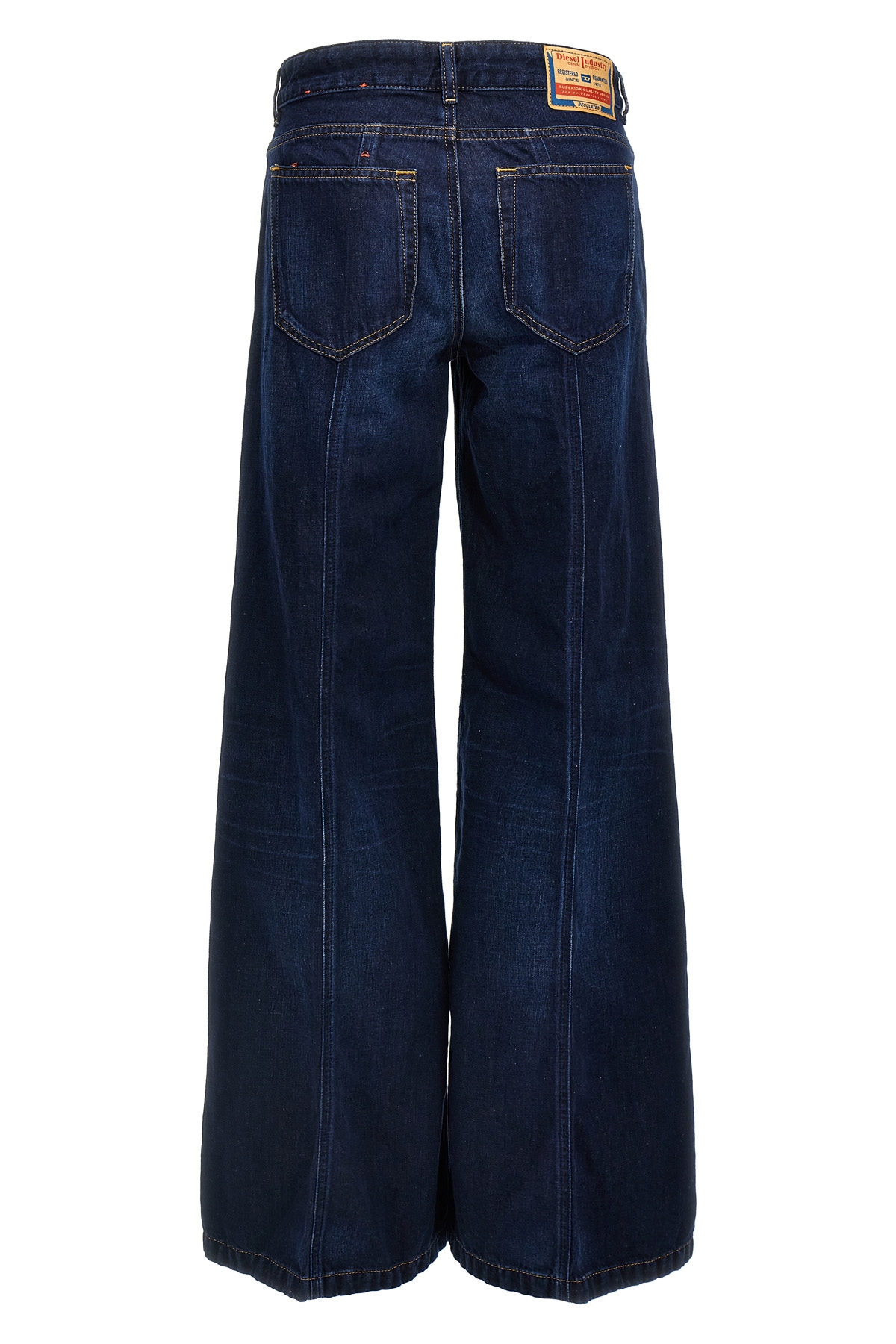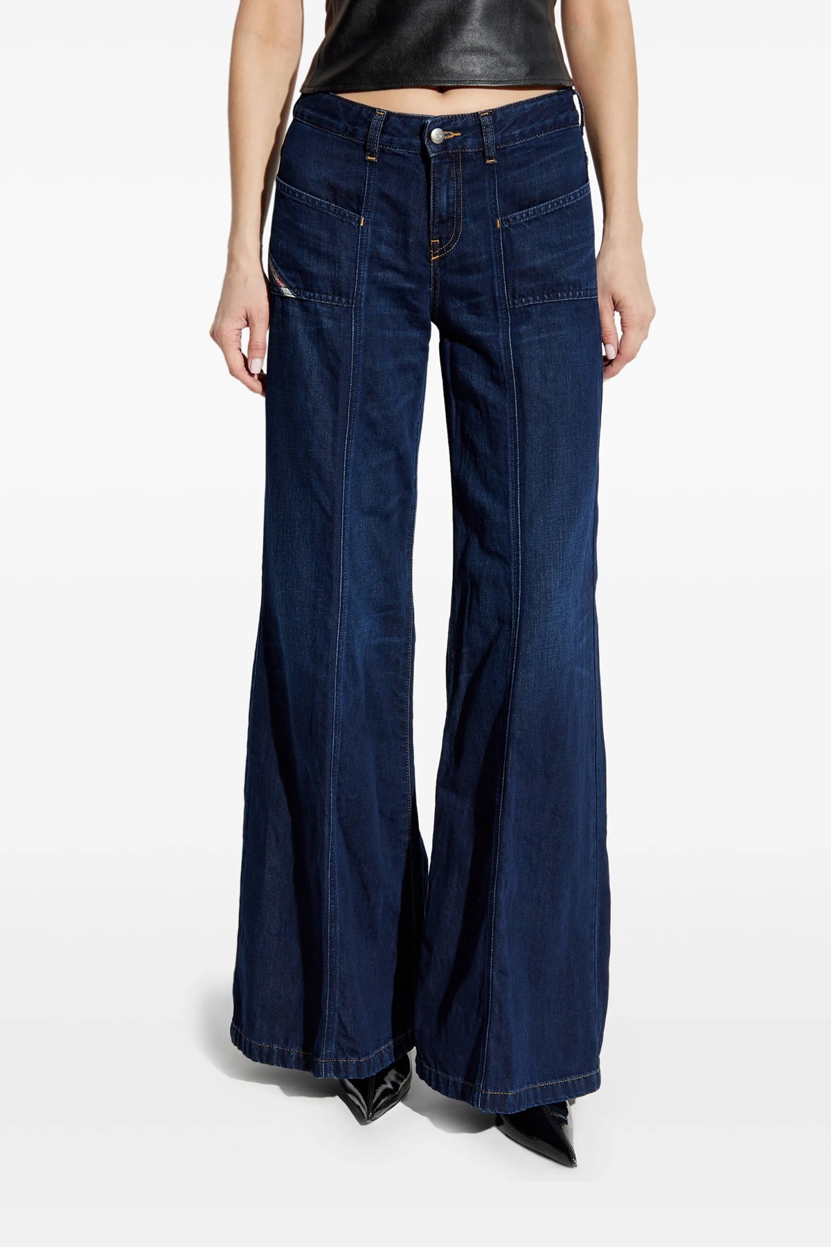 'D-Akii' low-waisted stonewashed cotton denim jeans with loose, flared leg, pockets, zip and button closure, back logo tag.