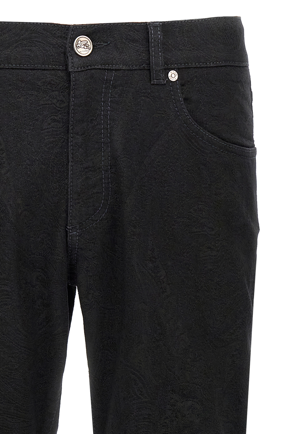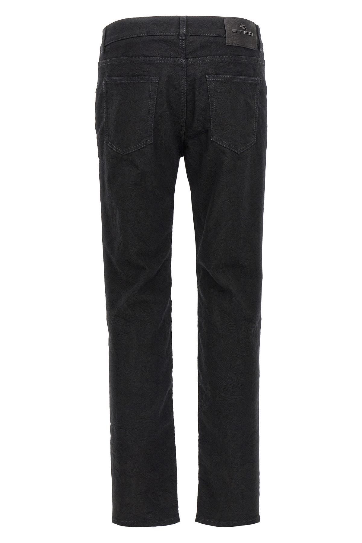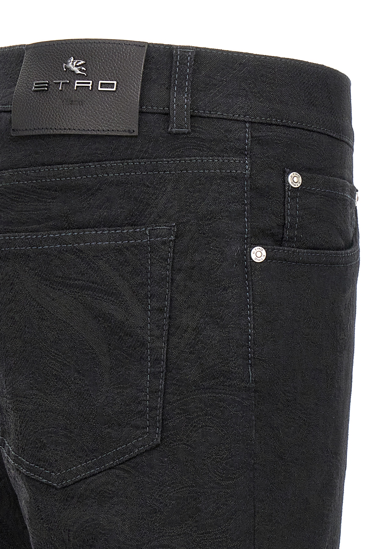 All-over tone-on-tone jacquard stretch cotton blend denim jeans, five pockets, zip and button closure, back leather logo tag.