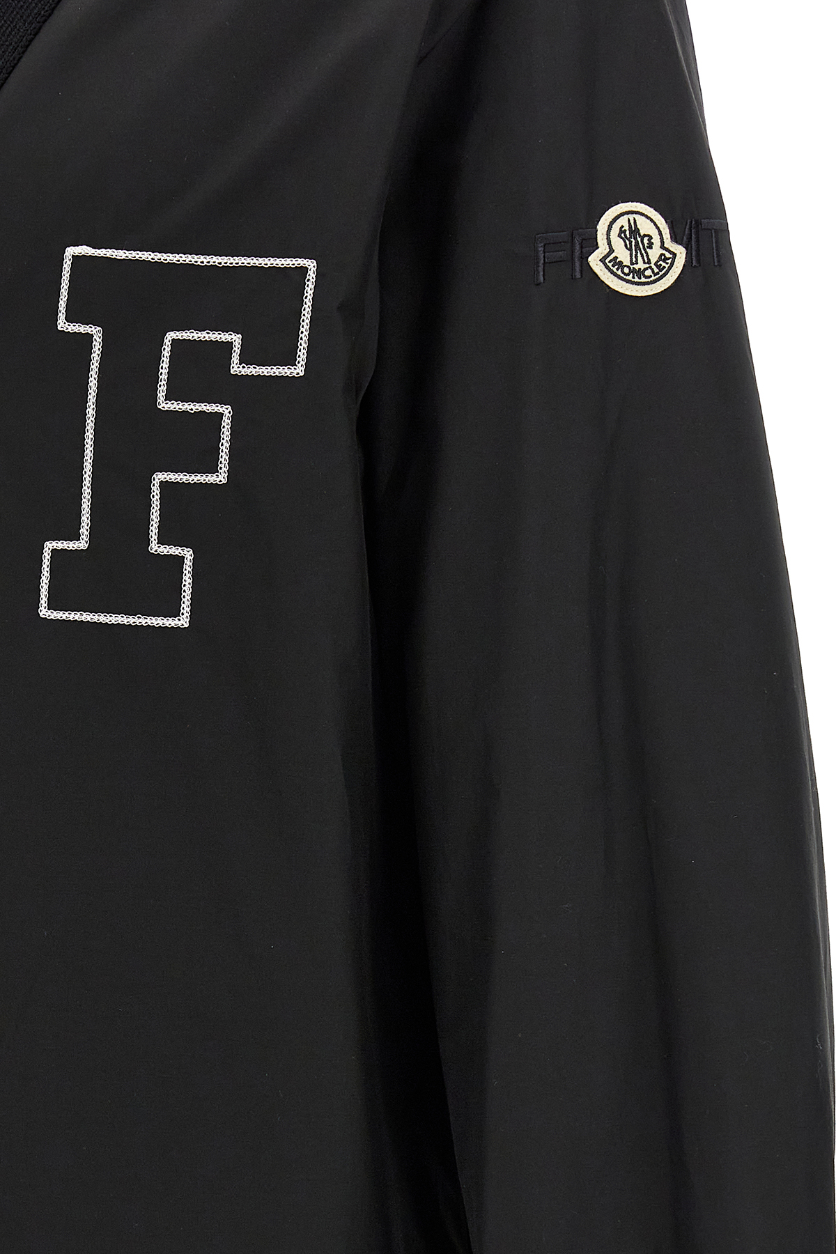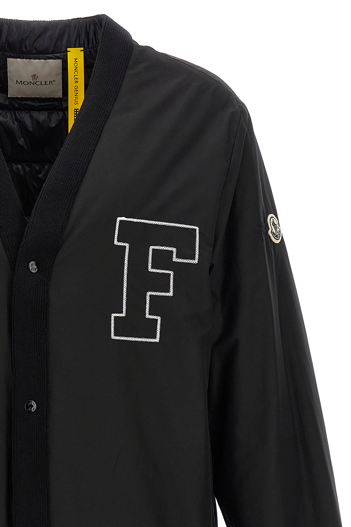Moncler x FRGMT 'Anise' down jacket in nylon and cotton blend, embroidery at the front and back, quilted nylon lining with down padding, snap button closure, V-neck, long sleeves with knitted cuffs, felt logo patch, drawstring at the hem.