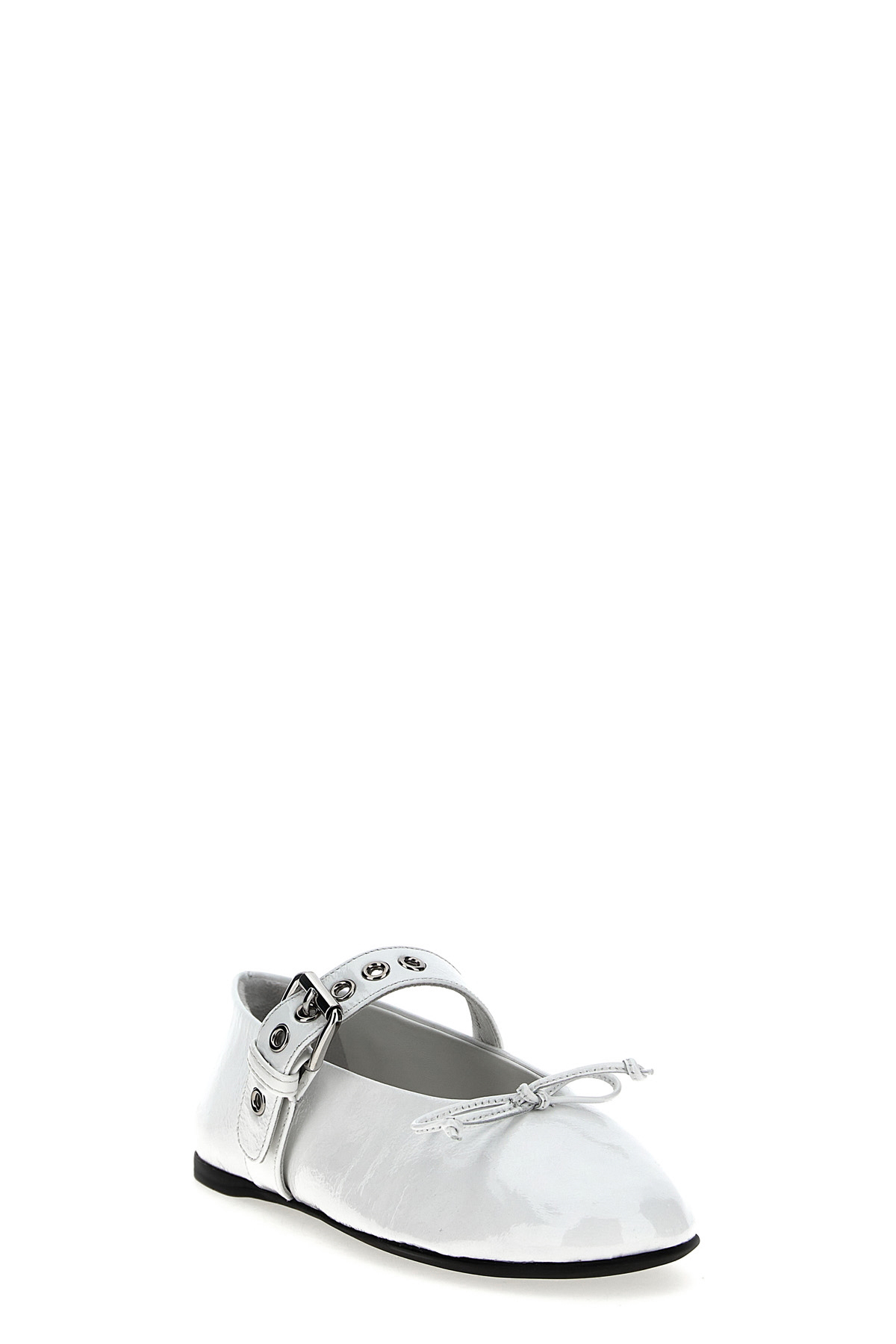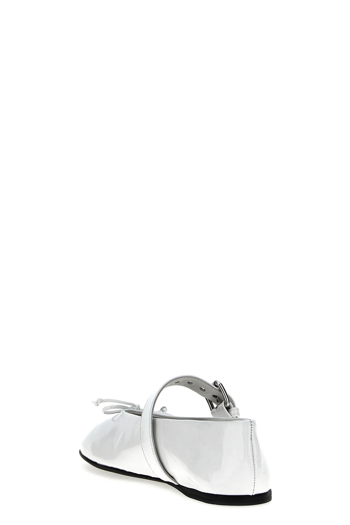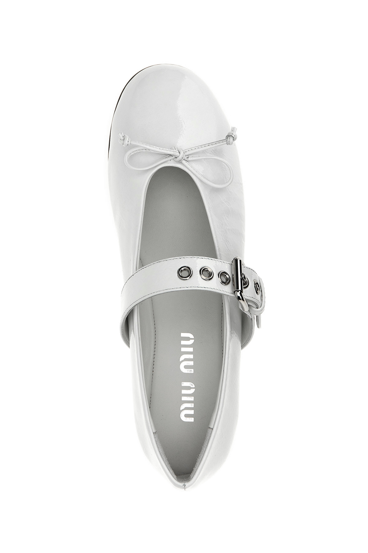 Shiny patent leather ballet flats with bow, adjustable strap with metal details, rubber sole.