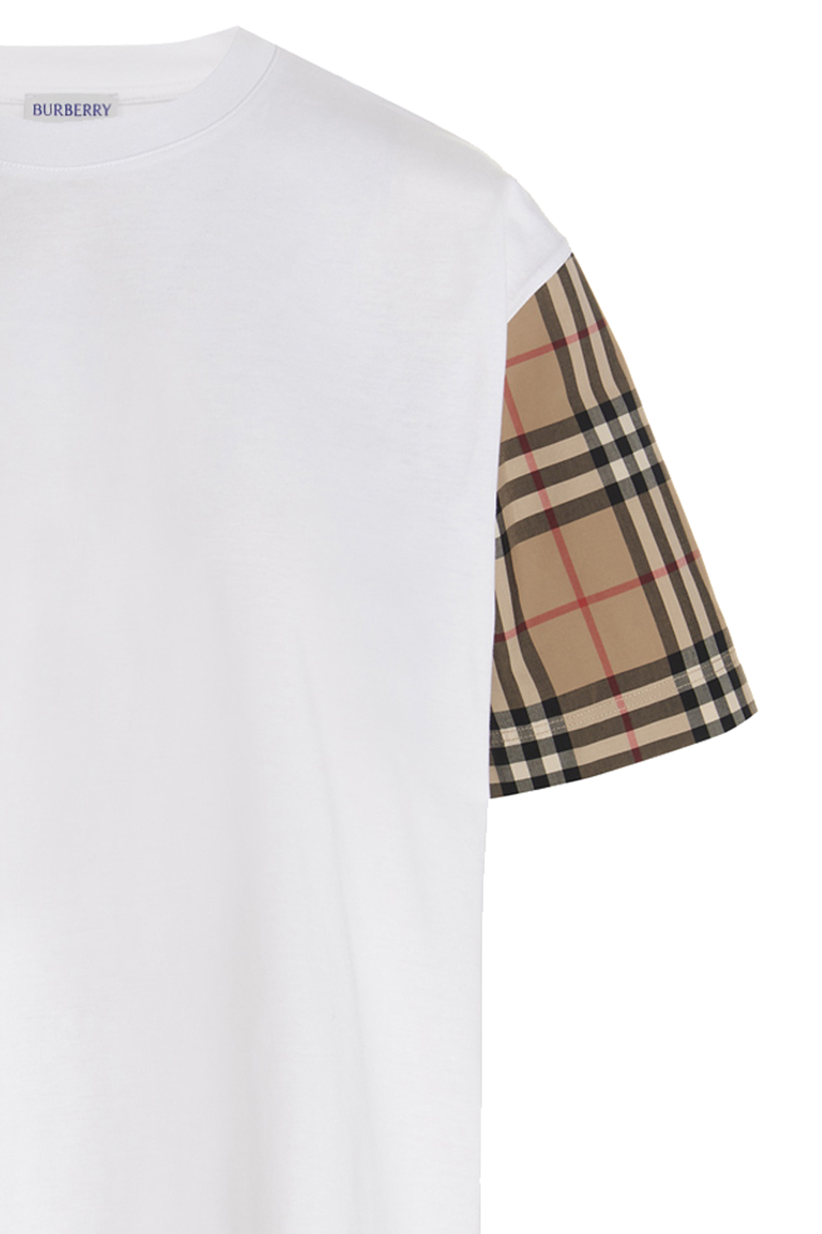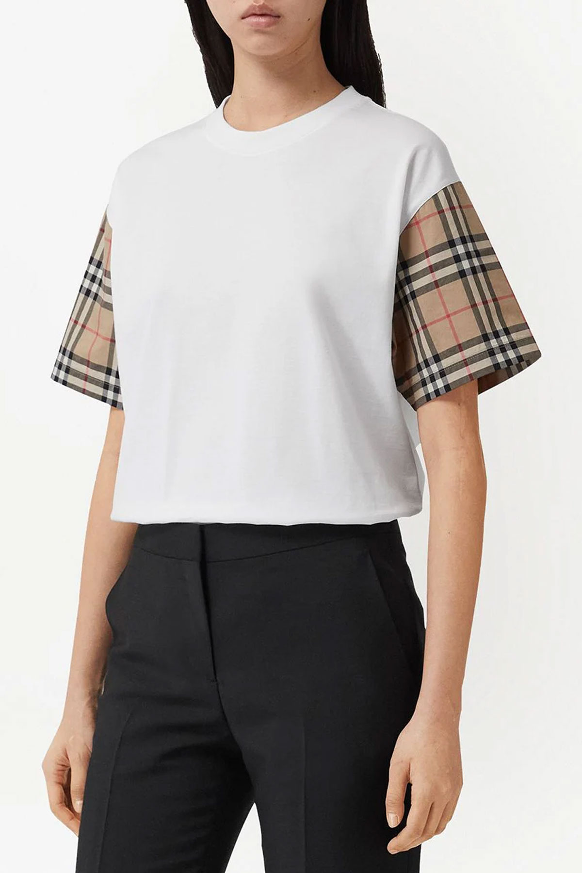 'Carrick' crewneck cotton t-shirt with vintage check contrasting print sleeves.