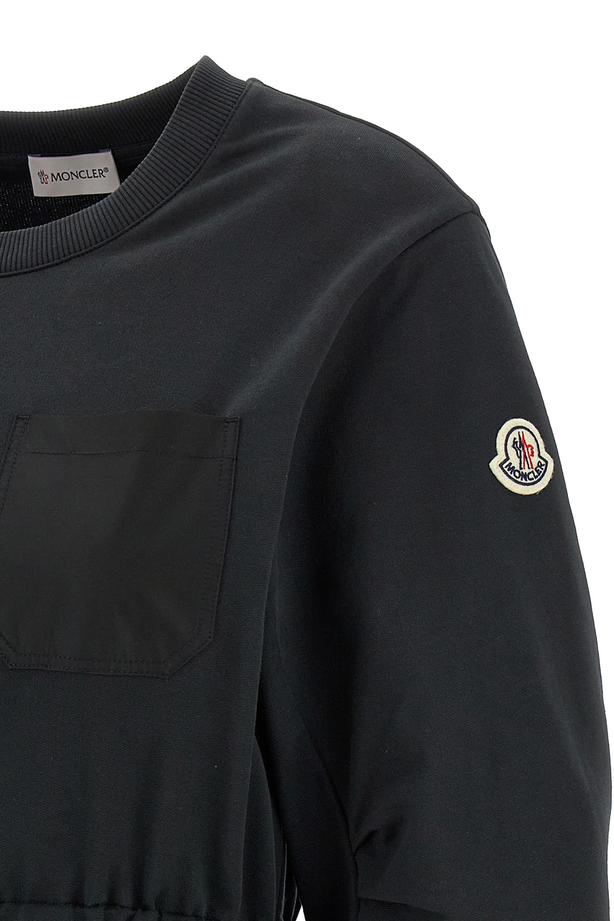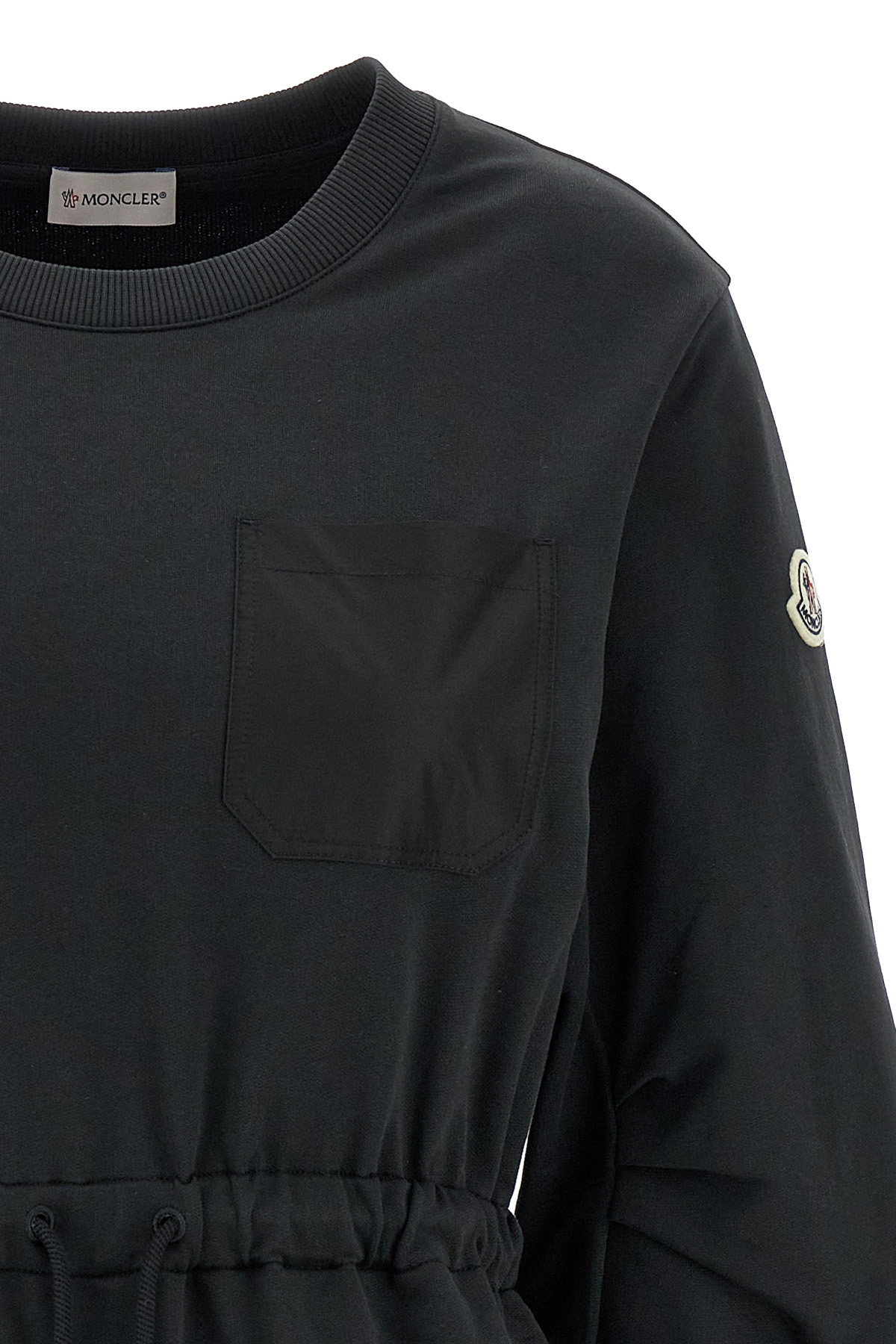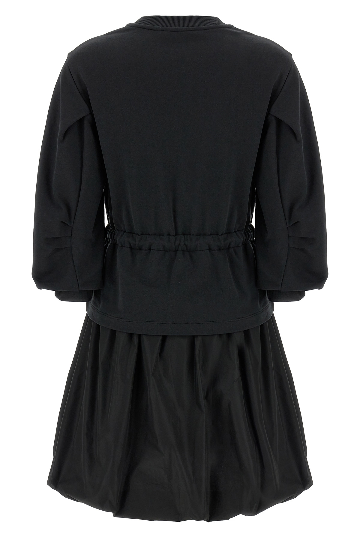 Two-material dress consisting of brushed cotton top, 3/4 sleeves with elastic curled cuffs and applied felt logo patch, crew neck, breast pocket, drawstring at the waist and balloon-style skirt in double technical fabric with mesh lining.