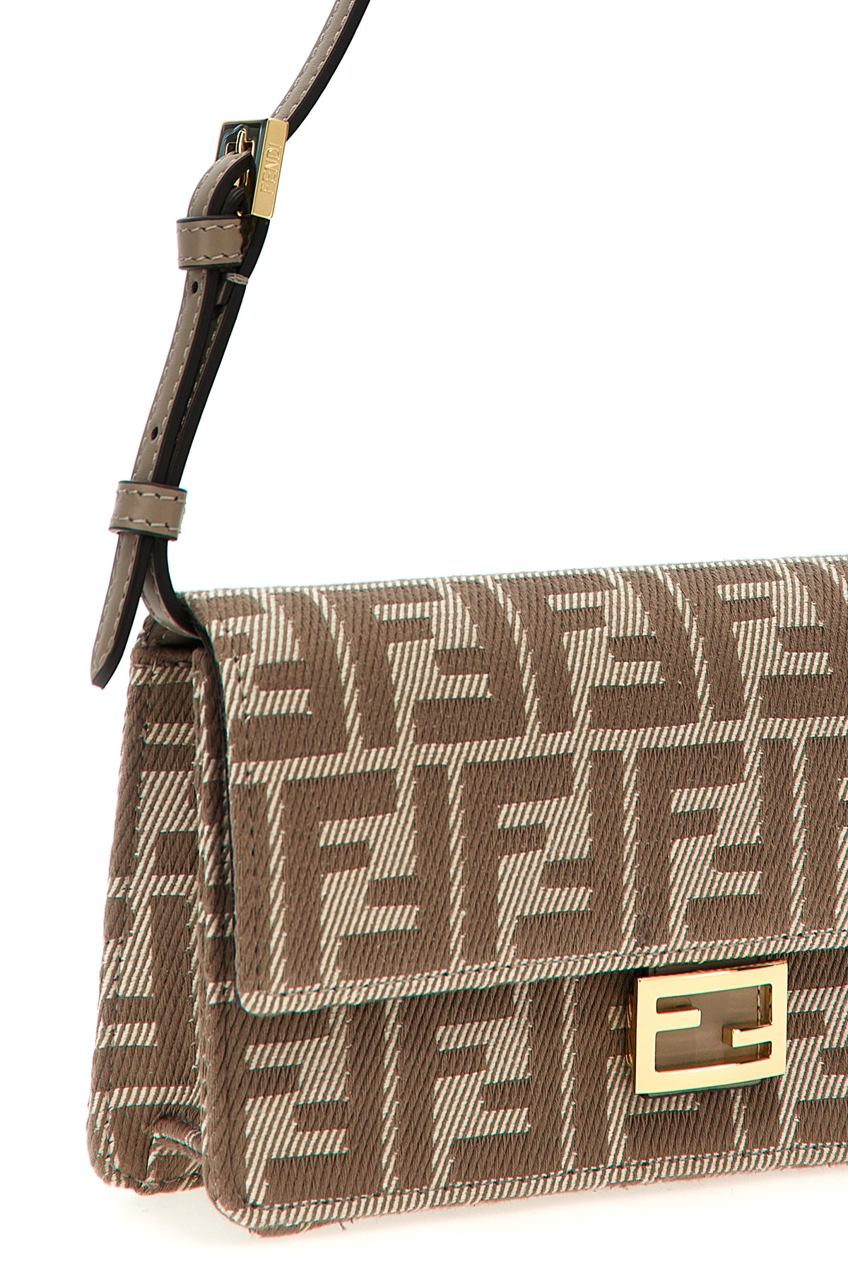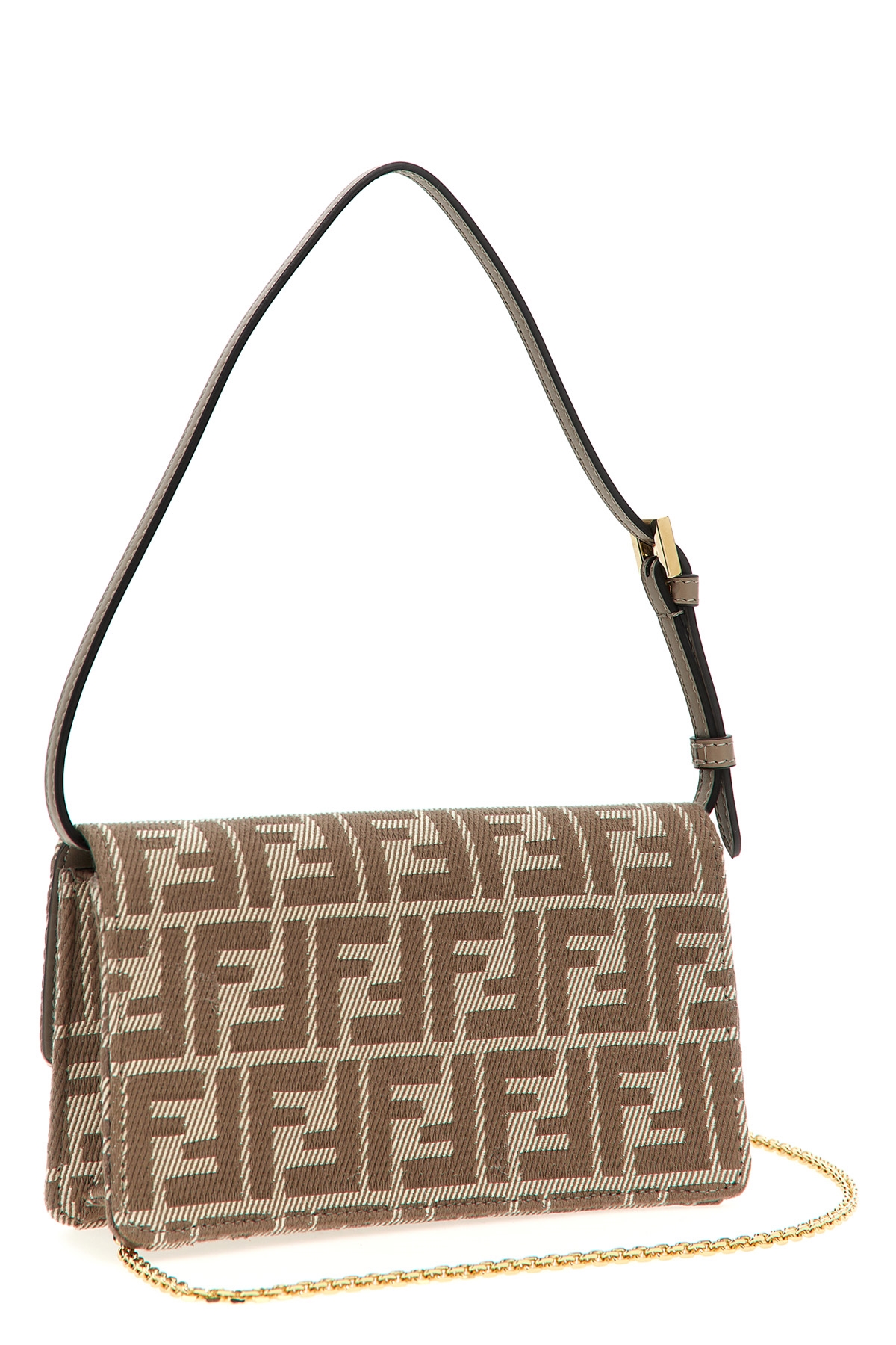 'Baguette' wallet on chain in FF jacquard with denim effect, flap closure with snap button and front metal logo, adjustable and removable leather handle, removable chain shoulder strap.