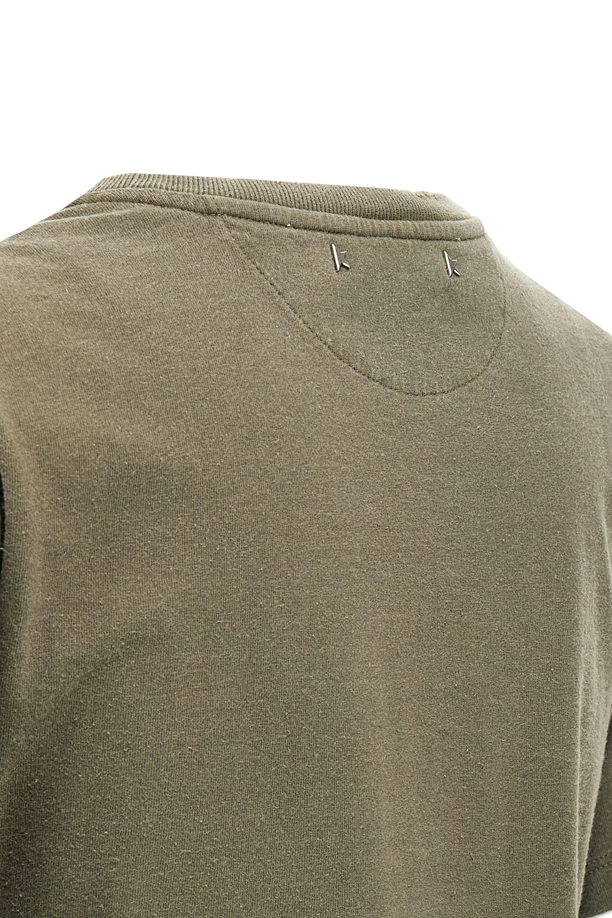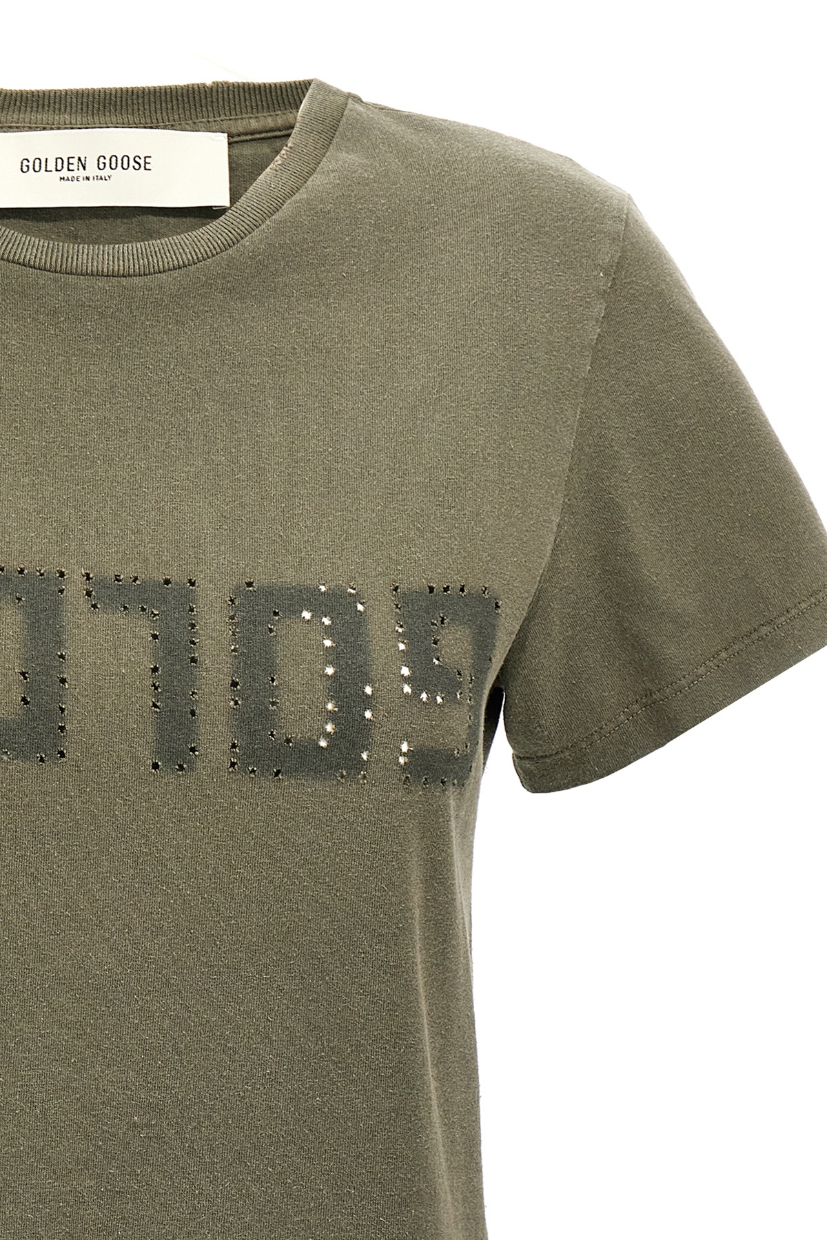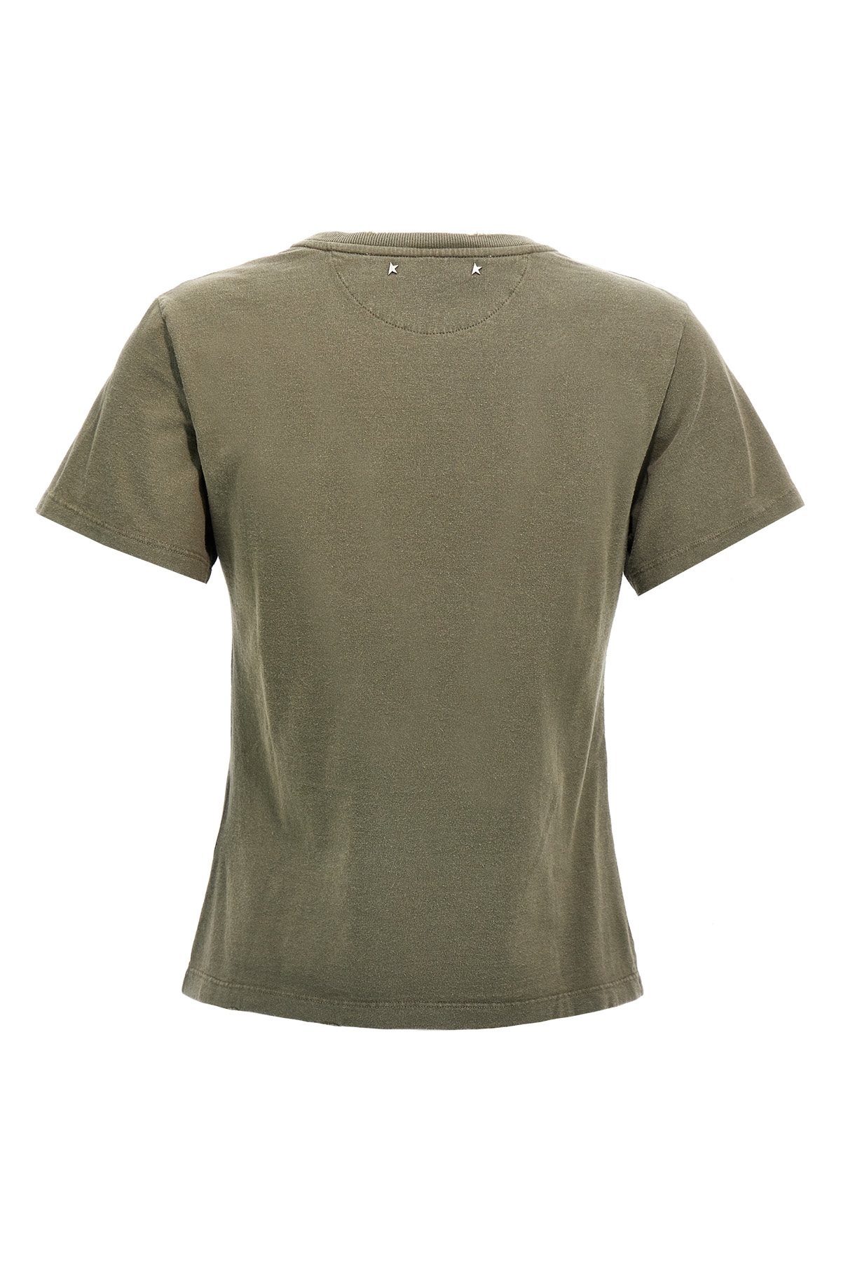 'Doris' cotton T-shirt with distressed treatment, front logo made with reserve treatment, crew neck, short sleeves.