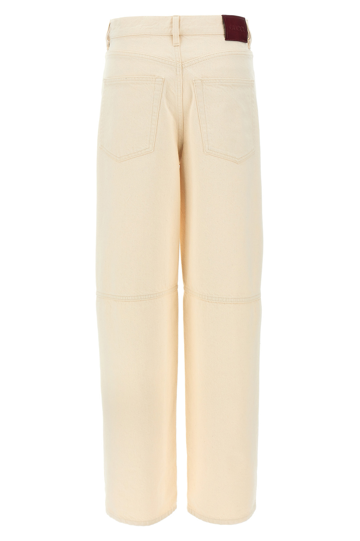 Garment-dyed cotton denim jeans with high waist and loose leg, button closure, five pockets, 'Gucci Rosso Ancora' patent leather logo on the back.