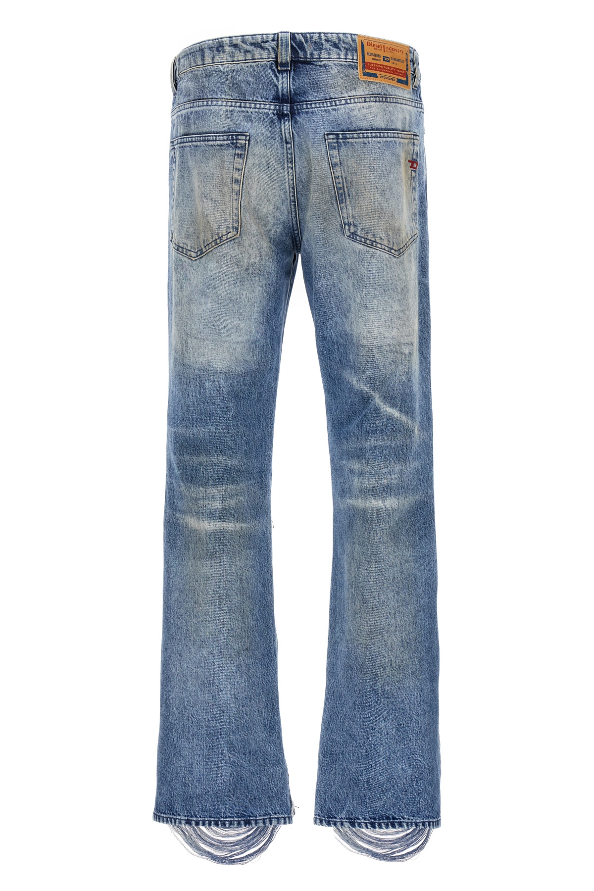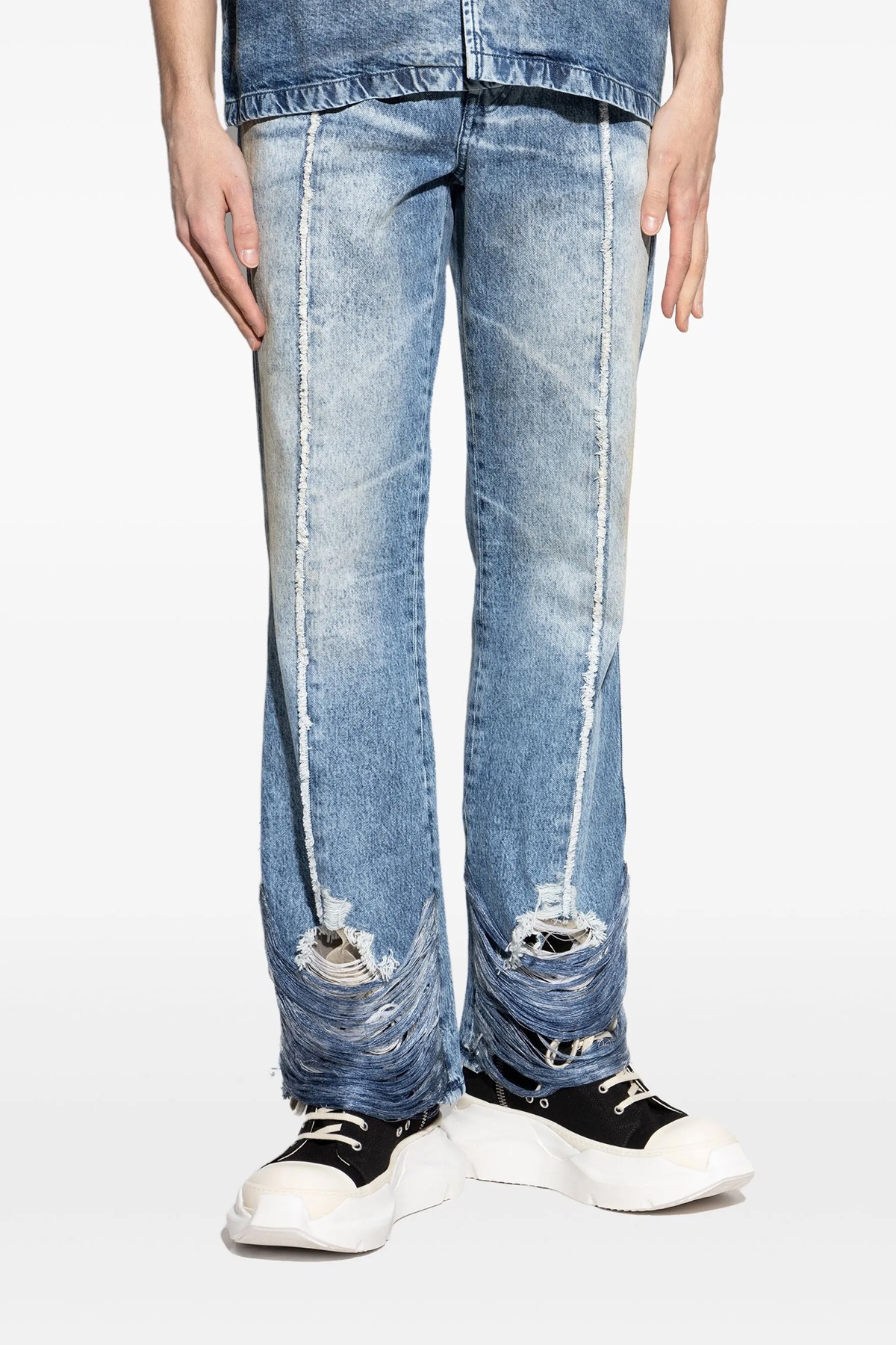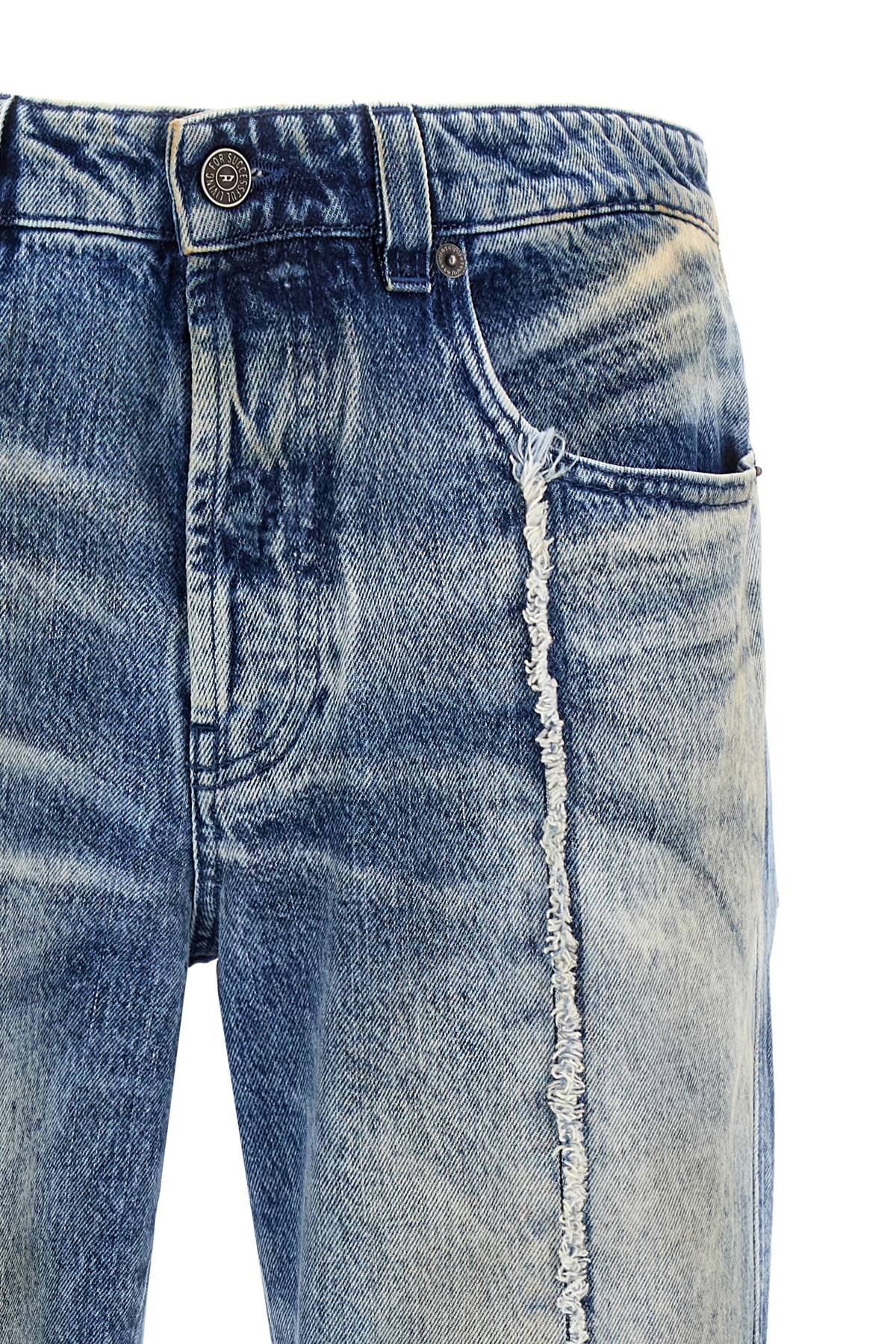 '1998 D-Buck 0cmbm' jeans In stonewashed cotton denim with laser whisker effects, distressed and destroyed leg bottoms with applied fringes, mid-waist and low crotch model, front button closure, five pockets, and rear leather logo tag.
