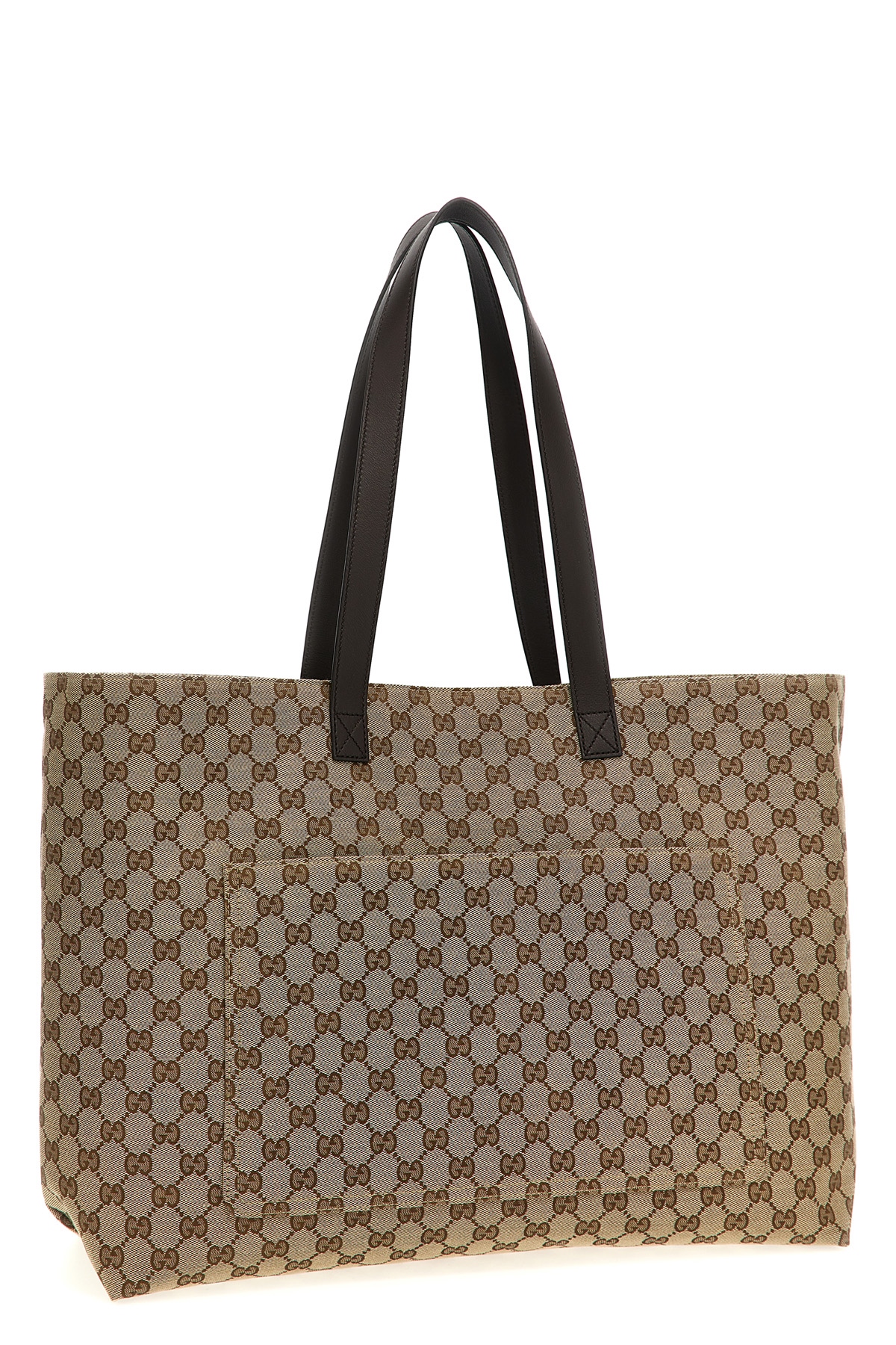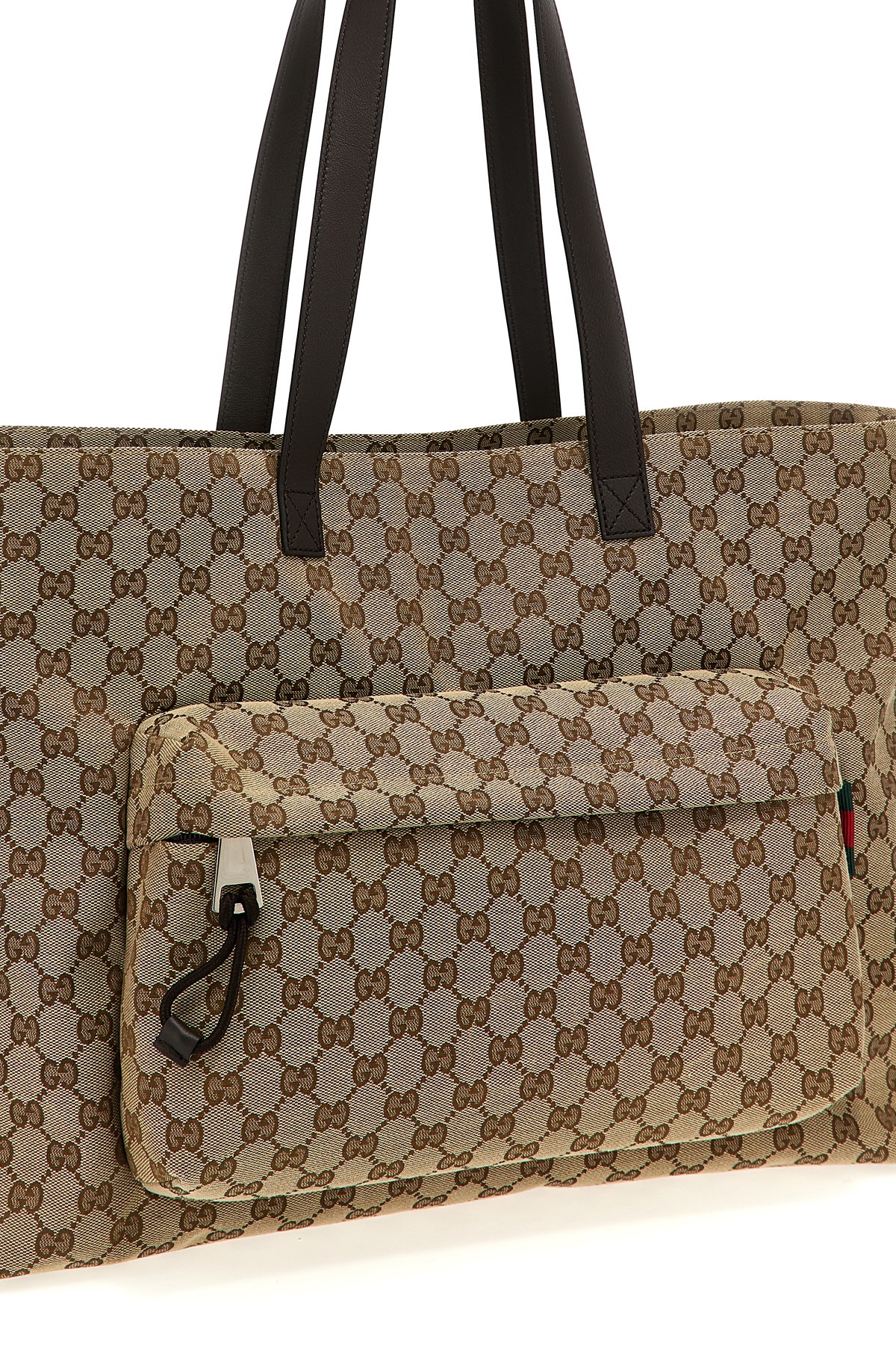 Large shopping bag in 'GG' fabric, front pocket with zip closure and embossed embossed logo, double fixed leather handle.