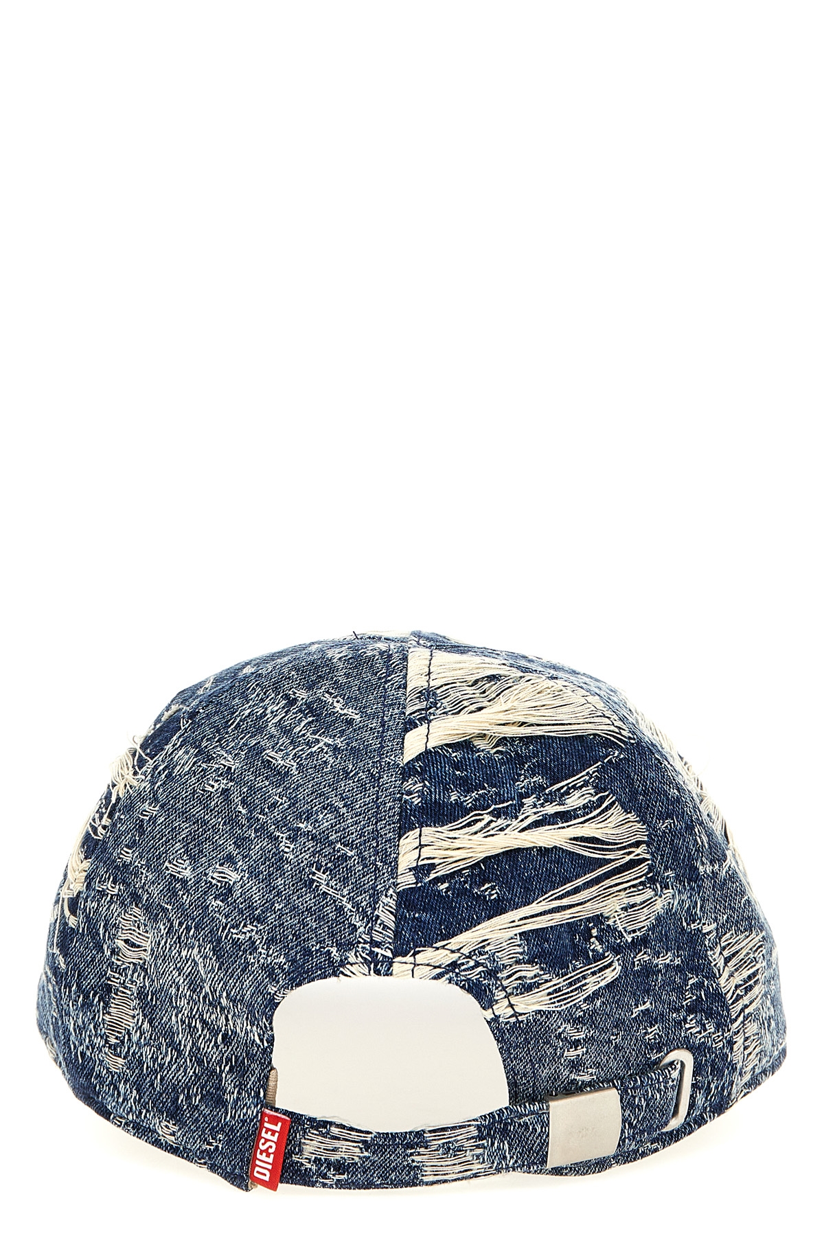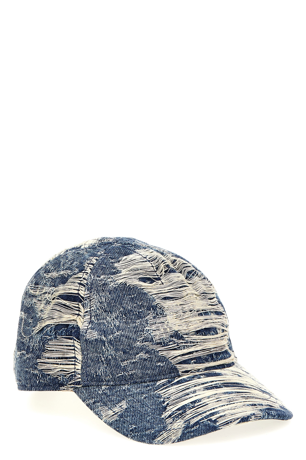 'C-Assidy' stonewashed cotton denim cap with jacquard weave on a distressed and destroyed effect double frame, adjustable strap at the back.