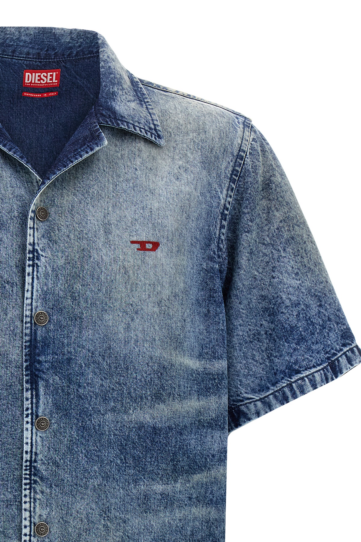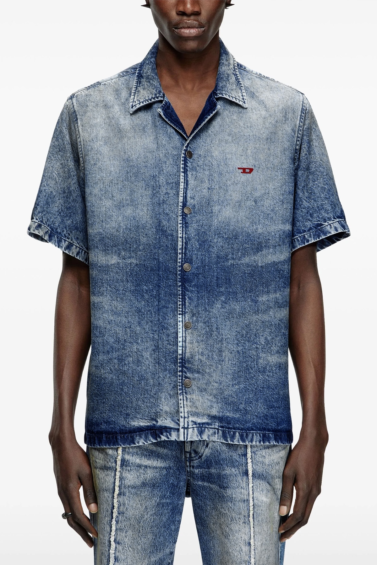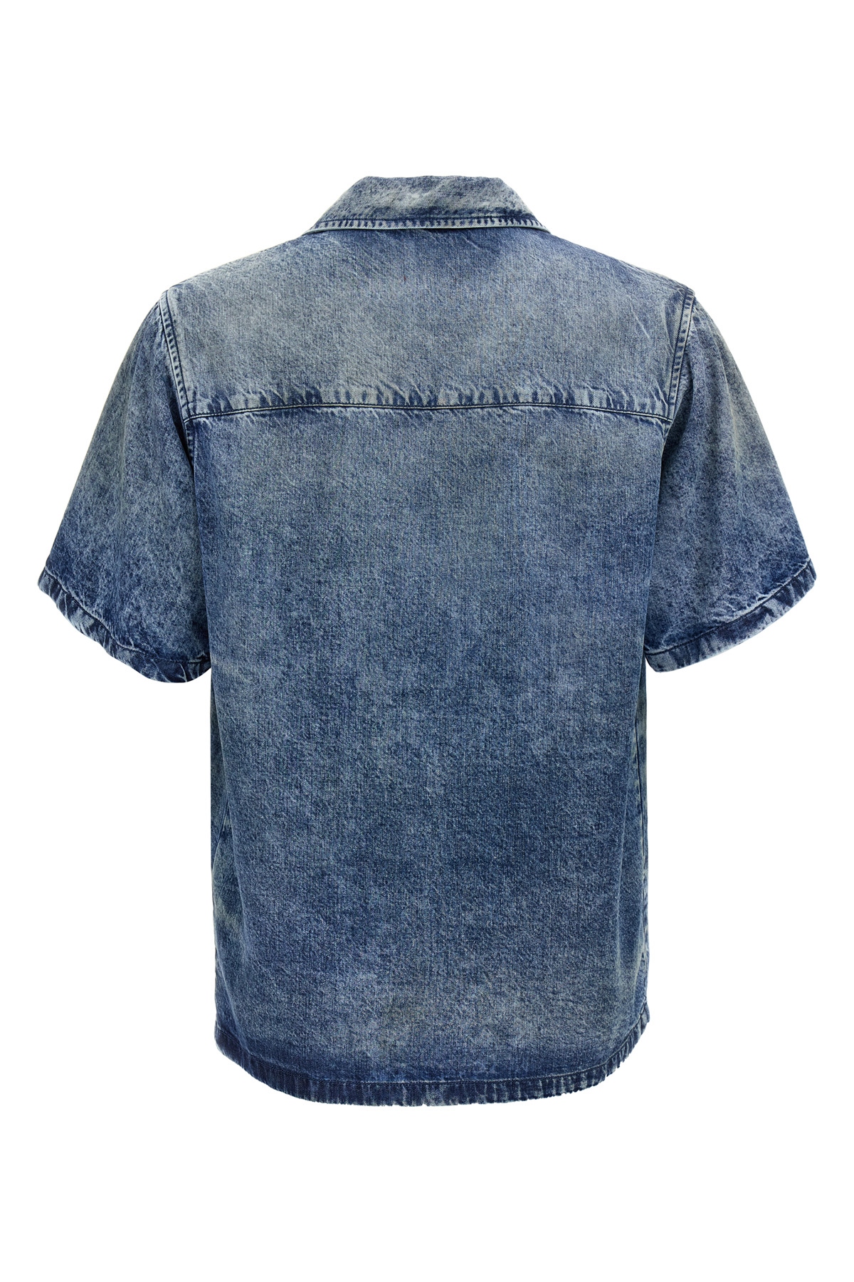 Tencel distressed denim D-Nabil-Fsg shirt with bowling style with front logo embroidery, front snap button closure, and short sleeves.
