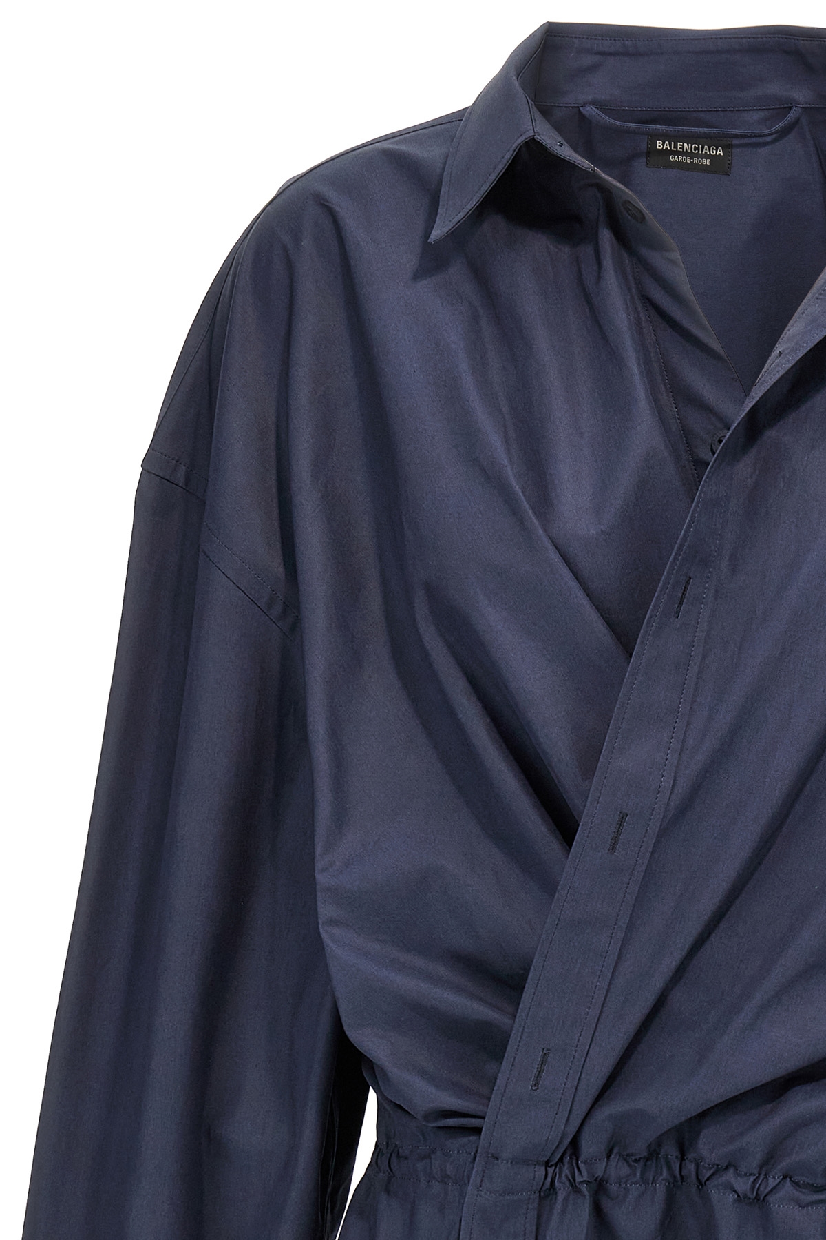 'Stile Camicia Mini' dress in washed and discolored cotton poplin with asymmetric front button closure, adjustable drawstring at the waist, long sleeves with dropped shoulder and cuff.