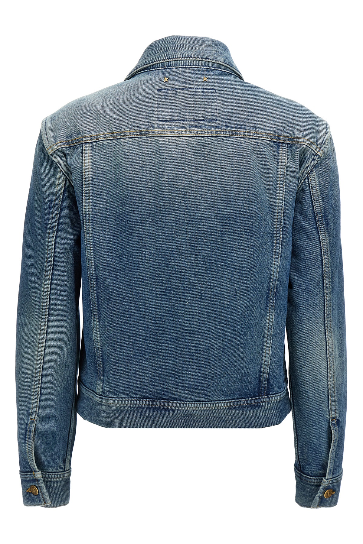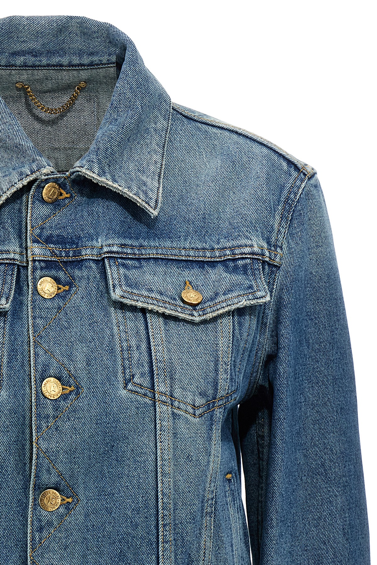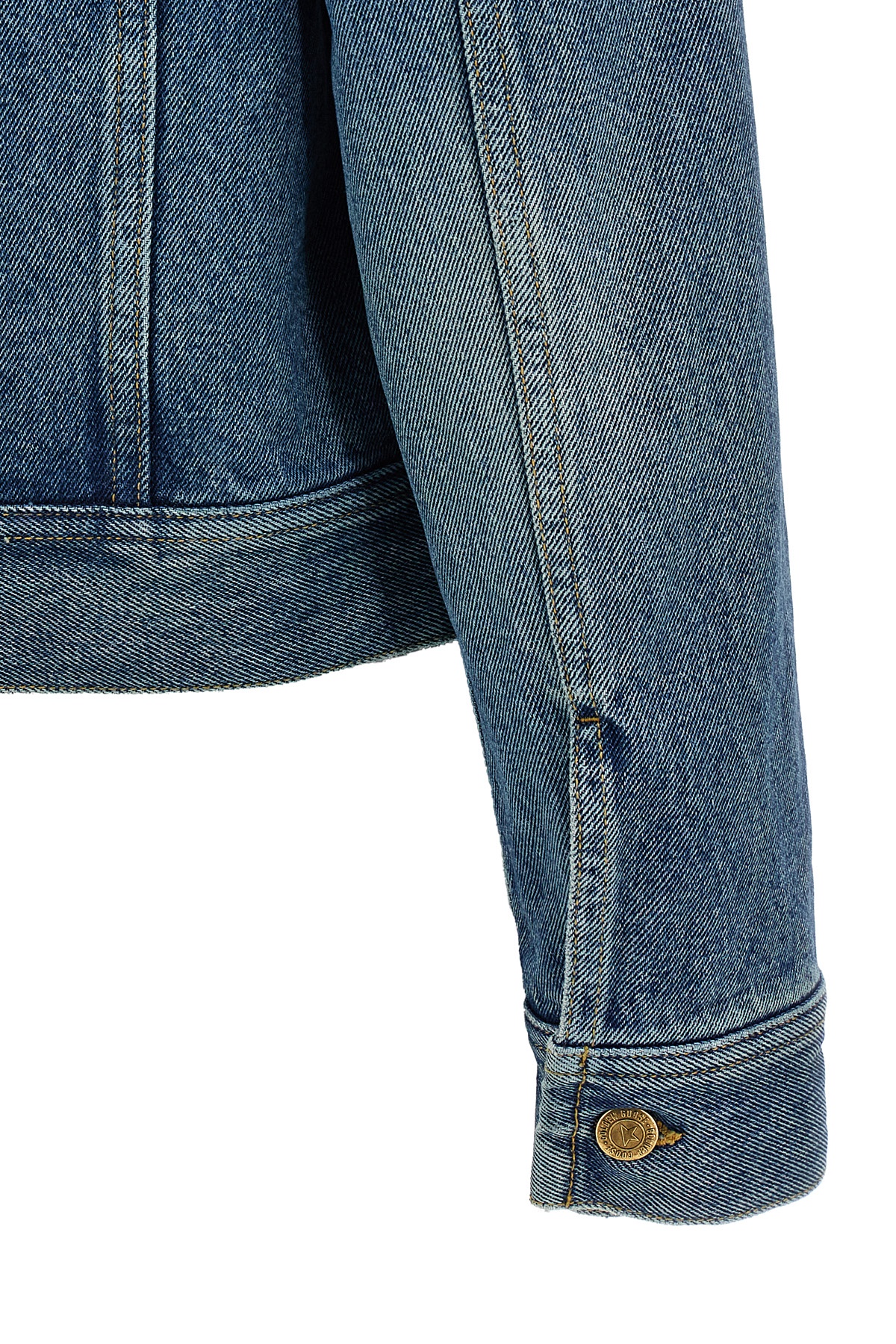 Delave cotton denim jacket with front button closure, long cuffed sleeves, pockets.