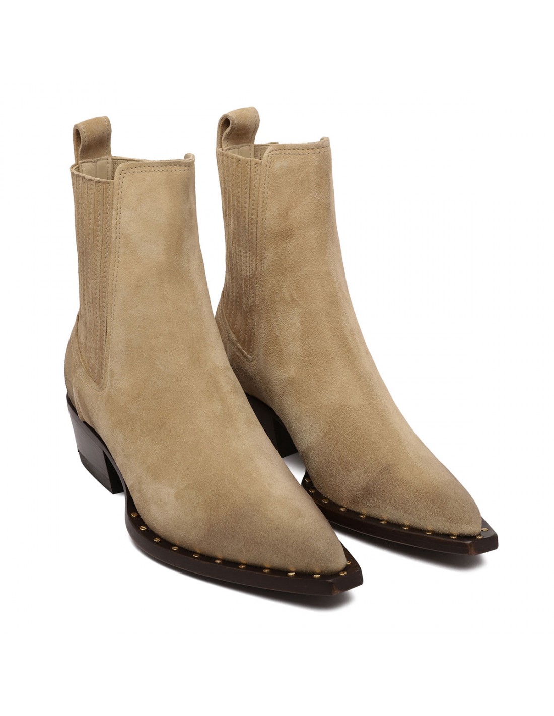 Sand waxed suede Debbie Beatles boots from Golden Goose featuring stretch insert on the side, tone-on-tone stitching, pointed toe, slim fit, metal stud detail, gold-colored metal plaque engraved with the logo on heel, leather loop on heel, leather lining and sole.
