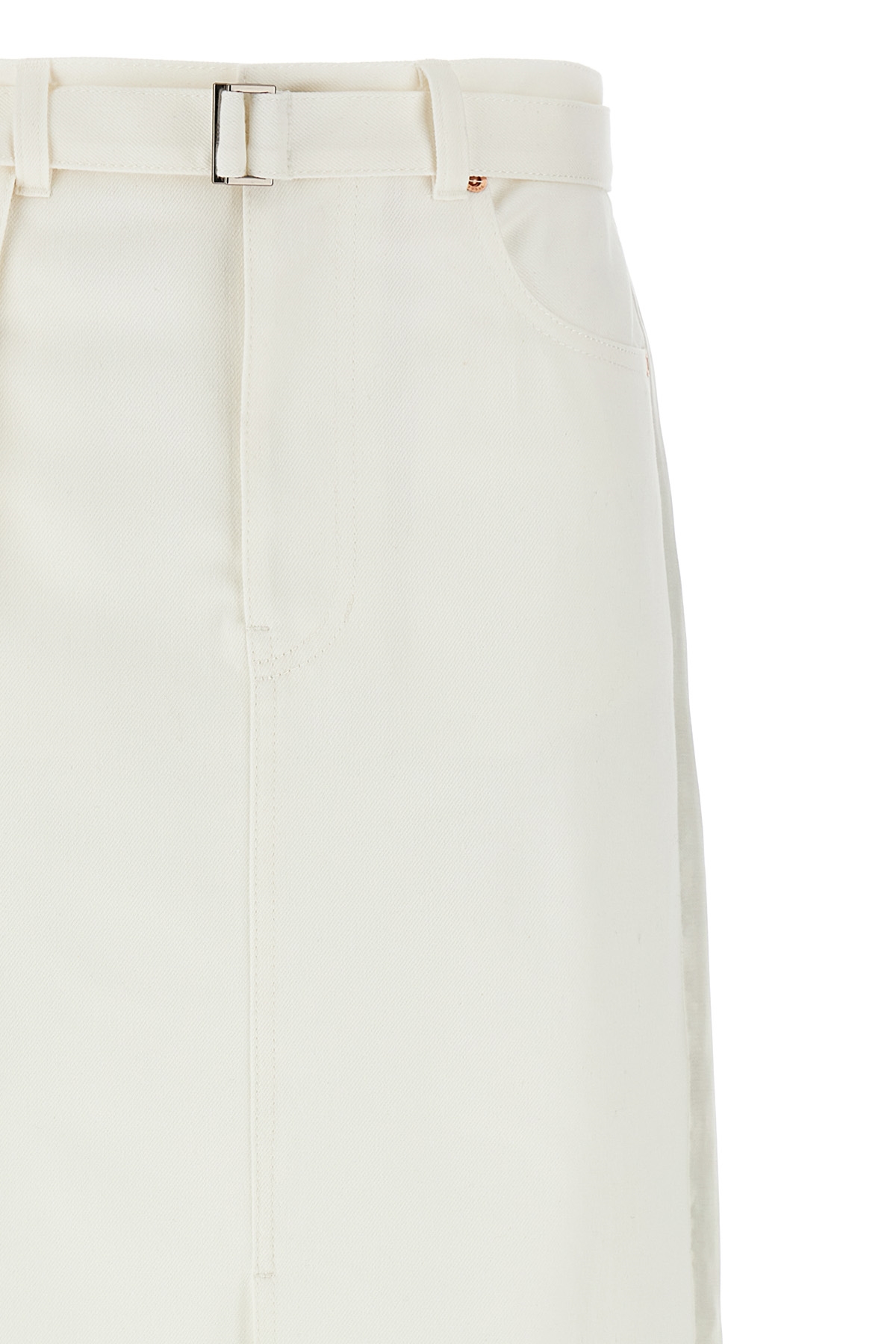 Garment-dyed cotton denim longuette skirt with pleated cupro back insert, zip and button closure, pockets, front split, removable belt.