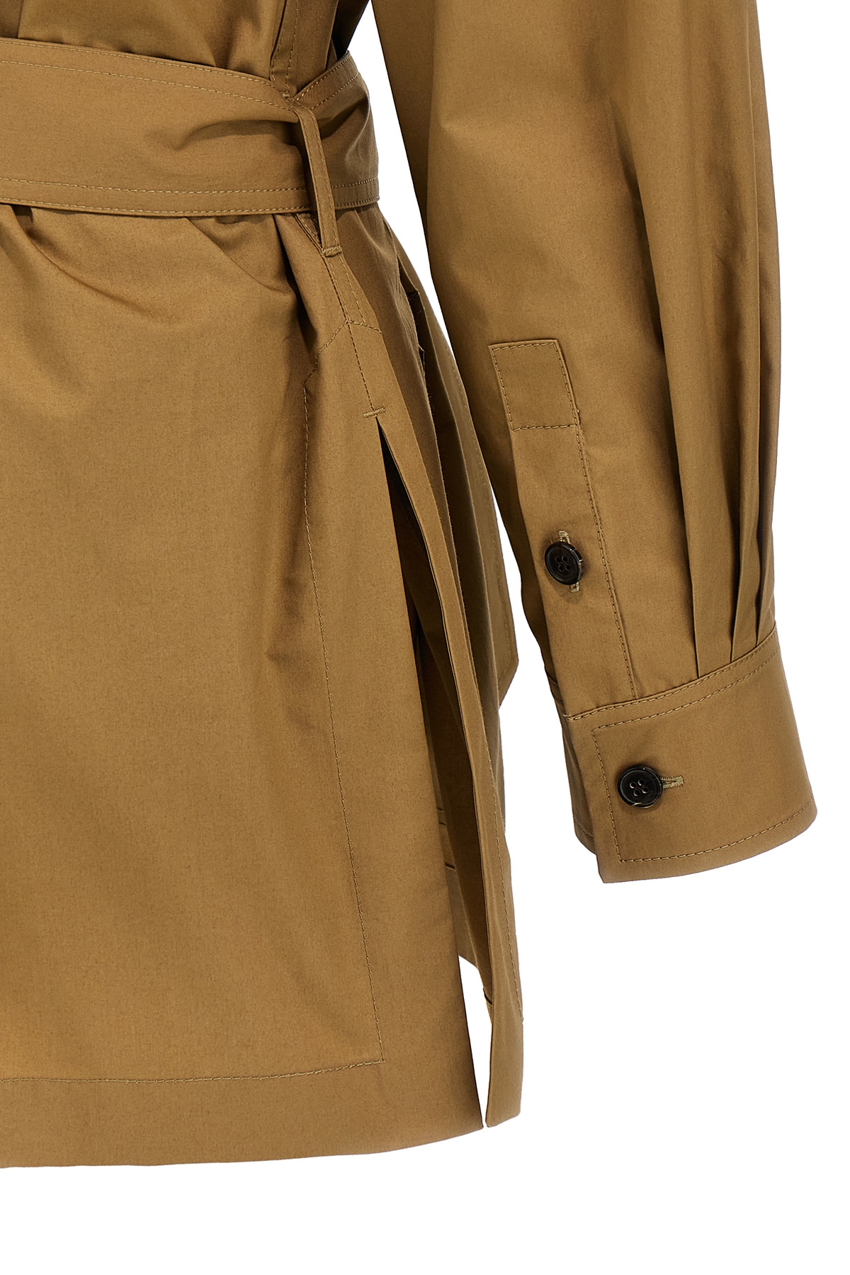 Cotton tunic with high neck, front button closure, pockets, long sleeves with cuffs and dropped shoulders, removable belt.