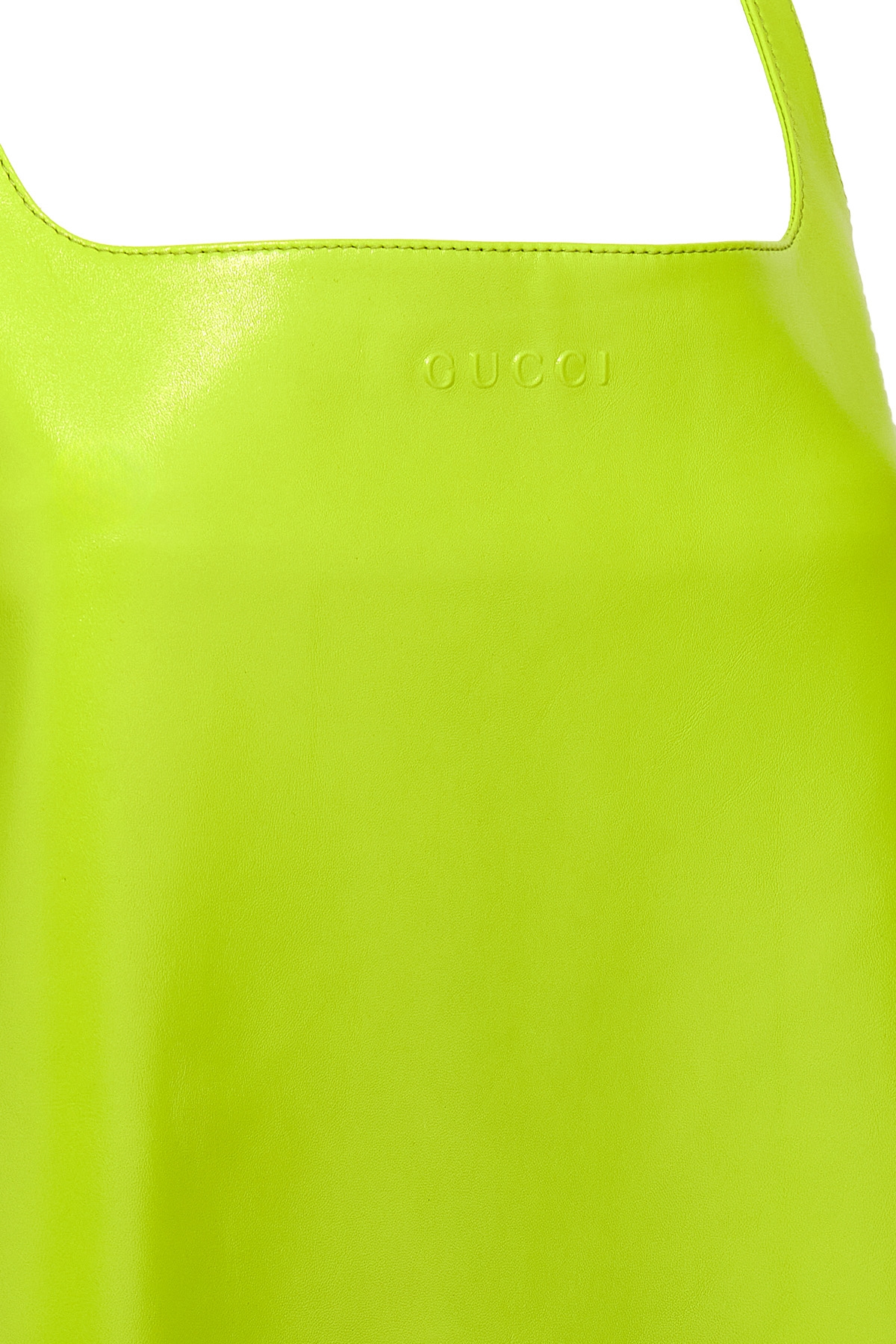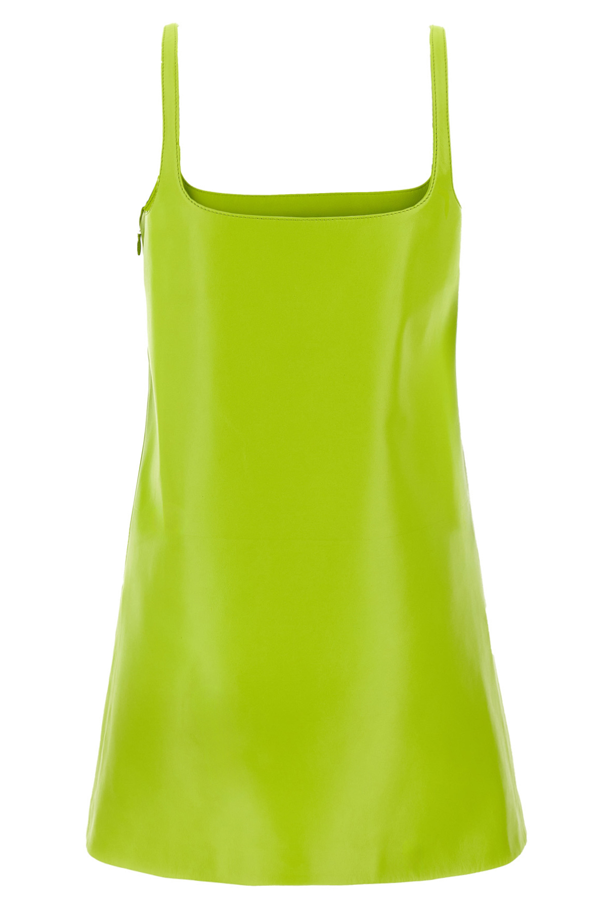 Shiny leather mini dress, embossed logo on the front, sleeveless with thin straps, side zip closure, viscose lining.