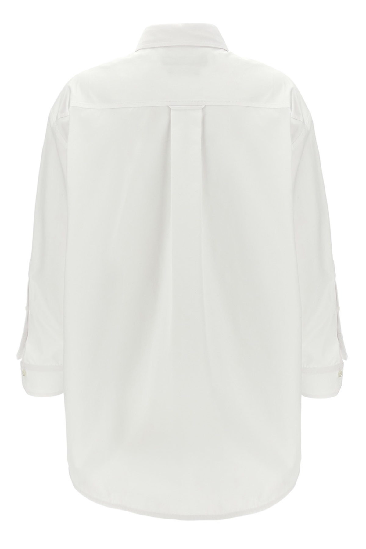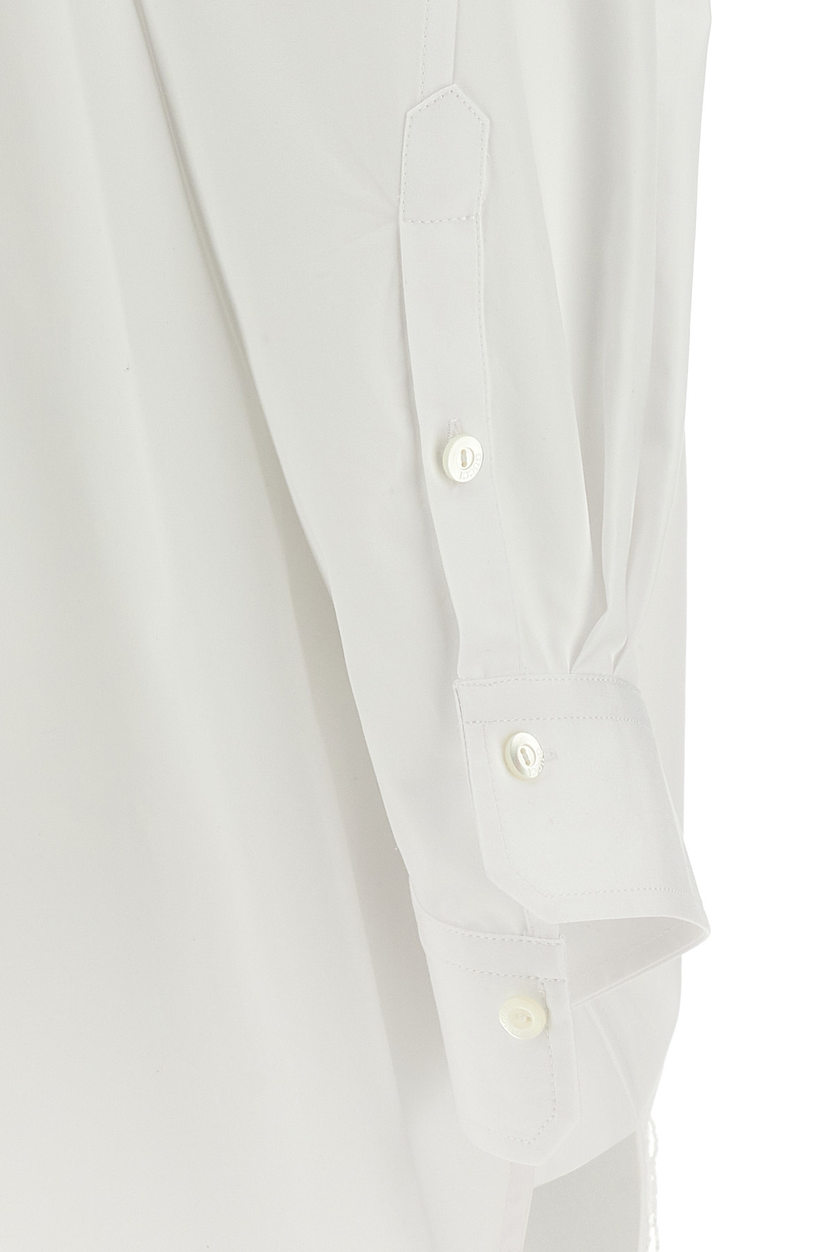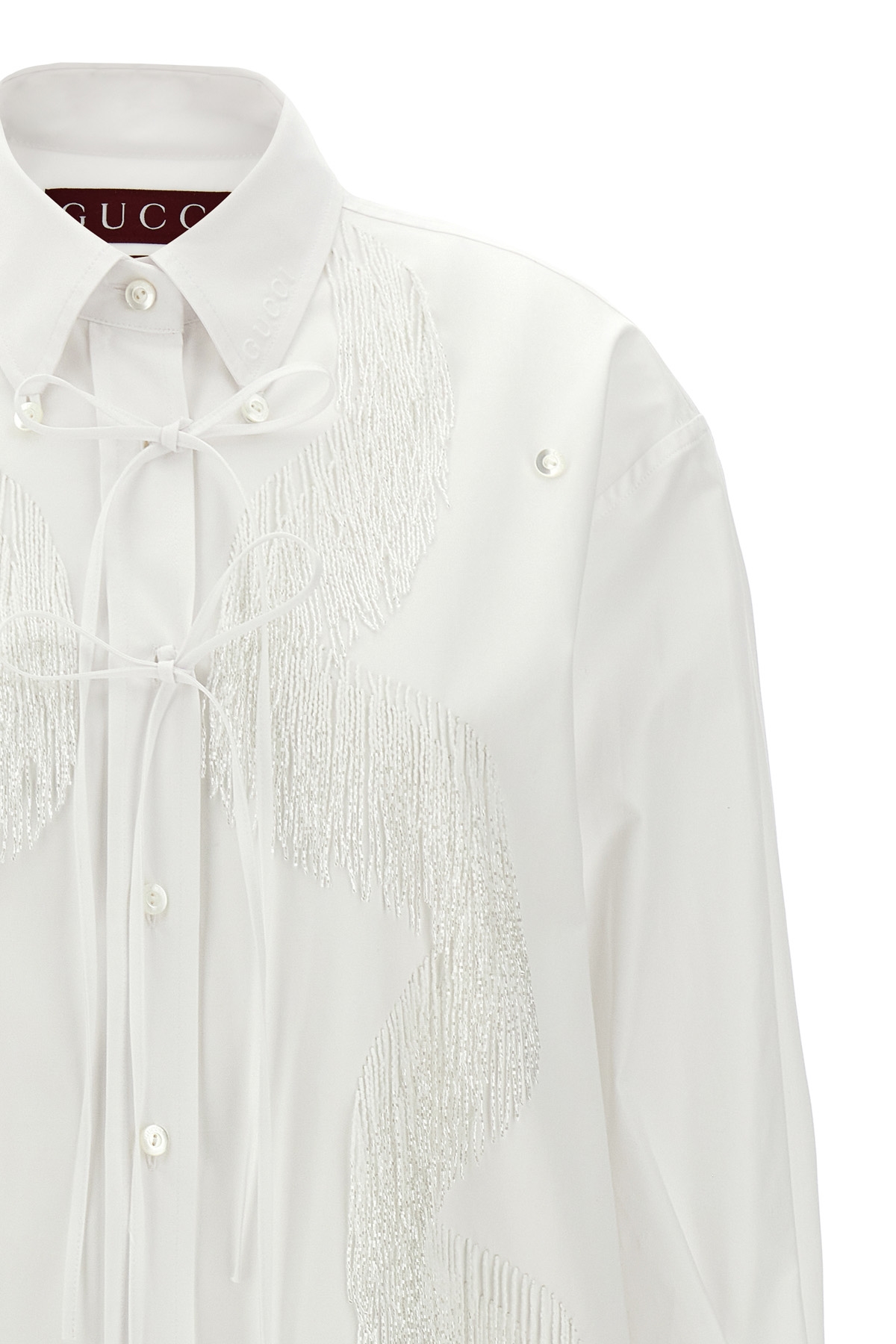 Cotton poplin shirt with front bead fringes, front button closure, embossed embossed logo on the collar, adjustable button-down style, long cuffed sleeves.