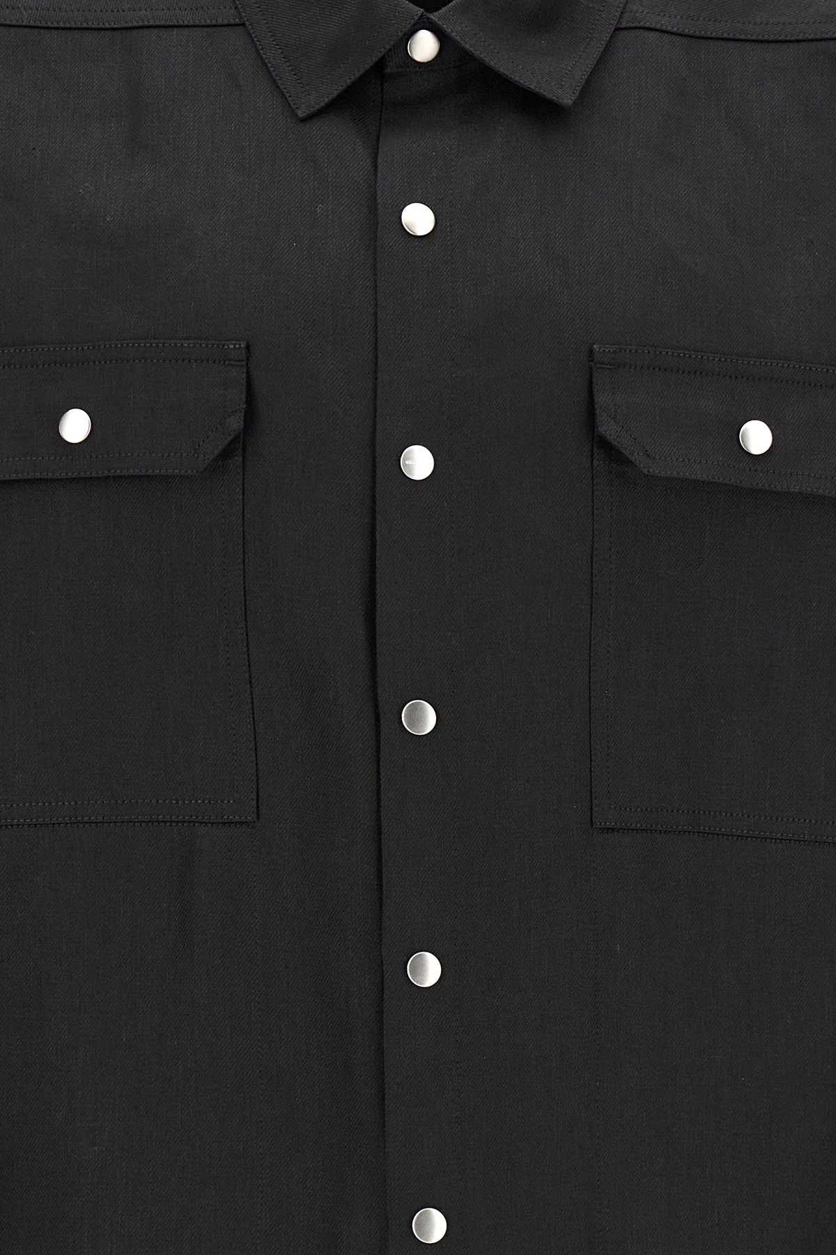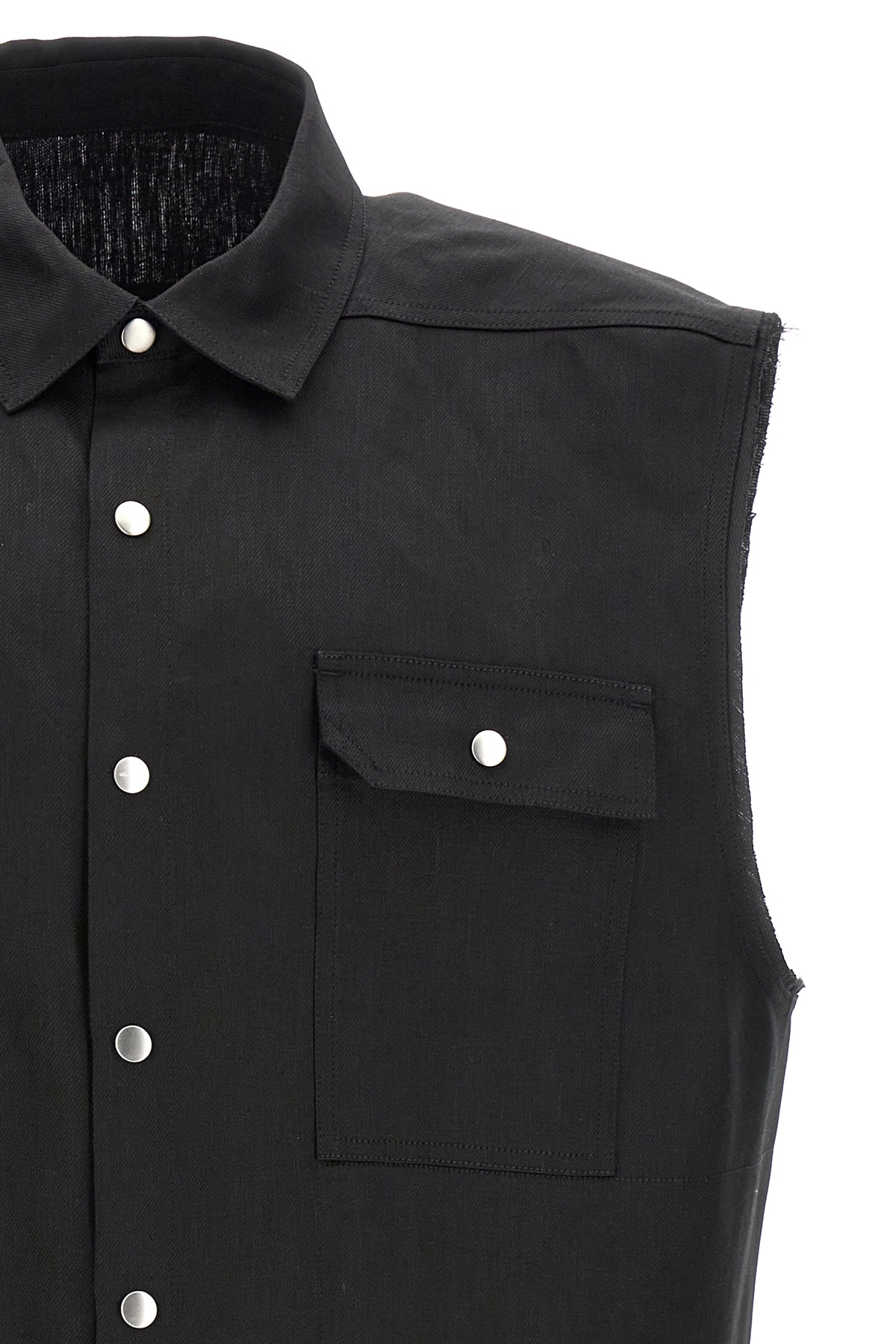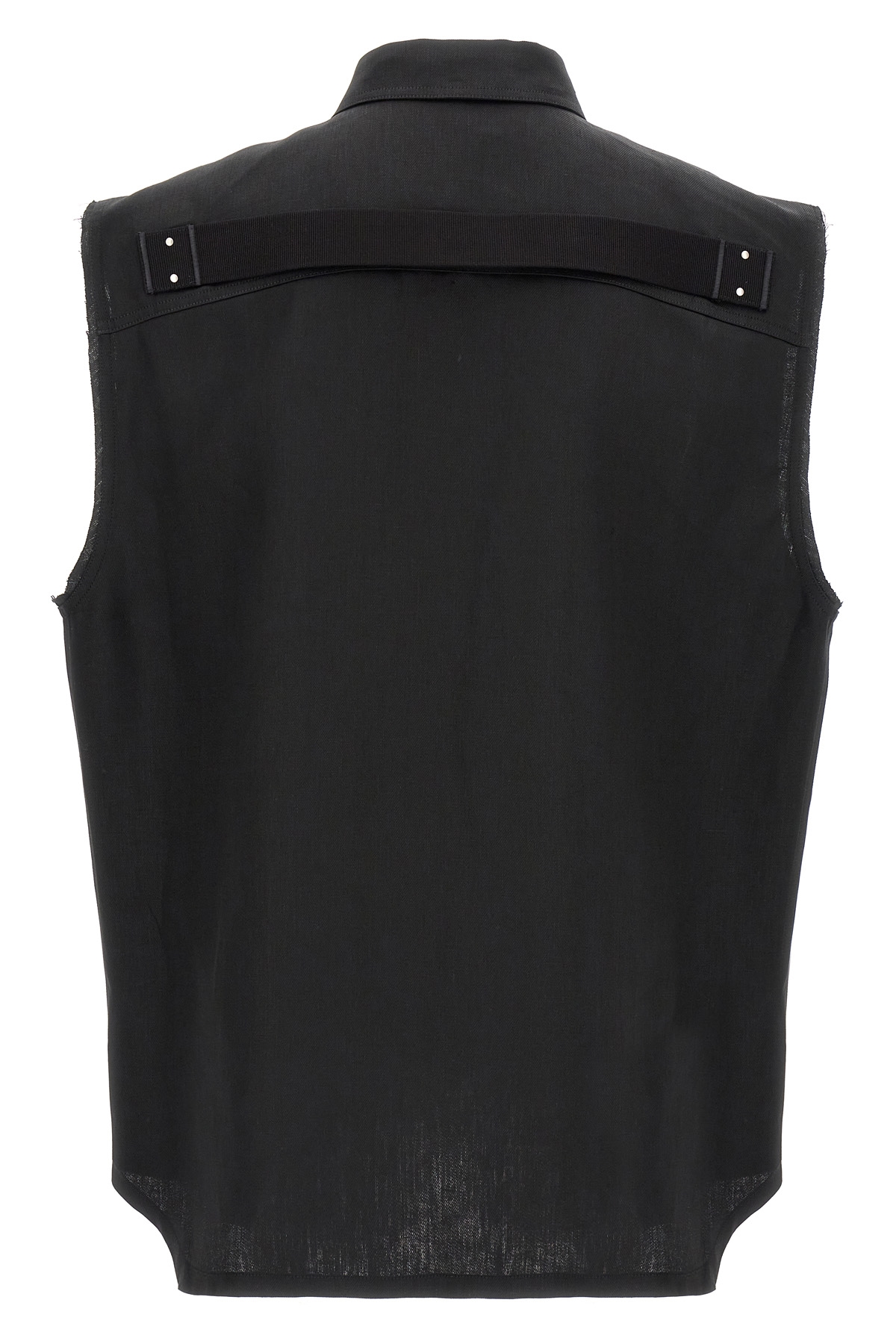 'Jumbo SL Outershirt' linen twill shirt with semi-glossy medium weight, front snap button closure, pockets, sleeveless, cotton strap with rivets on the back rack.