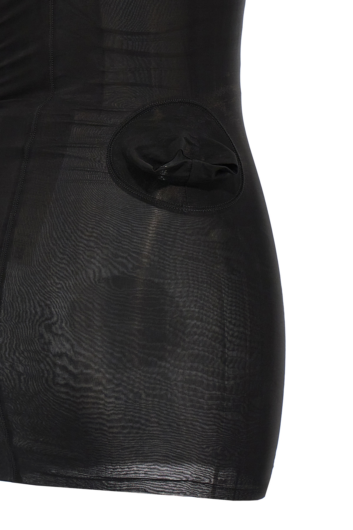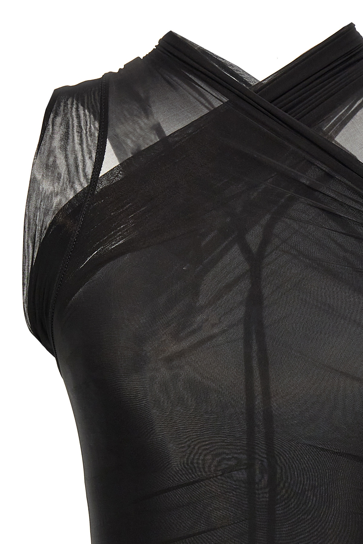 'Hollywood Banana' semi-transparent cupro stretch jersey top. It has a bottom layer with two round holes with ribbed edges and an outer layer that folds to create a crossed draping on the front and back neck. You can wear one shoulder or double.