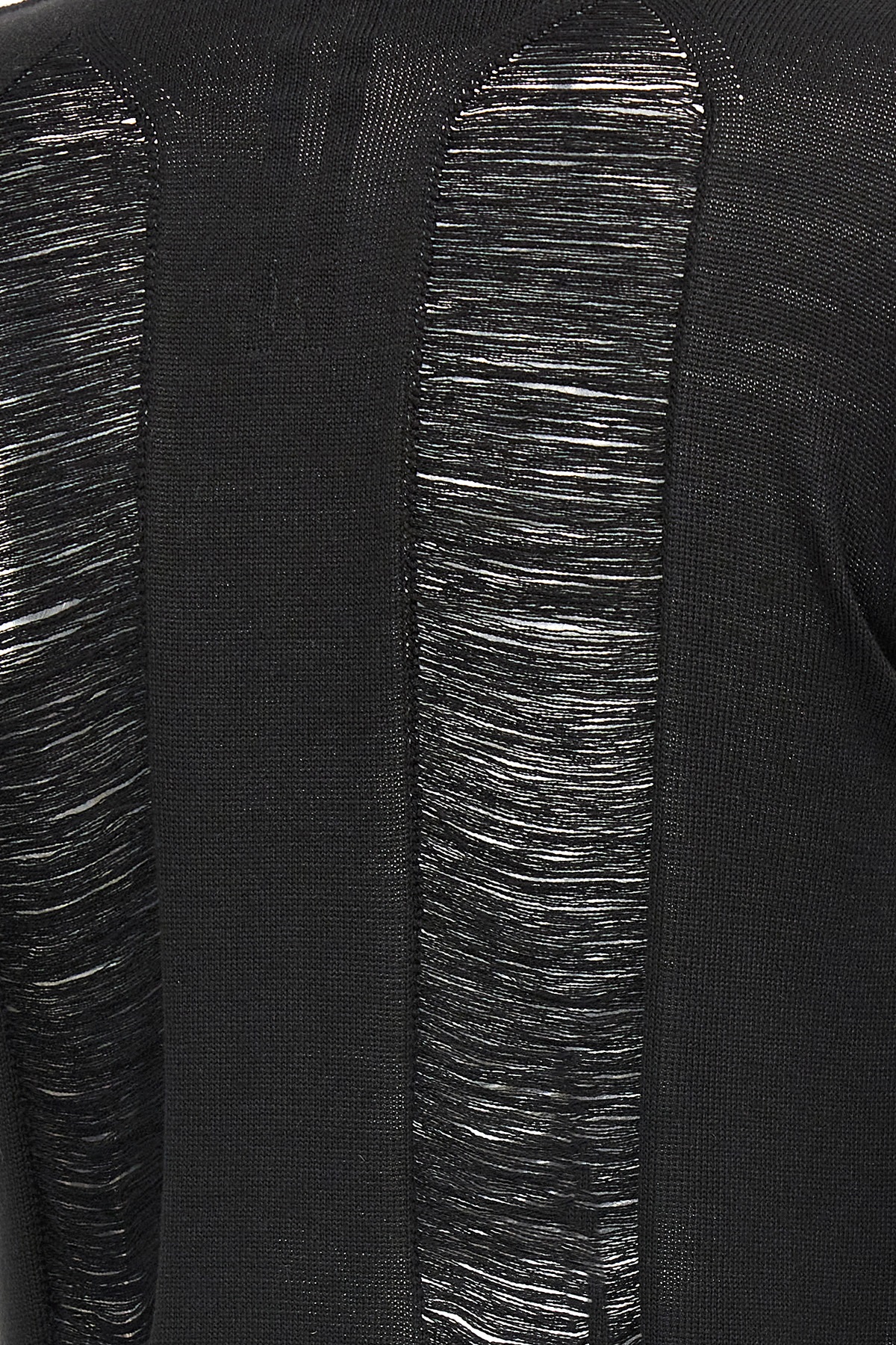 Tanja T' wool knit top with cut-out and frayed details on the front and back, asymmetrical style with side loops along the sides, boat neck.
