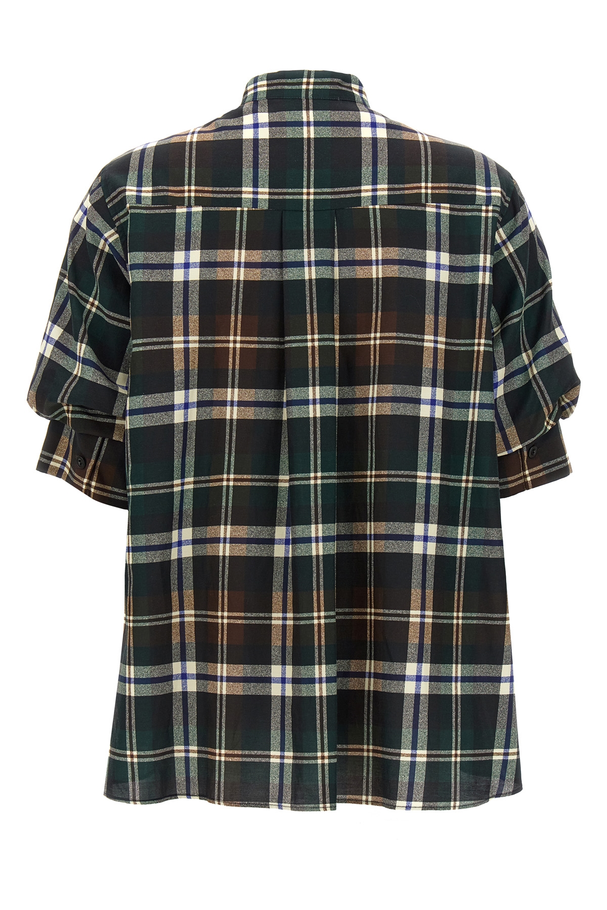 Check print cotton blend shirt with solid knit front panel, crew neck, short balloon sleeves with cuffs.