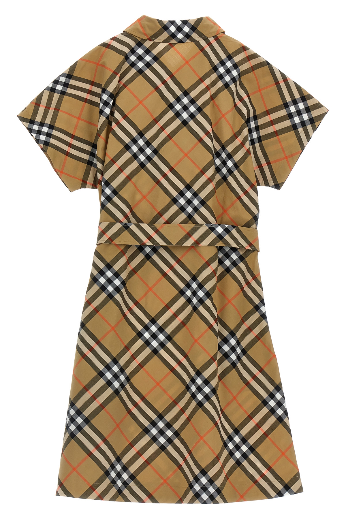 KIDS Check print cotton shirt dress, front button closure, belt at the waist, and short sleeves.